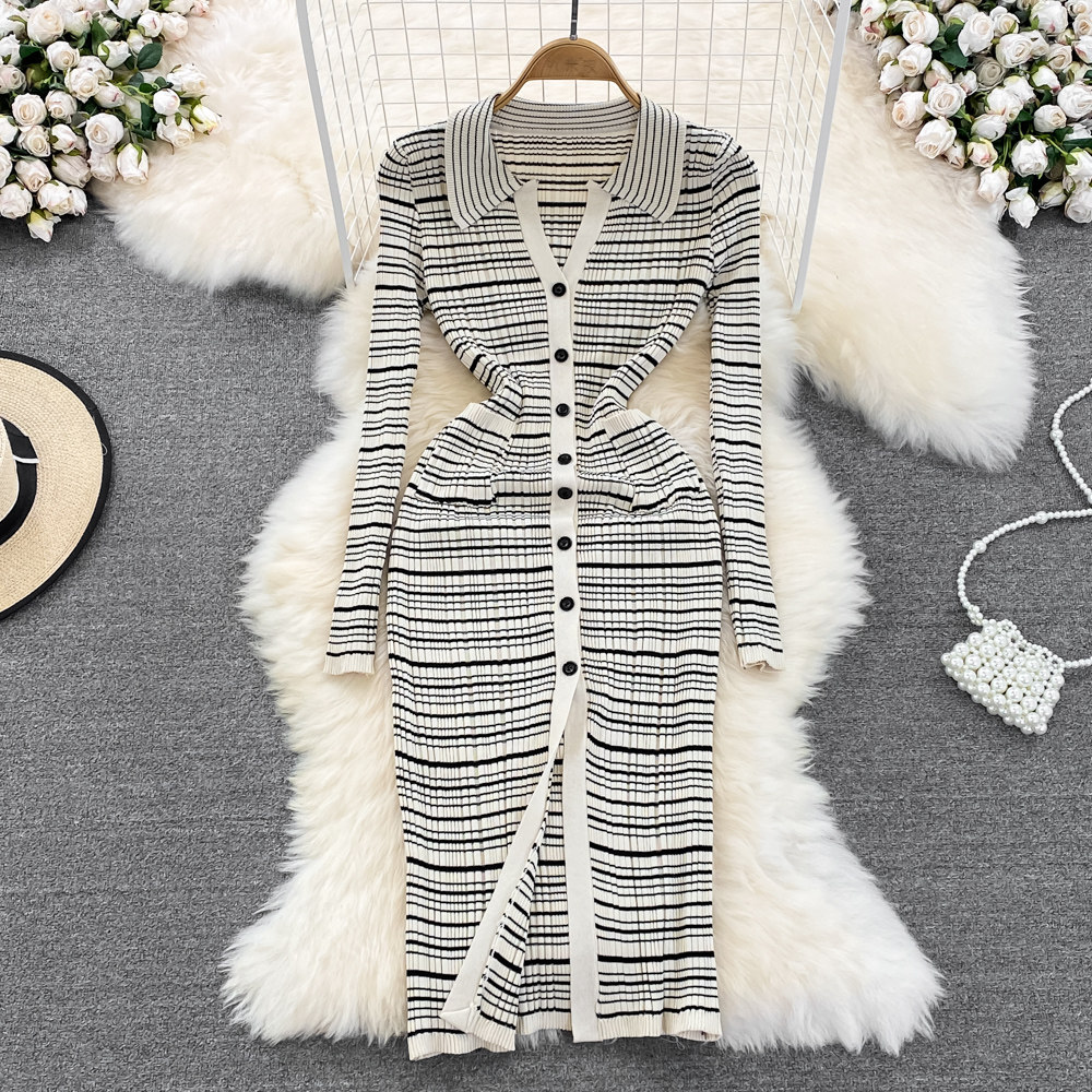 Осенняя длинная трикотажная булавка, платье, в корейском стиле, воротник поло, средней длины