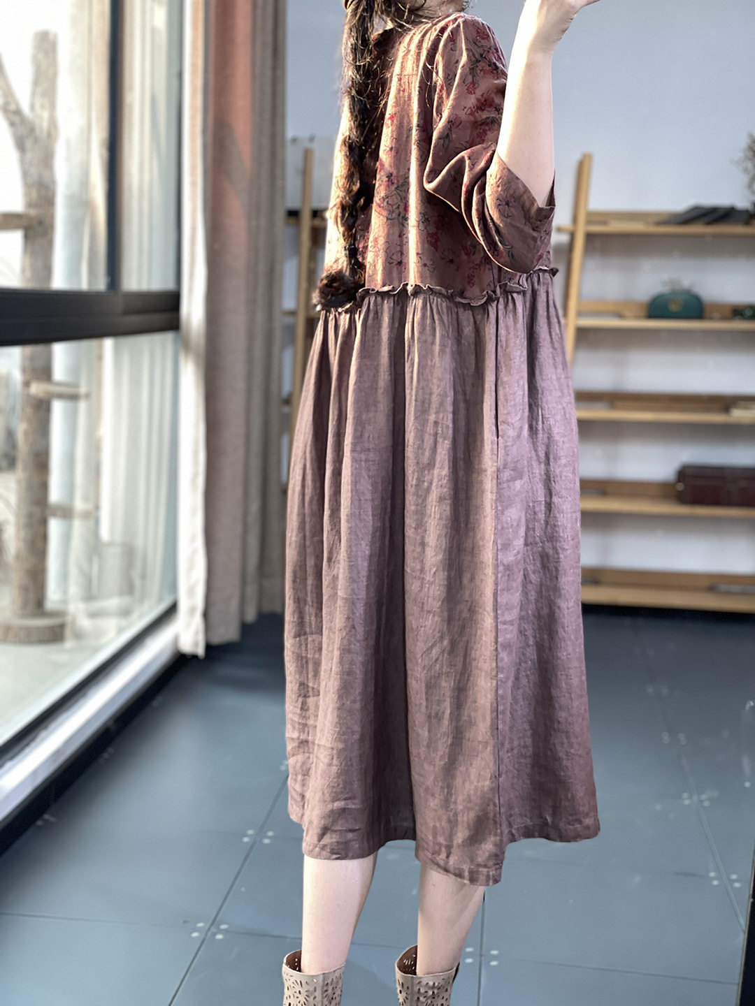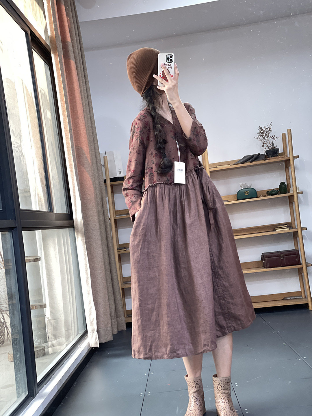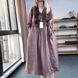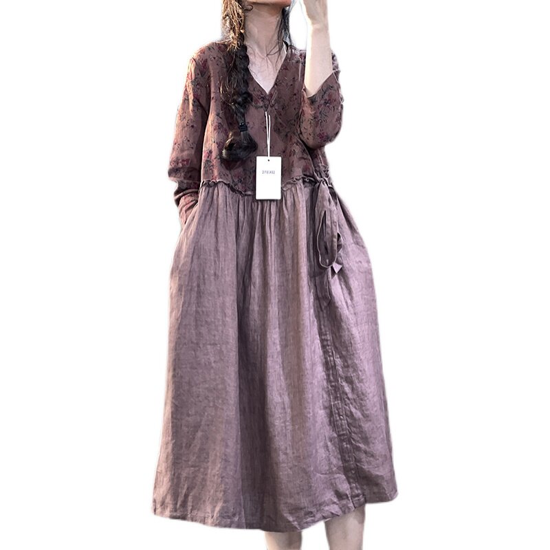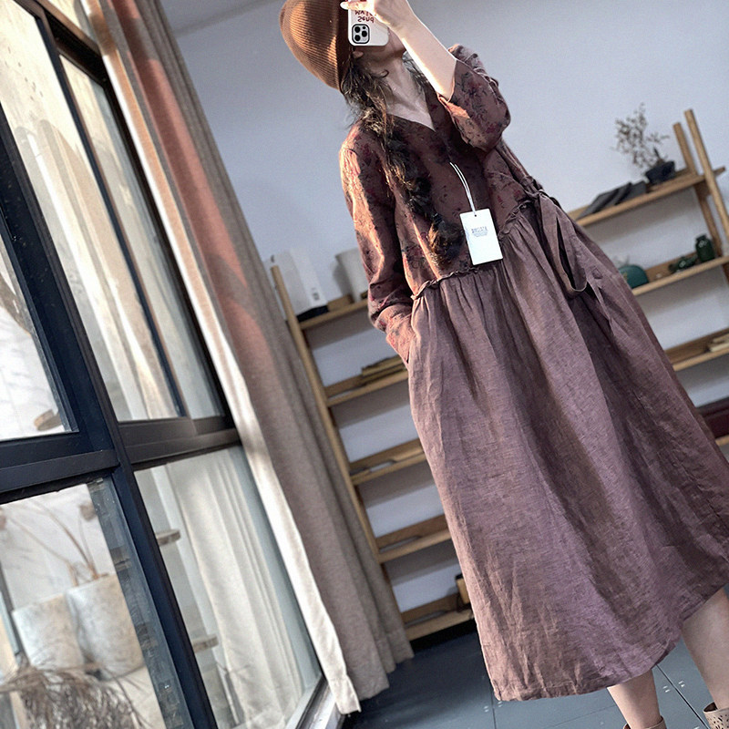 Брендовый южнокорейский товар, платье, длинная юбка, цветочный принт, из хлопка и льна