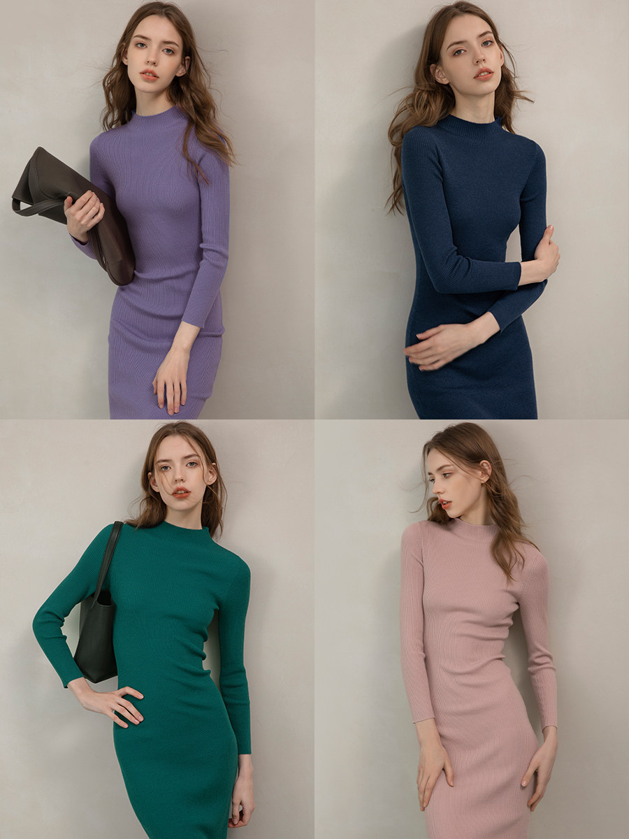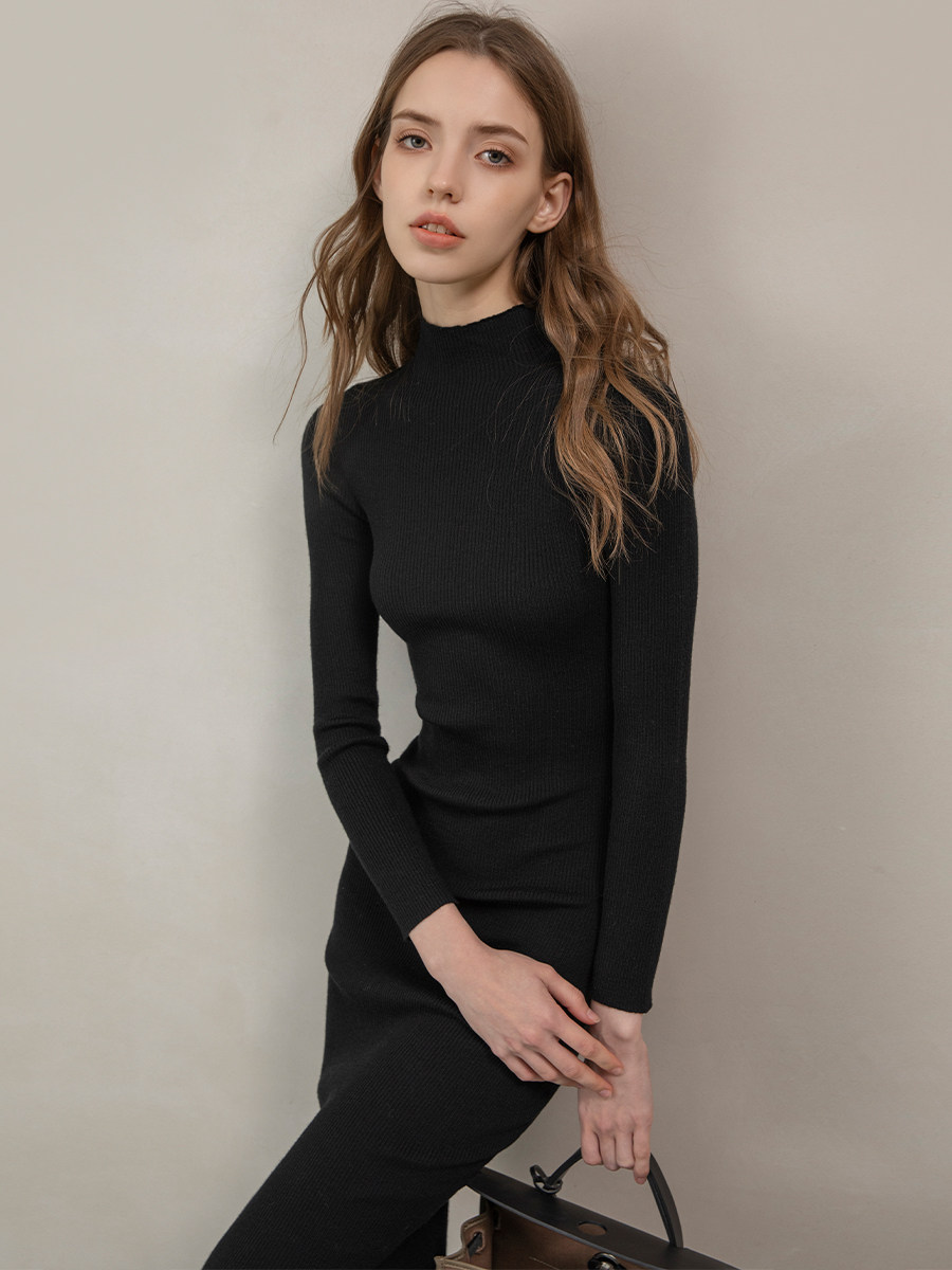 Mix Selection Трикотажное демисезонное шерстяное платье, высокий воротник, французский стиль
