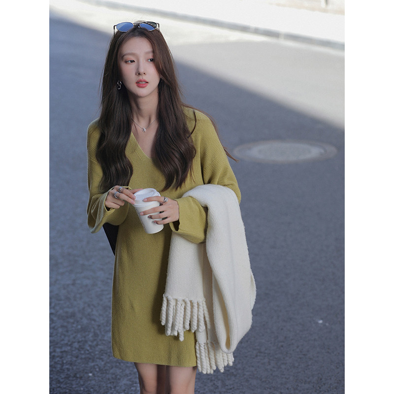 Трикотажный зимний свитер, платье, свободный крой, V-образный вырез