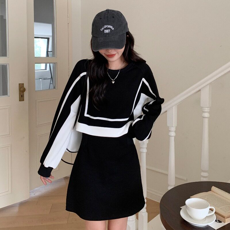Небольшой дизайнерский комплект, приталенное платье, мини-юбка, большой размер, осенний, в корейском стиле, тренд сезона, А-силуэт