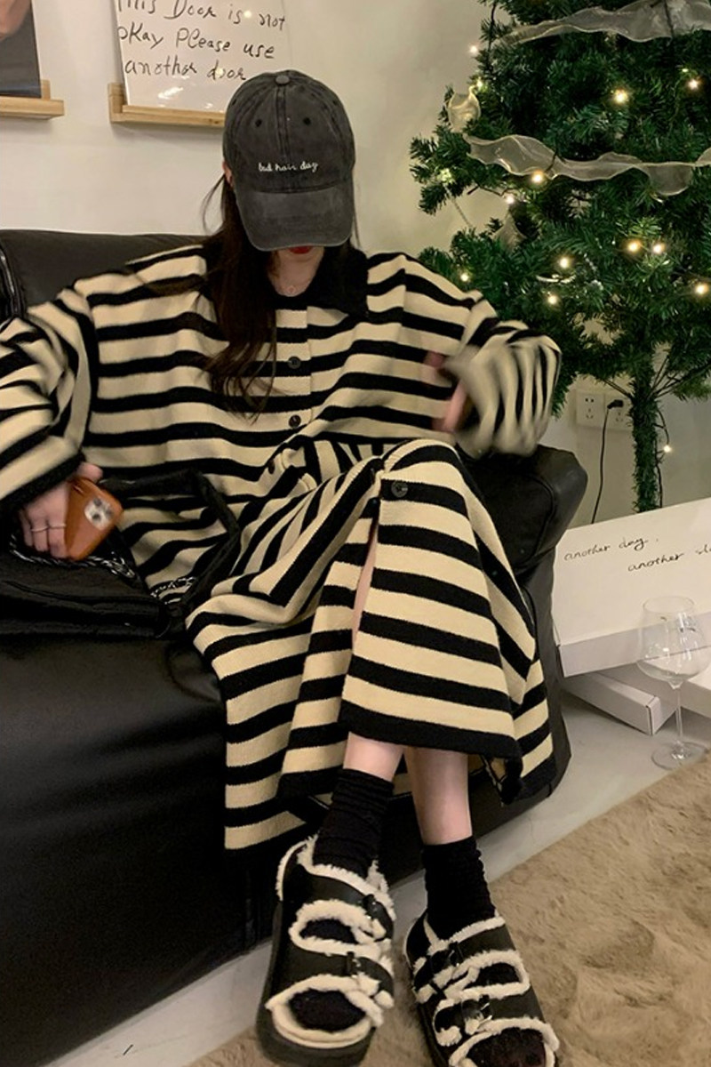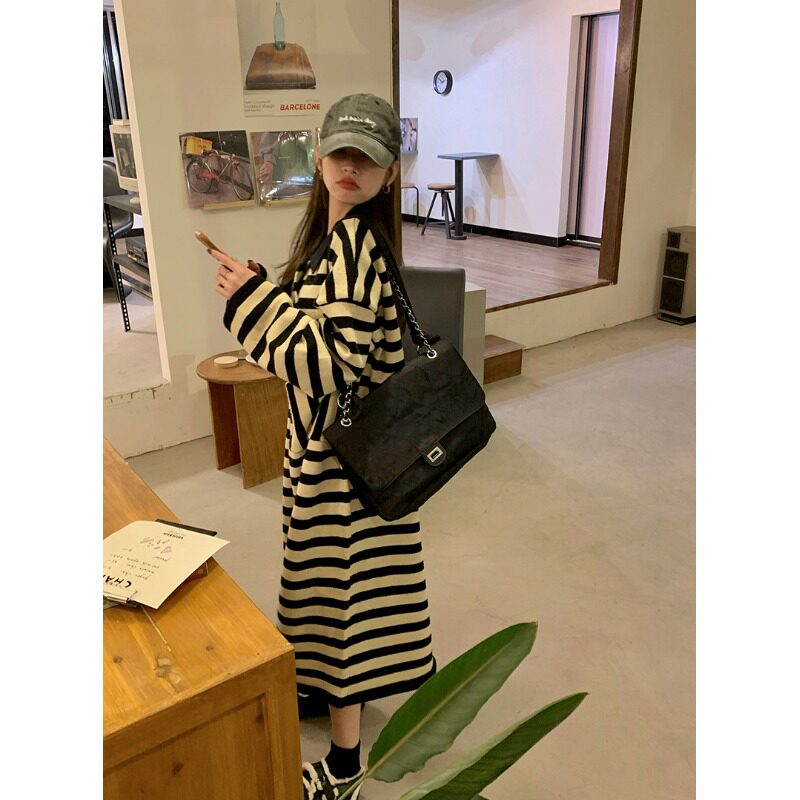 Свитер, ретро длинное трикотажное платье, воротник поло, свободный крой, средней длины