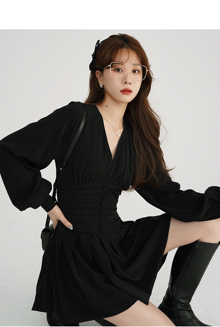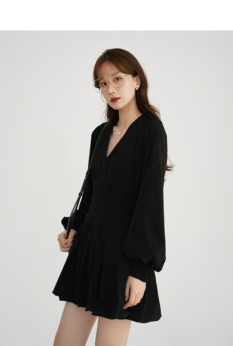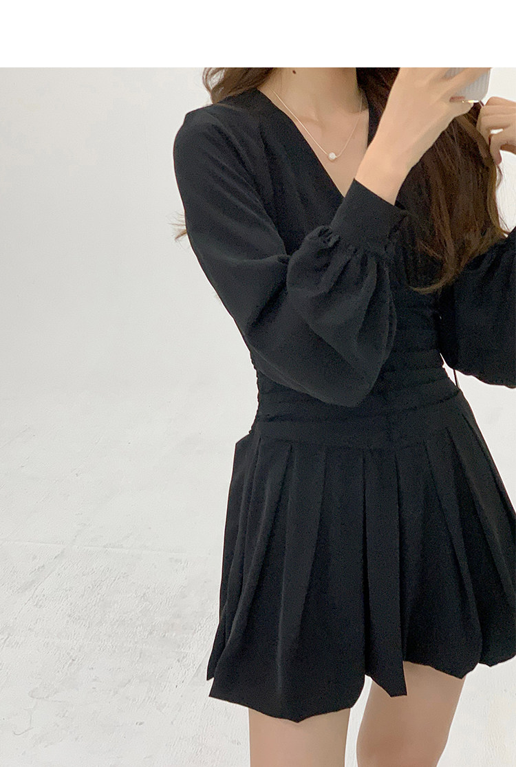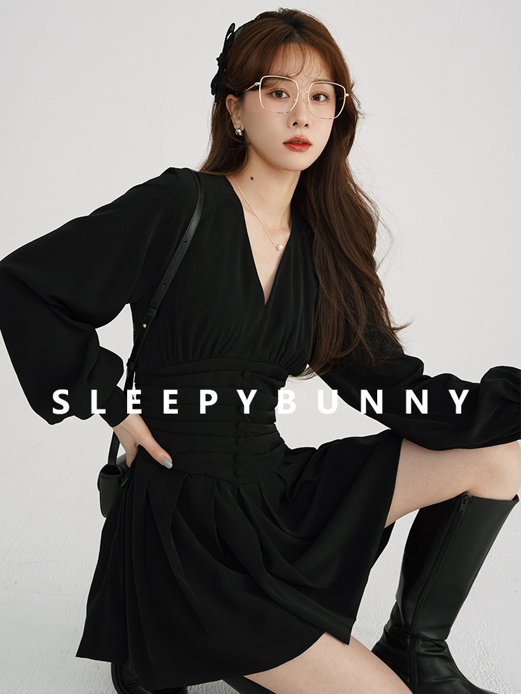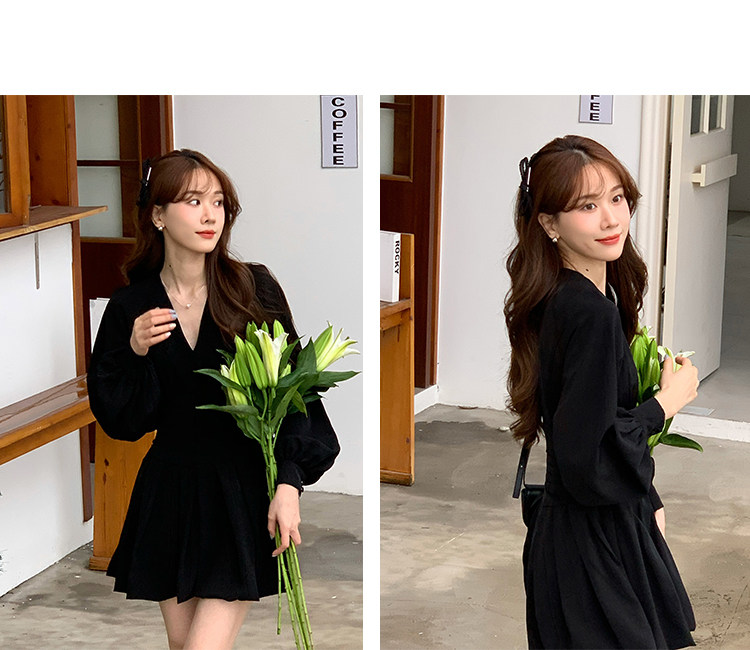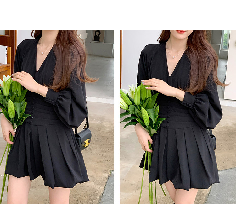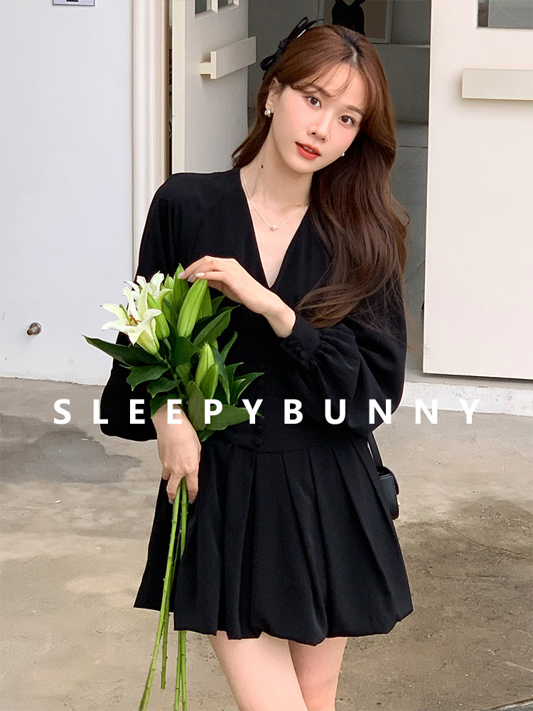 瞌睡兔 Шифоновое платье, лонгслив, черная мини-юбка, фонарь, V-образный вырез