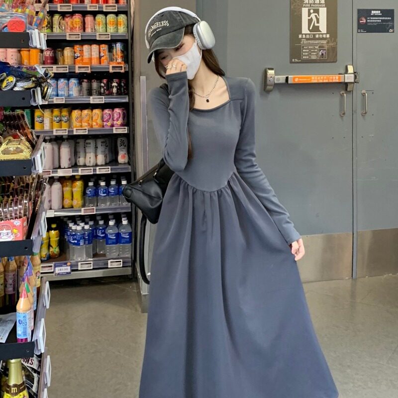 Лонгслив, осеннее платье, дизайнерский приталенный корсет, длинная длинная юбка, квадратный вырез, А-силуэт