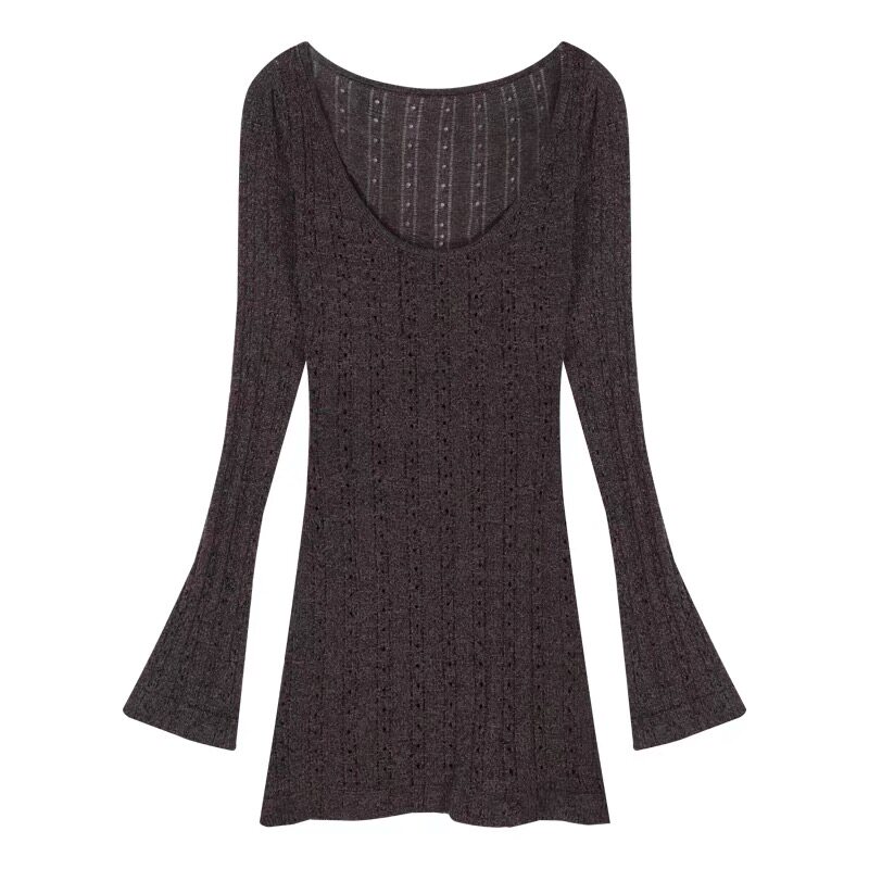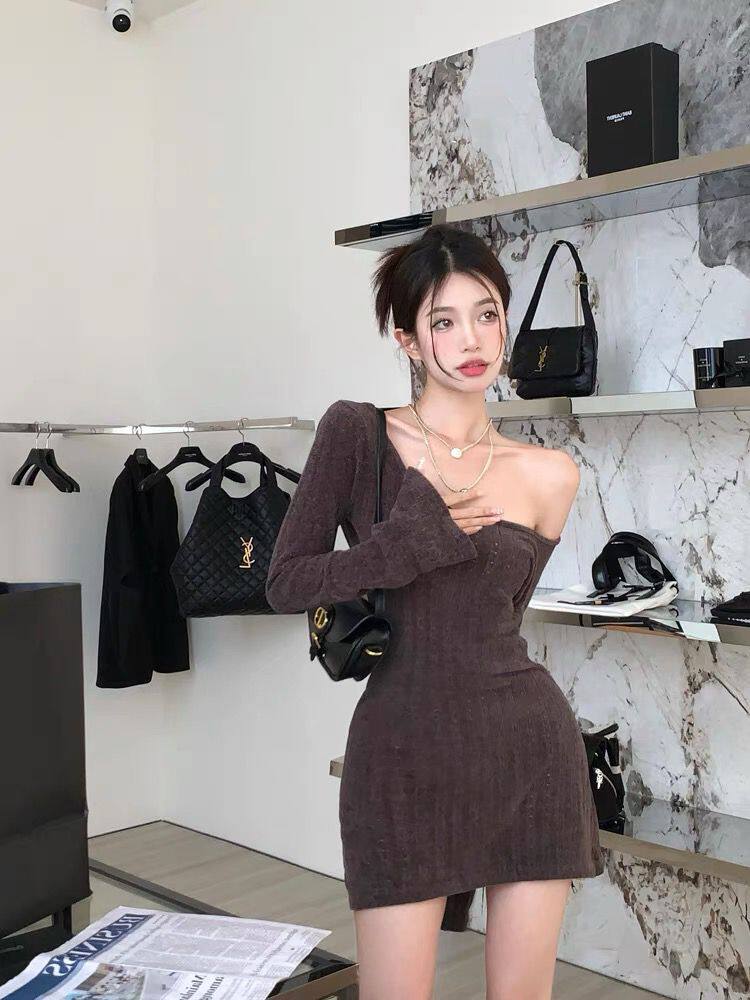 Демисезонный лонгслив, платье, базовая юбка, открытые плечи и длинный рукав, коллекция 2023, европейский стиль, французский стиль, с акцентом на бедрах