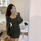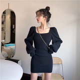Демисезонное короткое трикотажное платье, квадратный вырез, коллекция 2022, подходит для подростков, с акцентом на бедрах