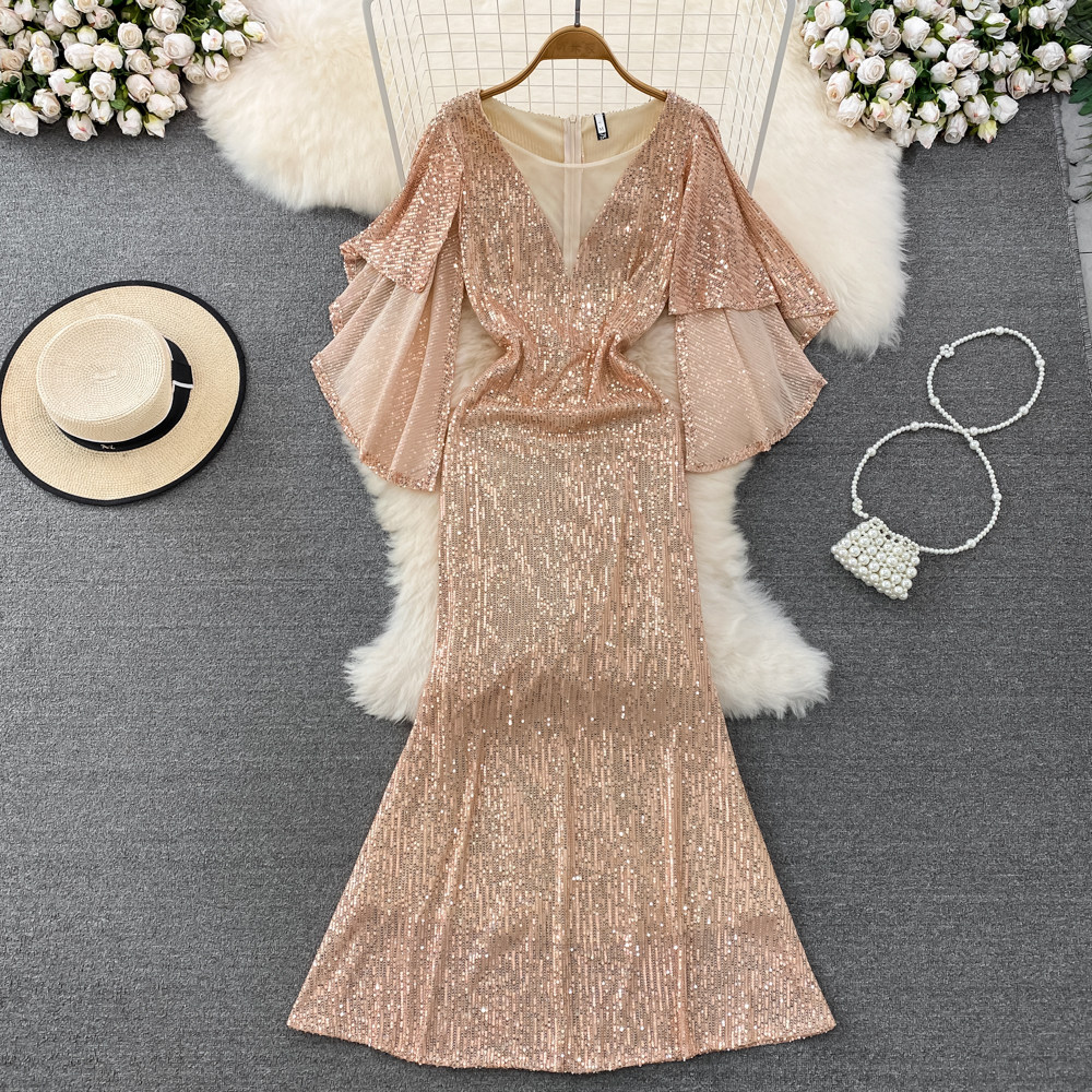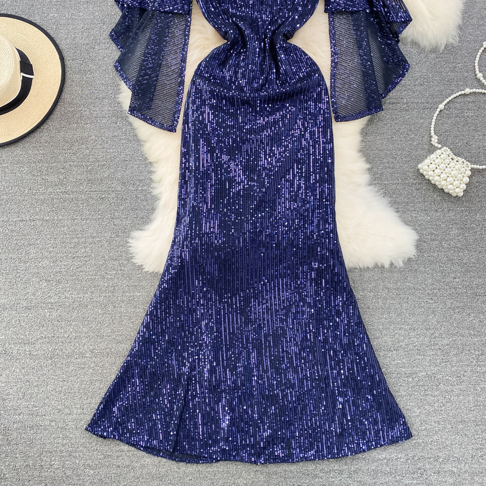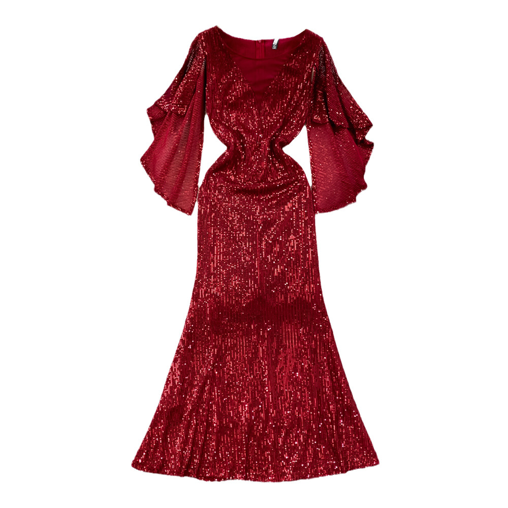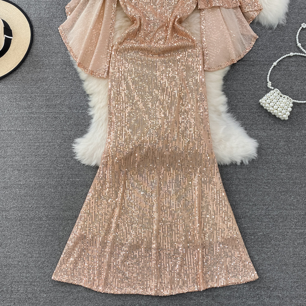 Элитное вечернее платье, длинная юбка, блестящие блестки для ногтей, приталенный корсет, А-силуэт, крой «рыбий хвост»