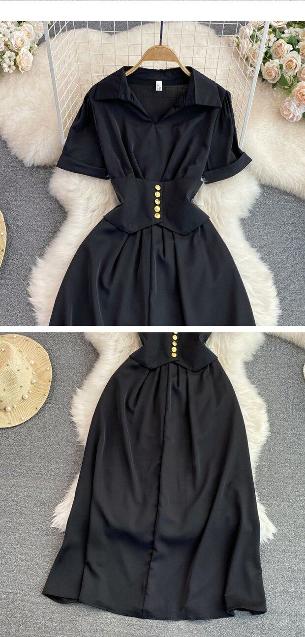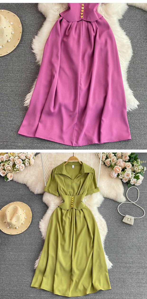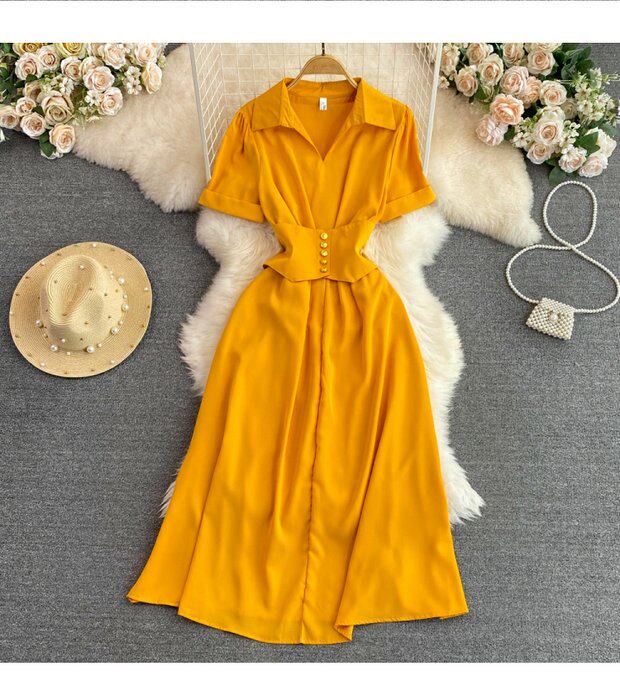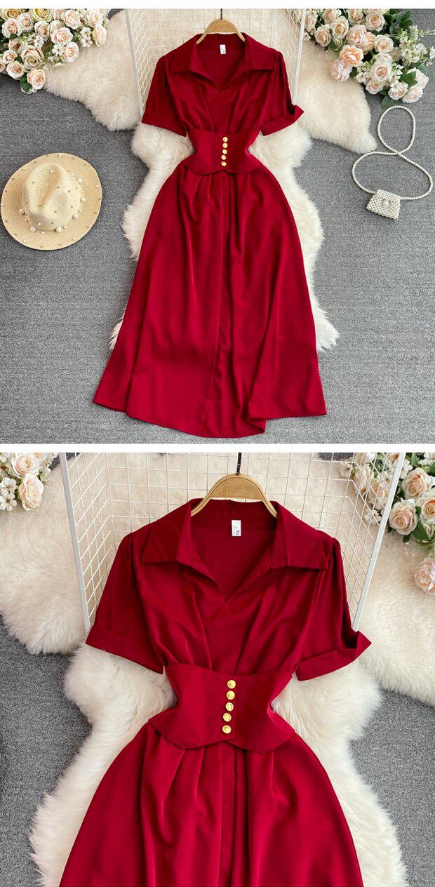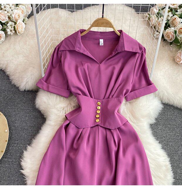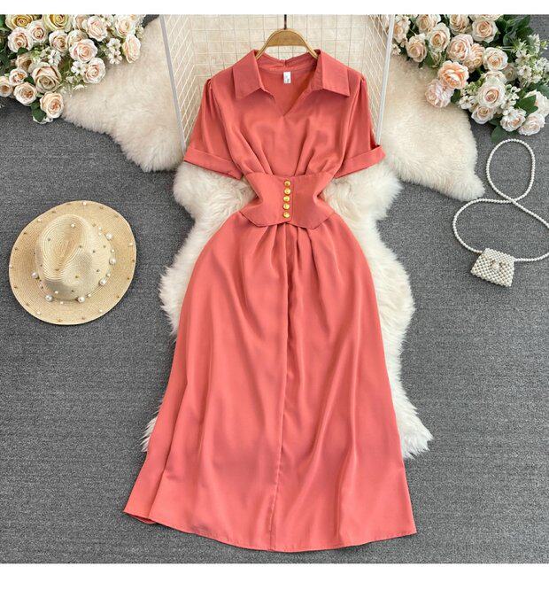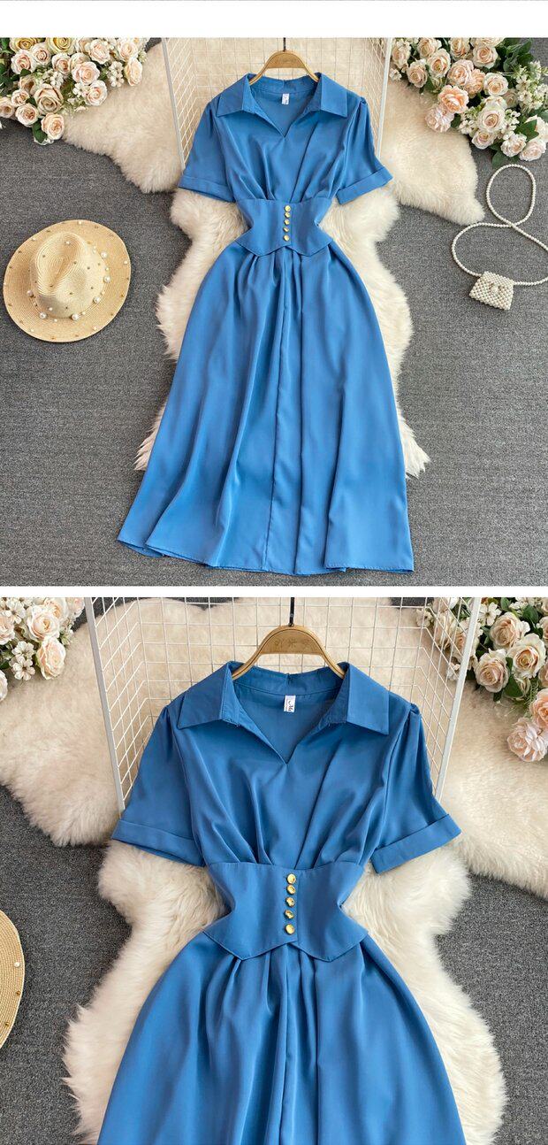 Рубашка, летняя модная юбка, приталенный корсет, платье, французский стиль, изысканный стиль, яркий броский стиль, воротник поло, короткий рукав, А-силуэт