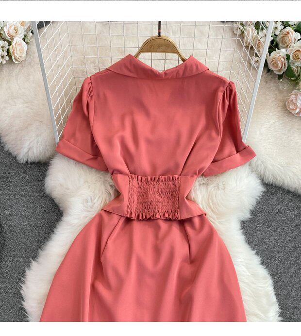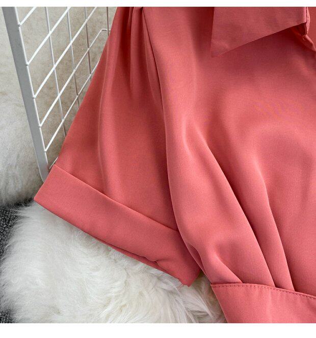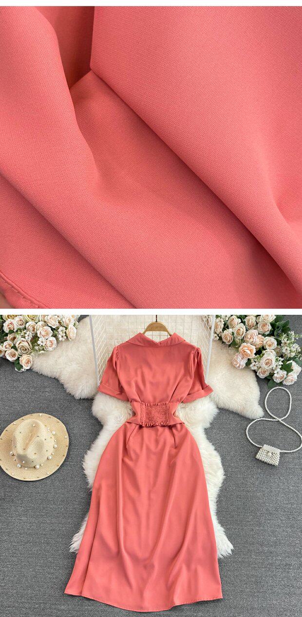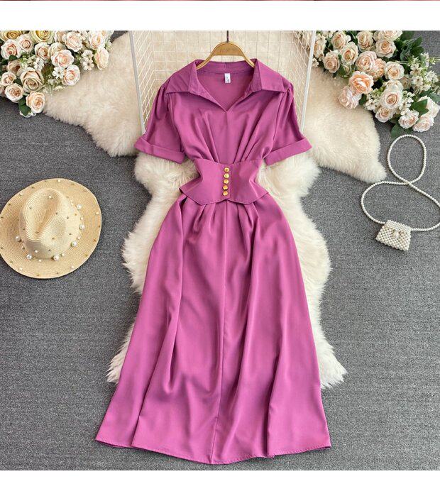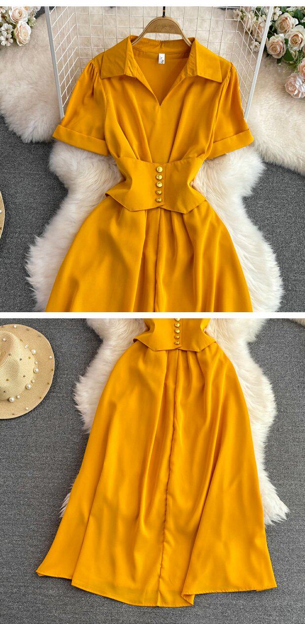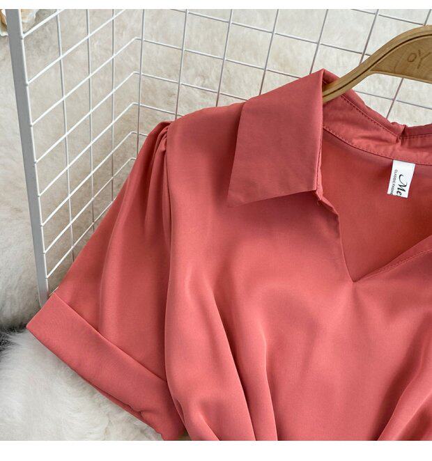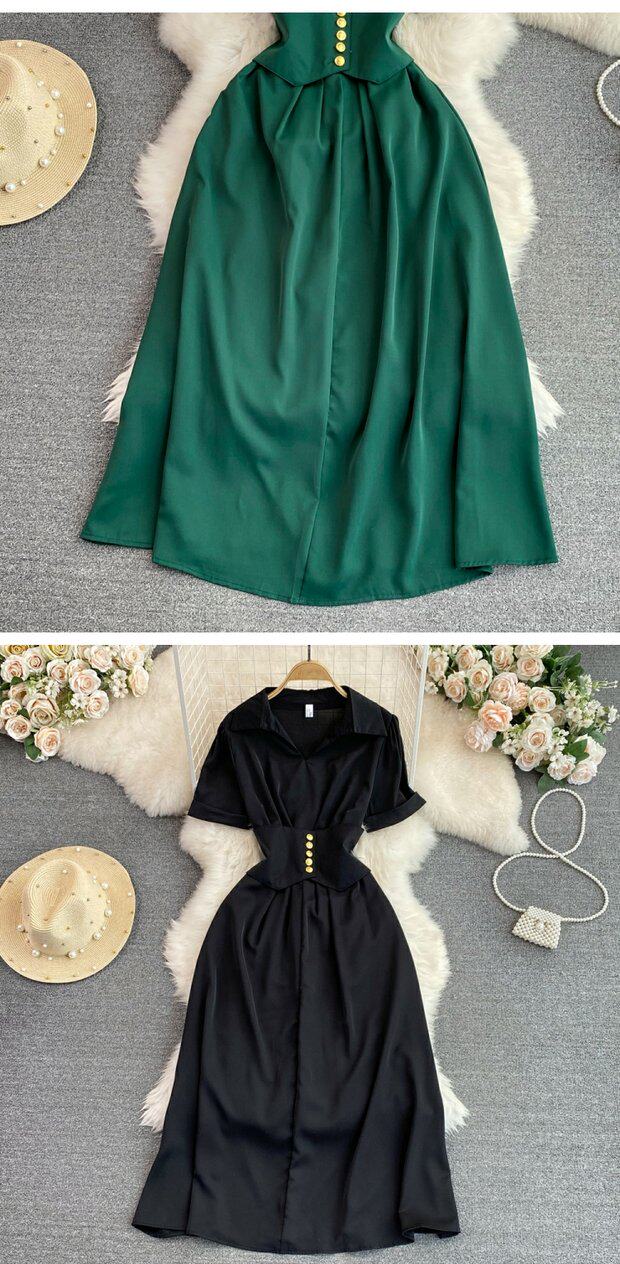 Рубашка, летняя модная юбка, приталенный корсет, платье, французский стиль, изысканный стиль, яркий броский стиль, воротник поло, короткий рукав, А-силуэт