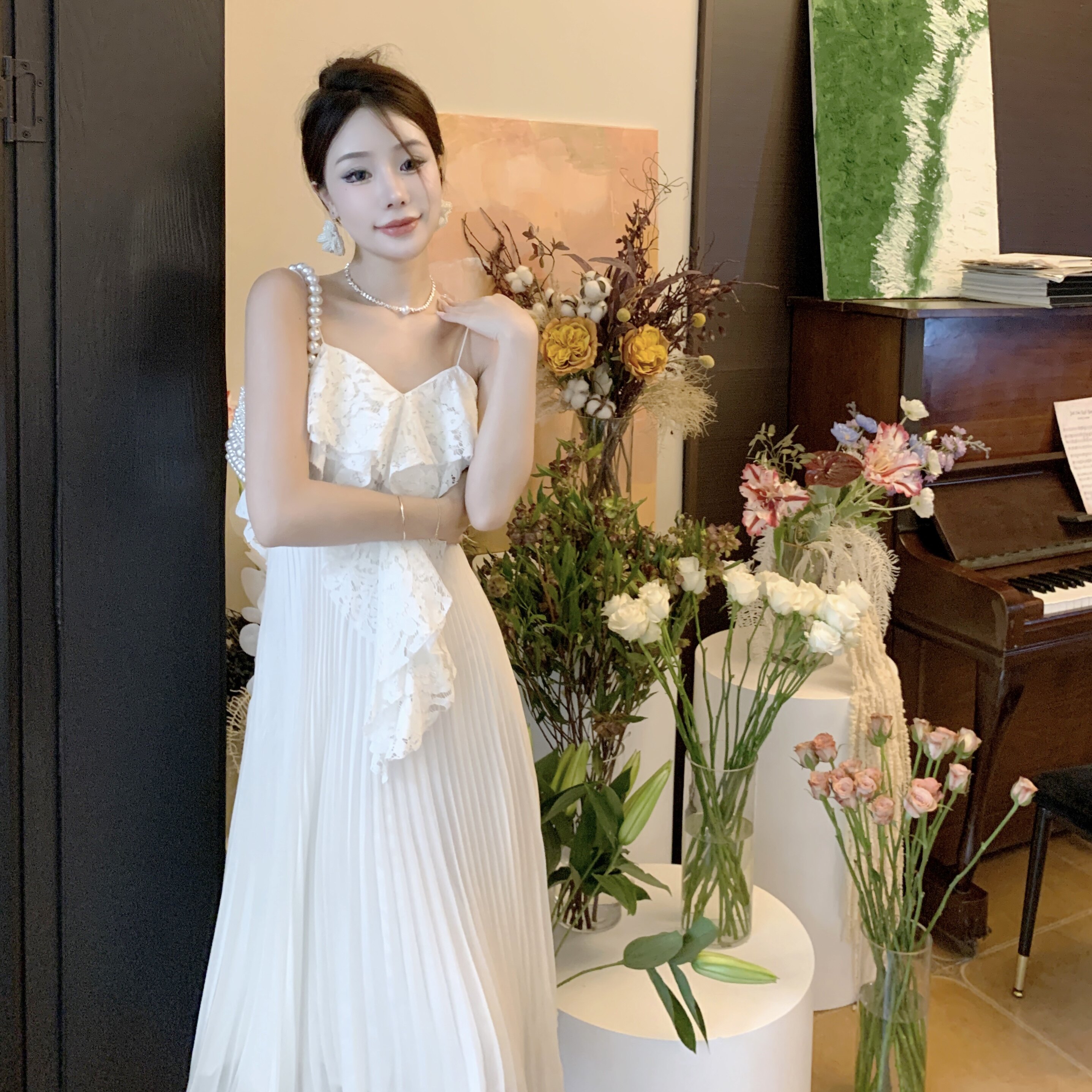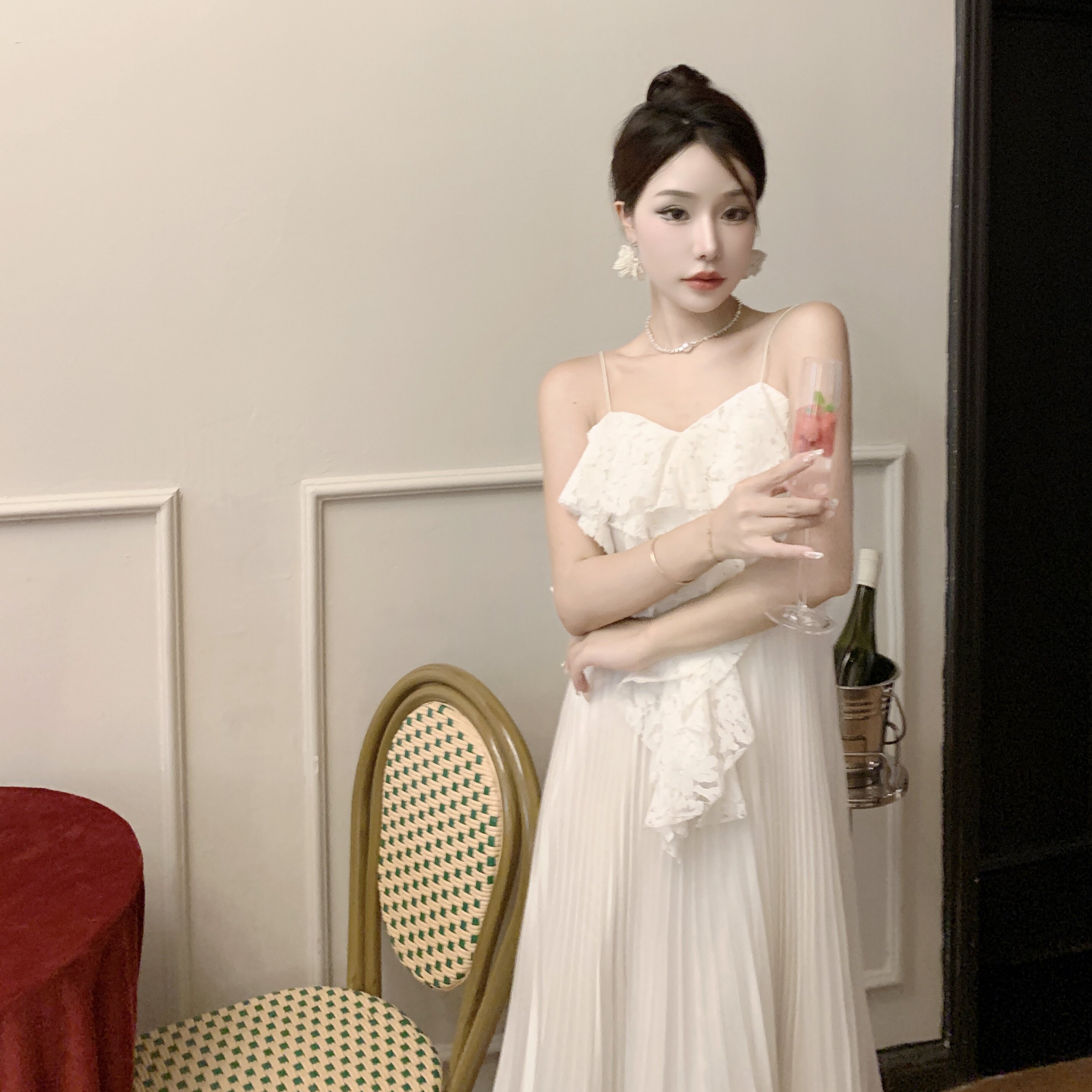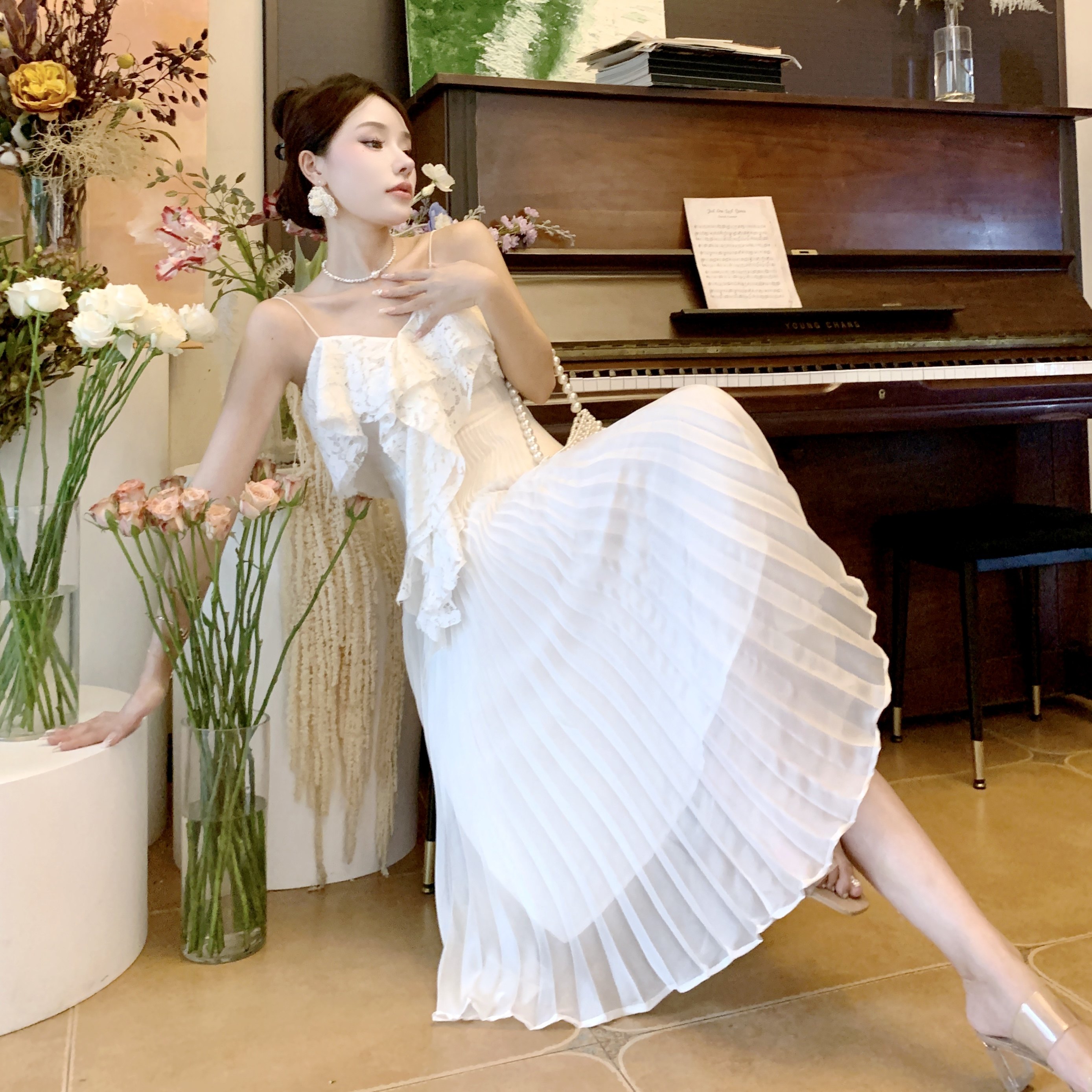 Белое кружевное пляжное платье, длинная юбка, плиссированная юбка, французский стиль