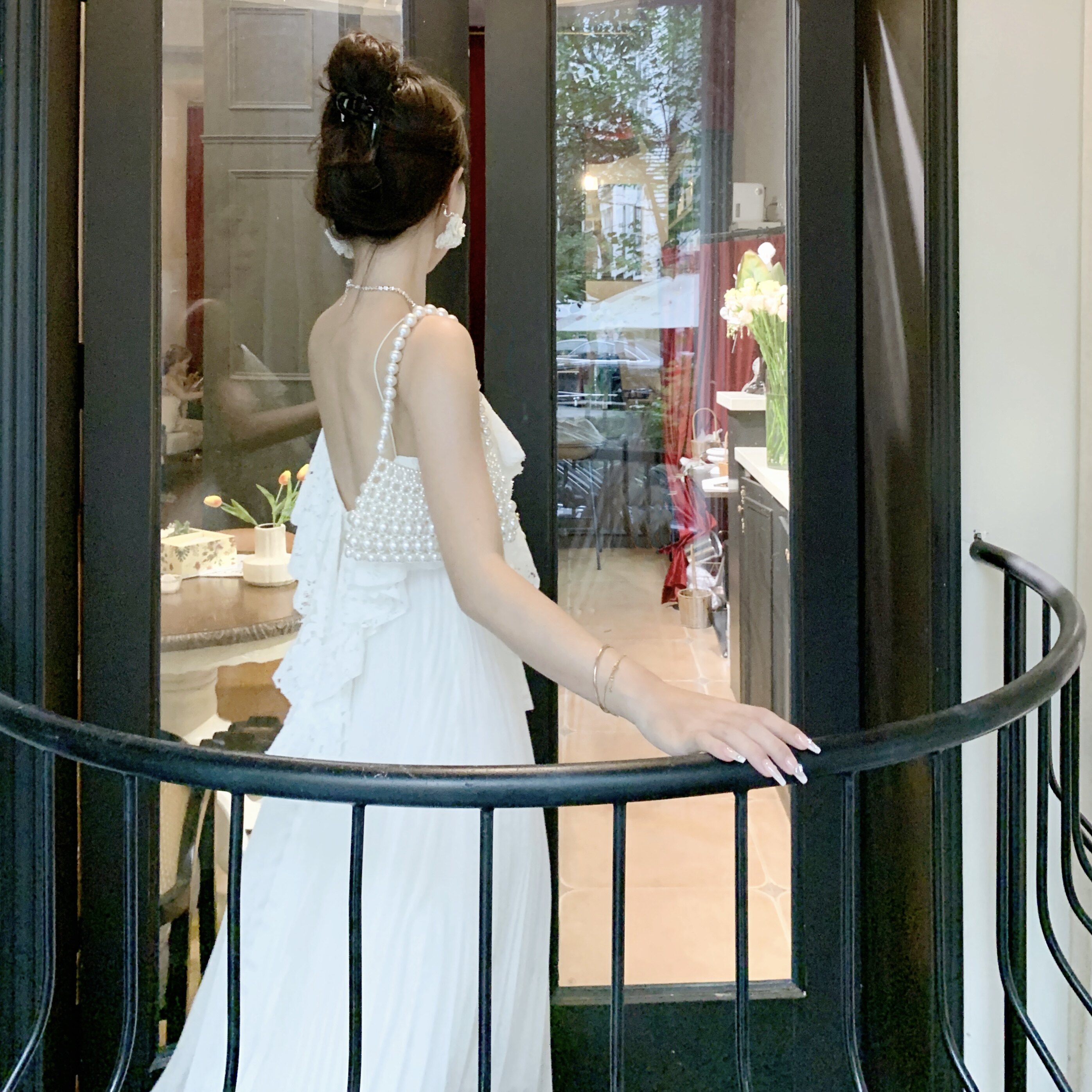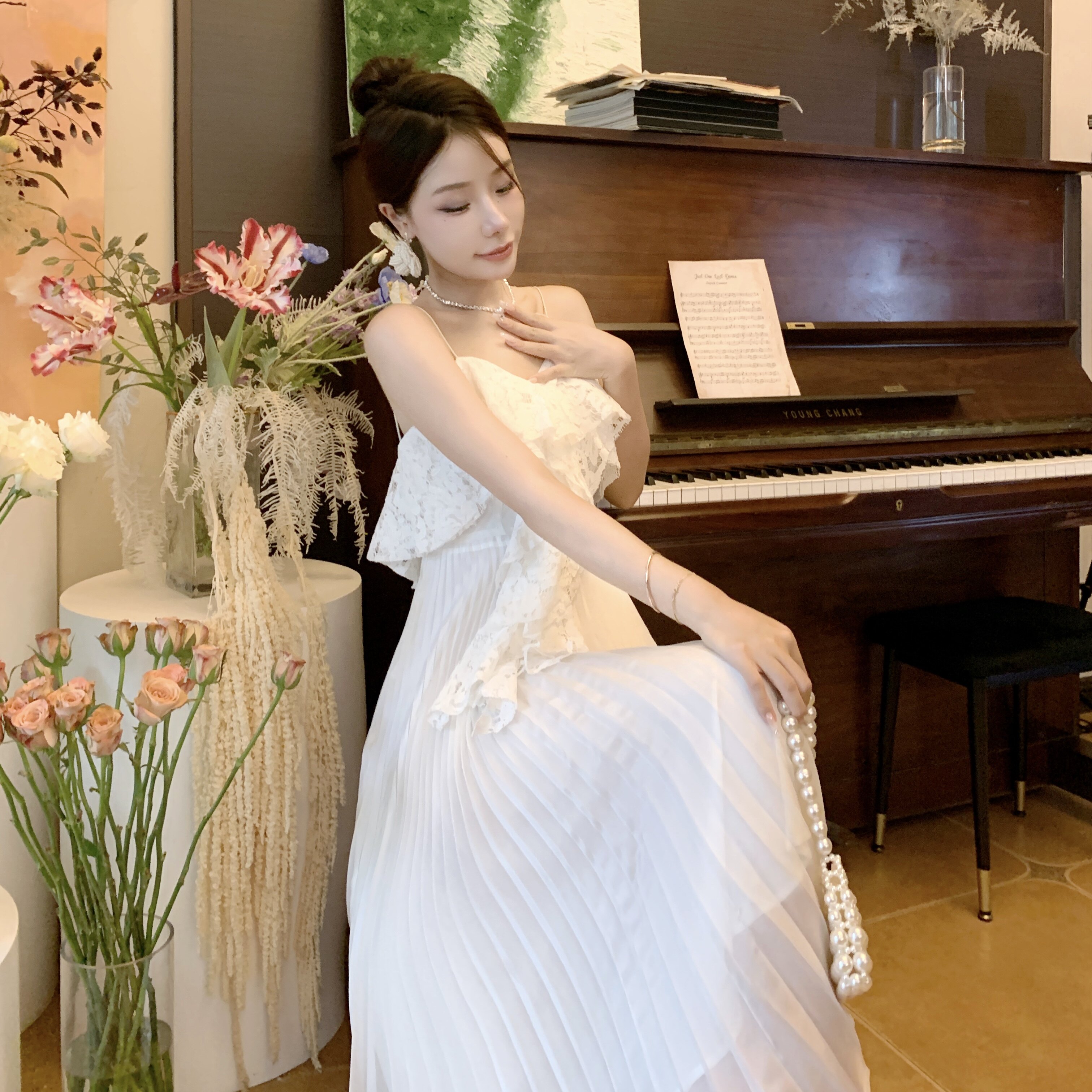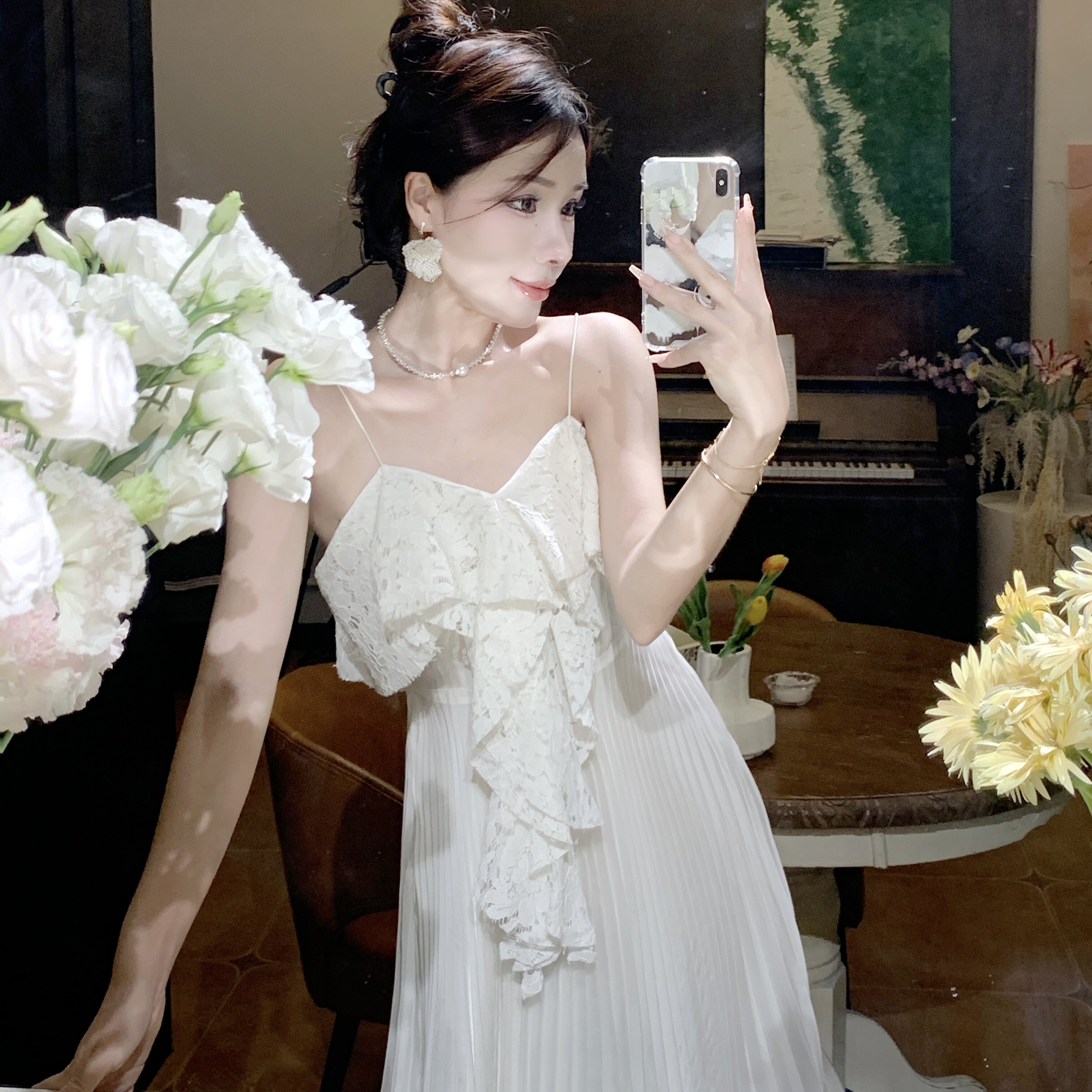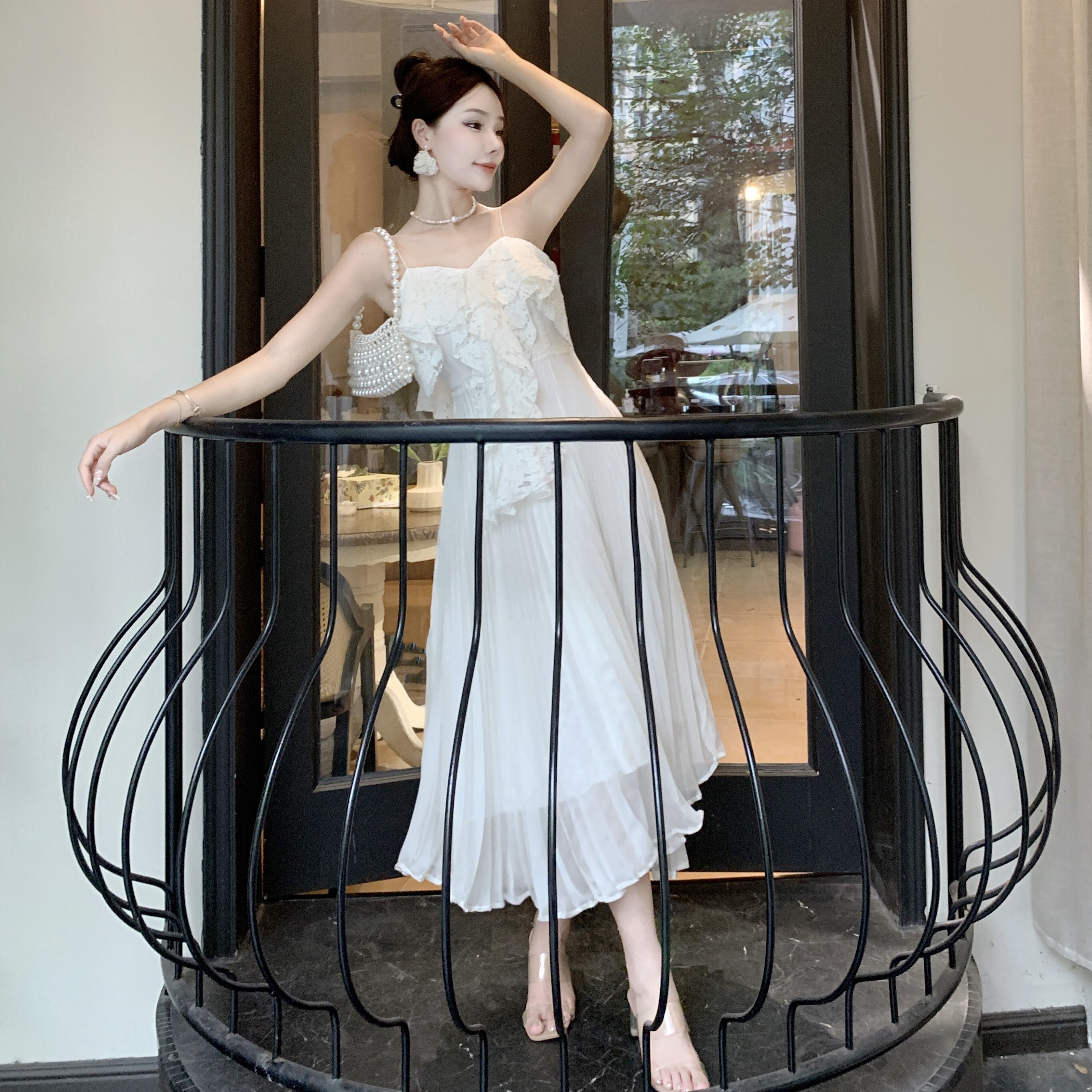 Белое кружевное пляжное платье, длинная юбка, плиссированная юбка, французский стиль