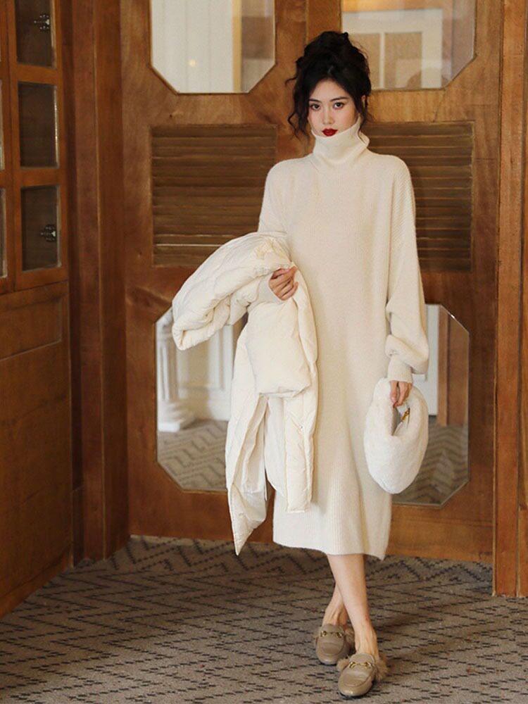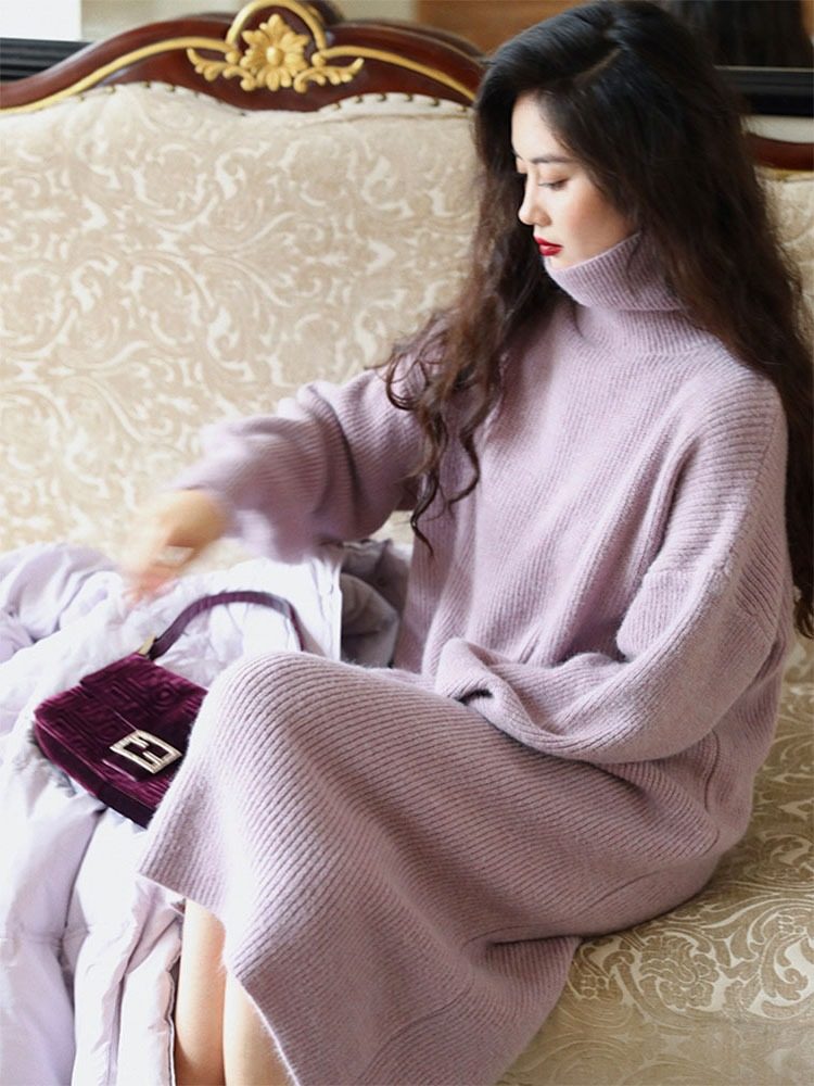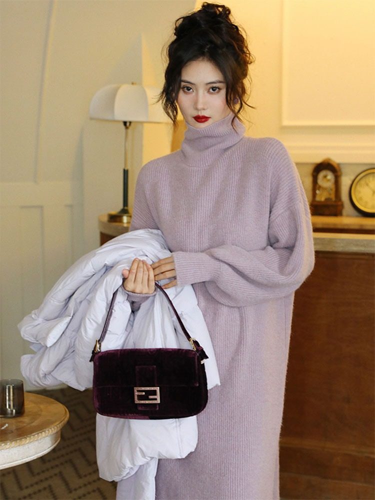 Зимнее базовое сиреневое трикотажное платье, шерстяное платье, французский стиль, яркий броский стиль, изысканный стиль, свободный прямой крой