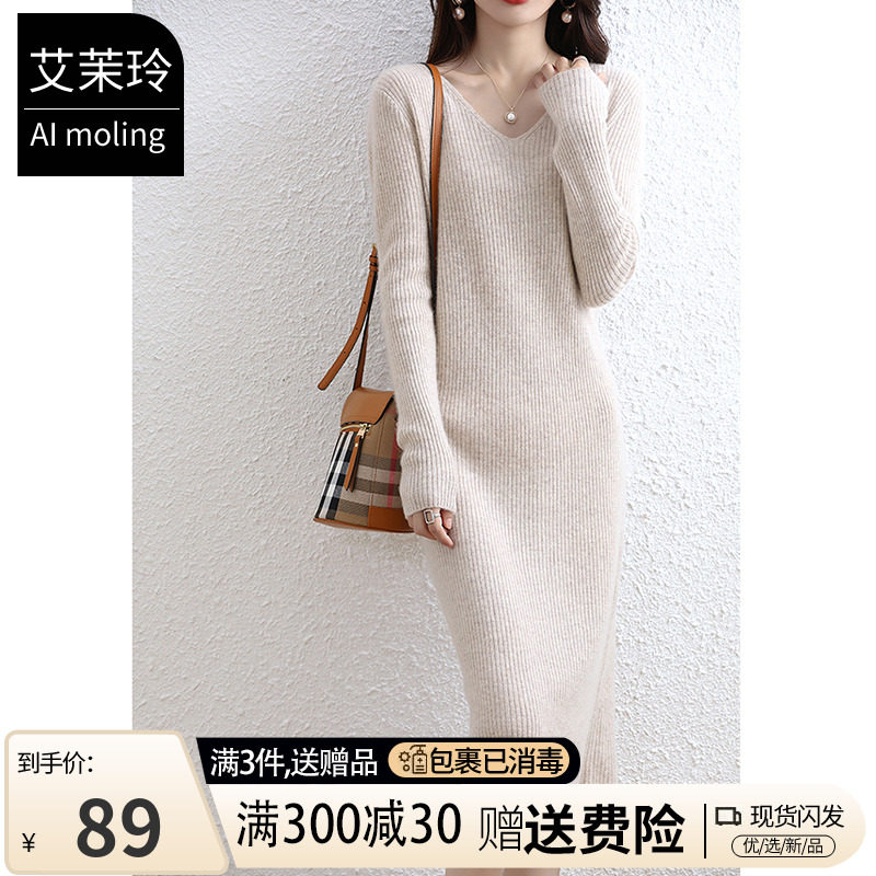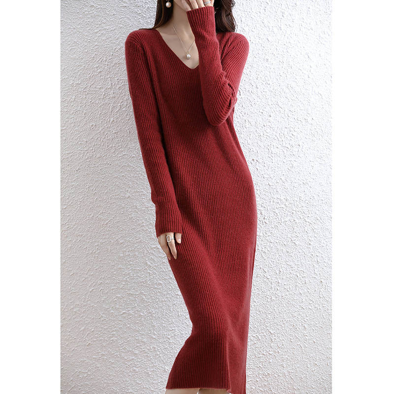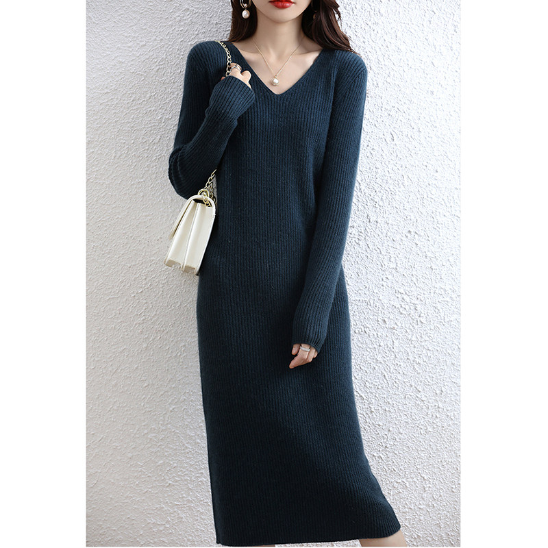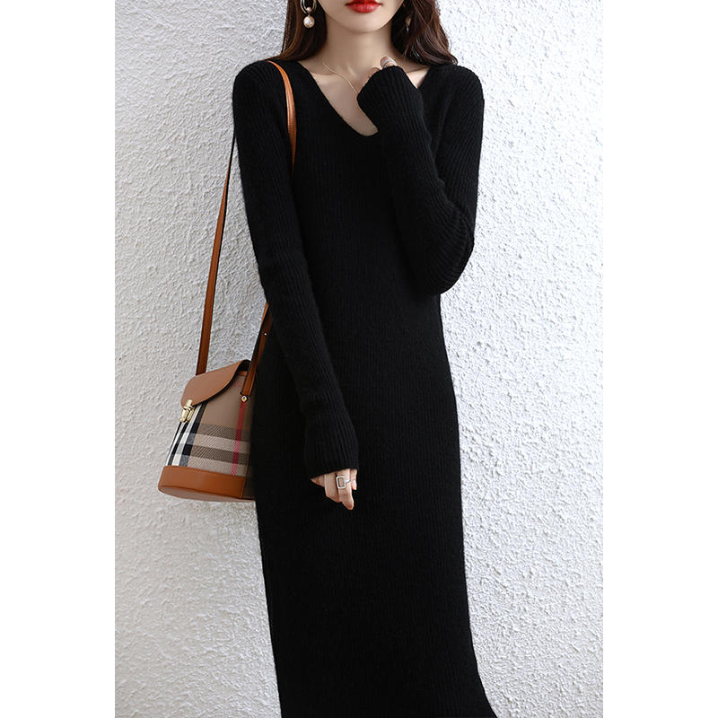 Демисезонное трикотажное зимнее платье, базовая шерстяная длинная юбка, французский стиль, с акцентом на бедрах