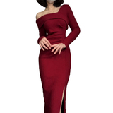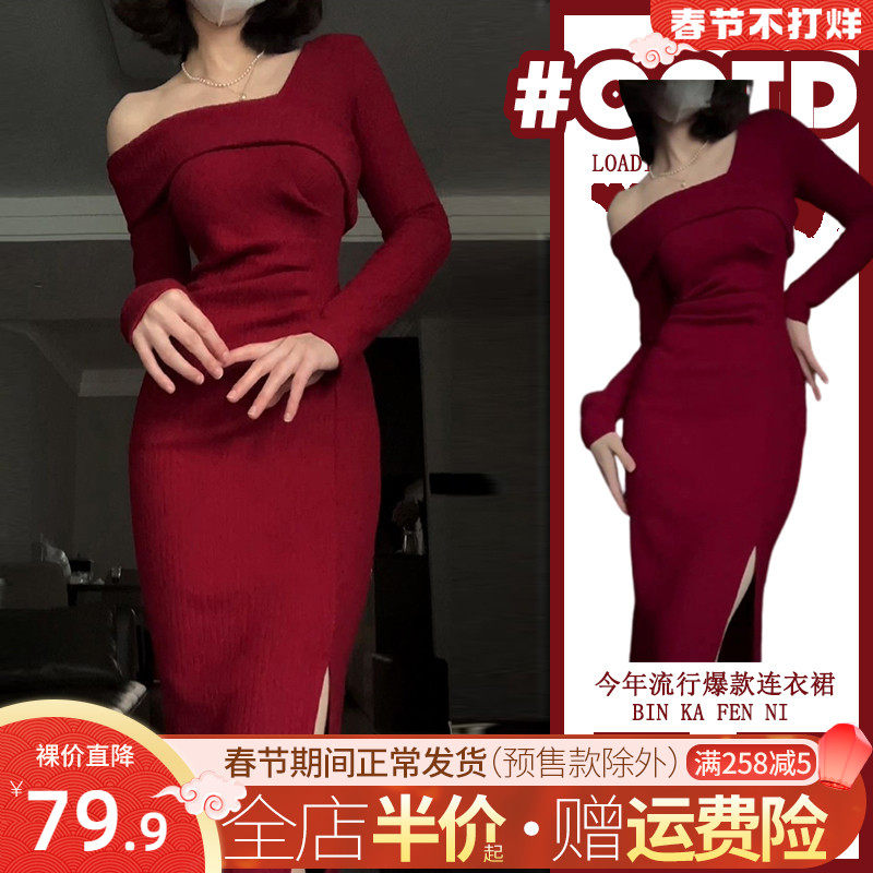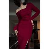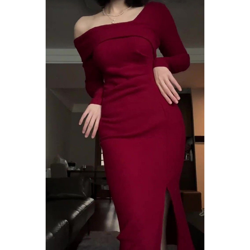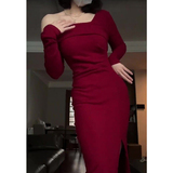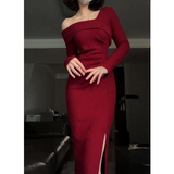 Красное трикотажное демисезонное длинное платье, французский стиль, средней длины, с акцентом на бедрах