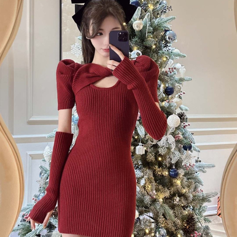 Весеннее летнее красное трикотажное демисезонное шерстяное платье, с акцентом на бедрах