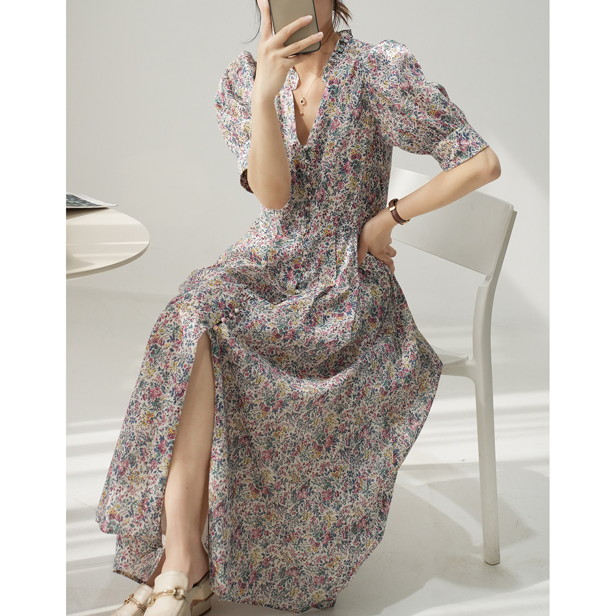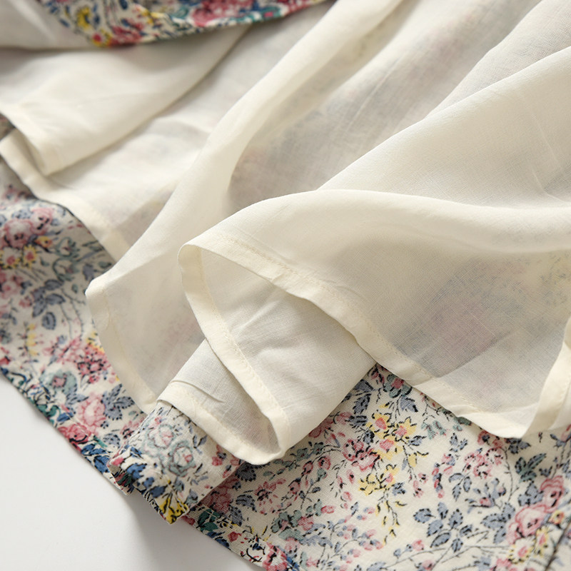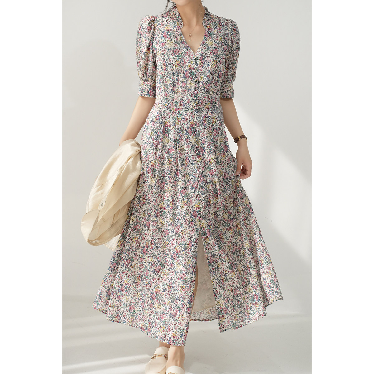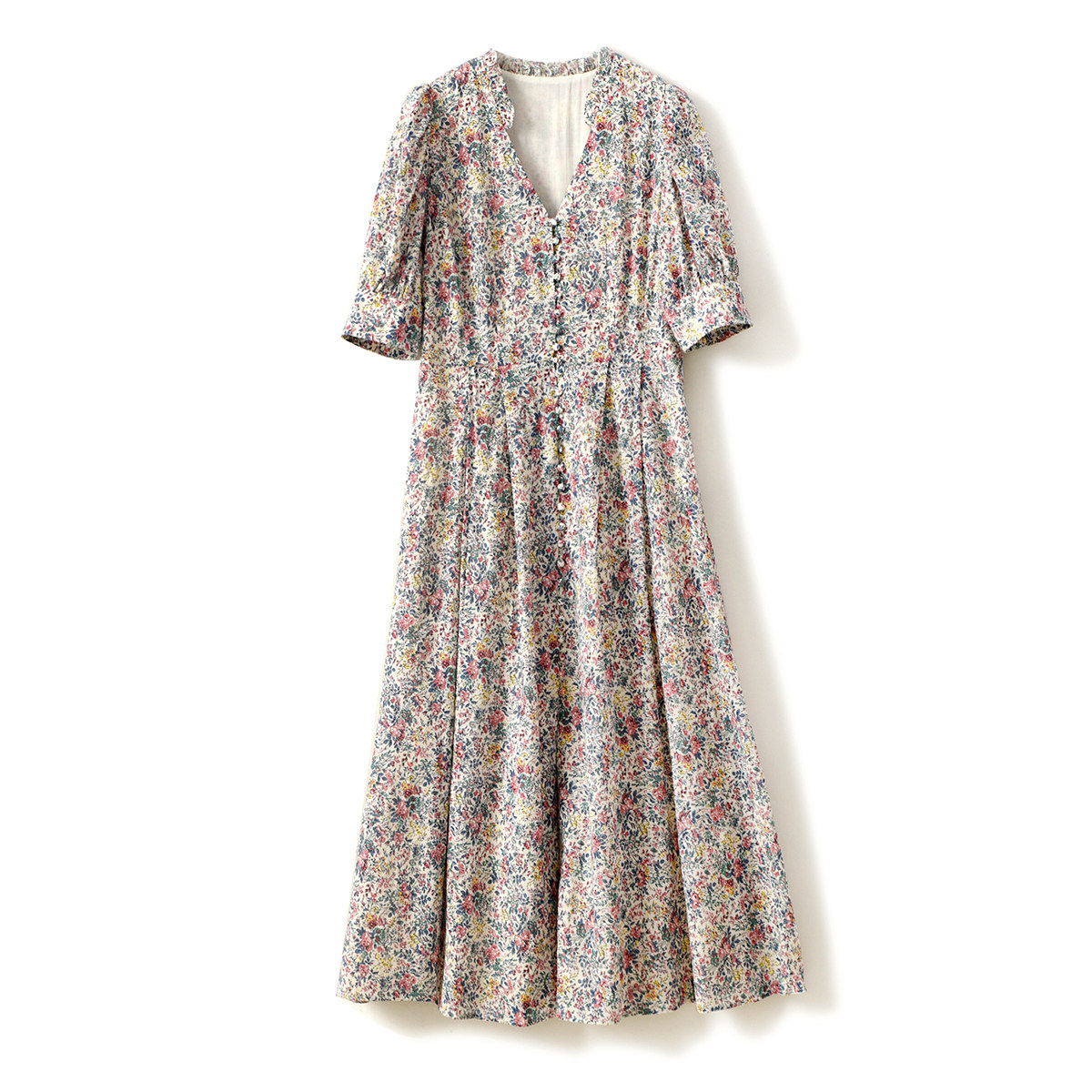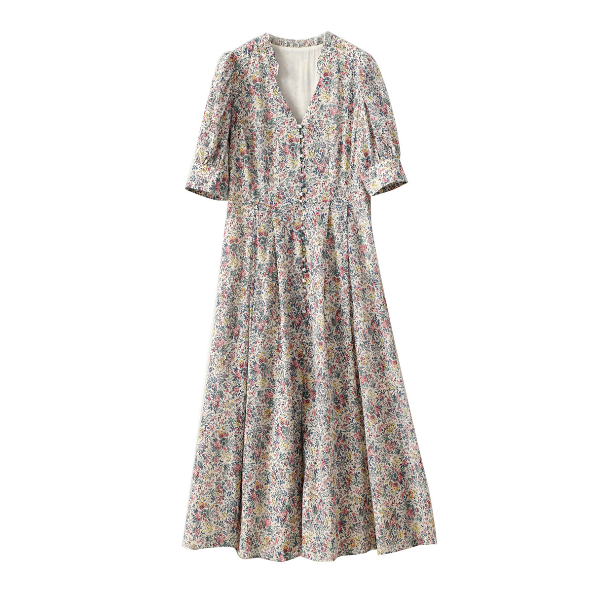 Хлопковое платье, приталенный корсет, летняя длинная юбка, французский стиль, в цветочек, V-образный вырез, рукава фонарики, городской стиль