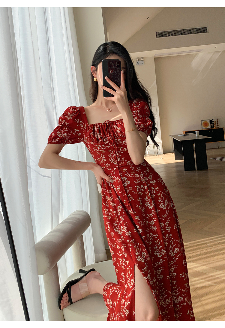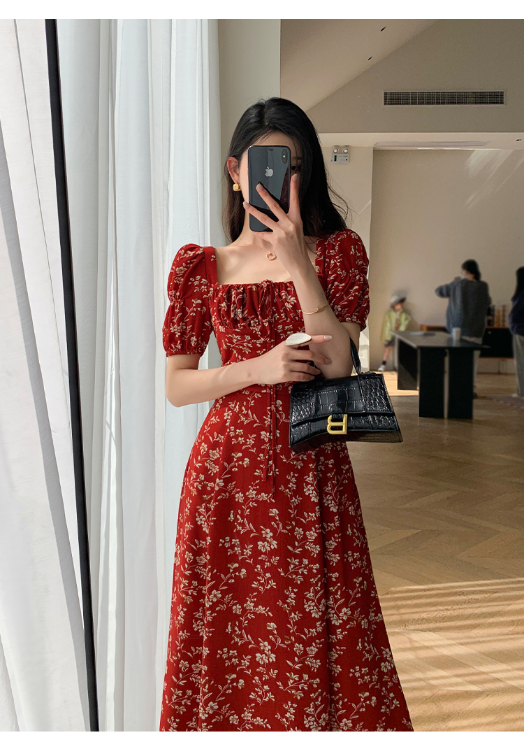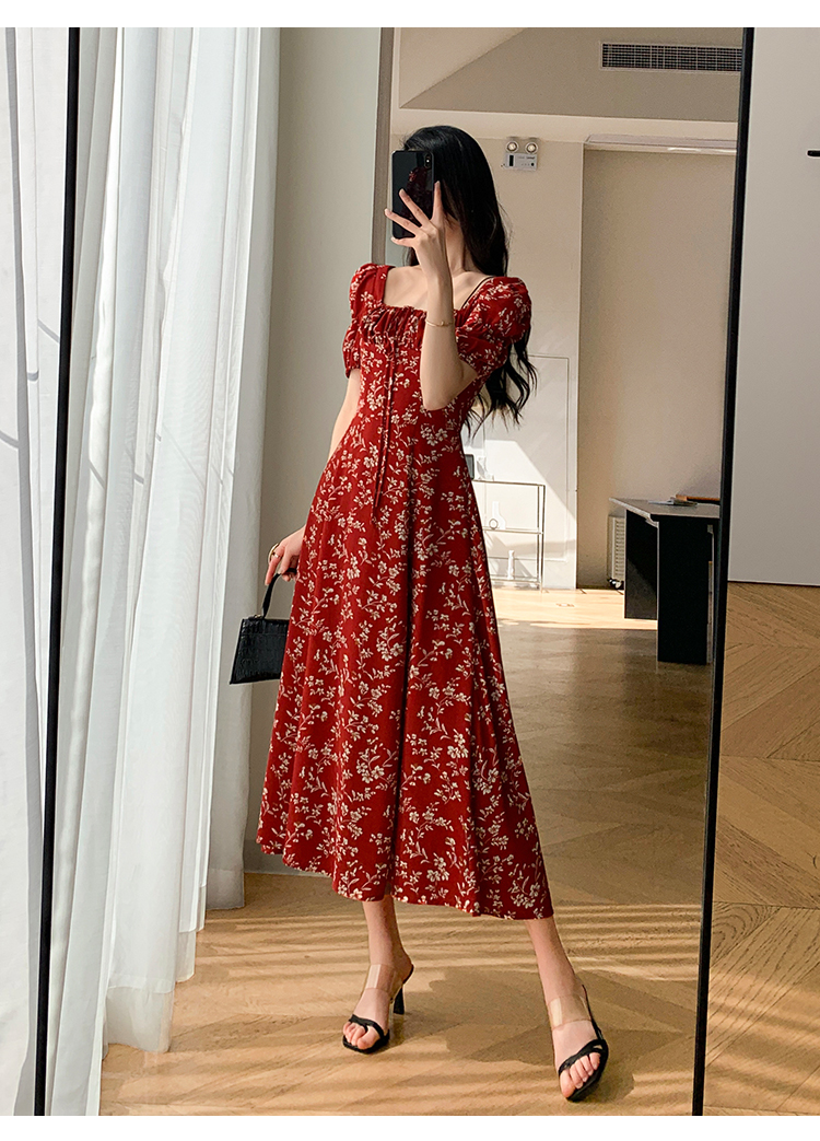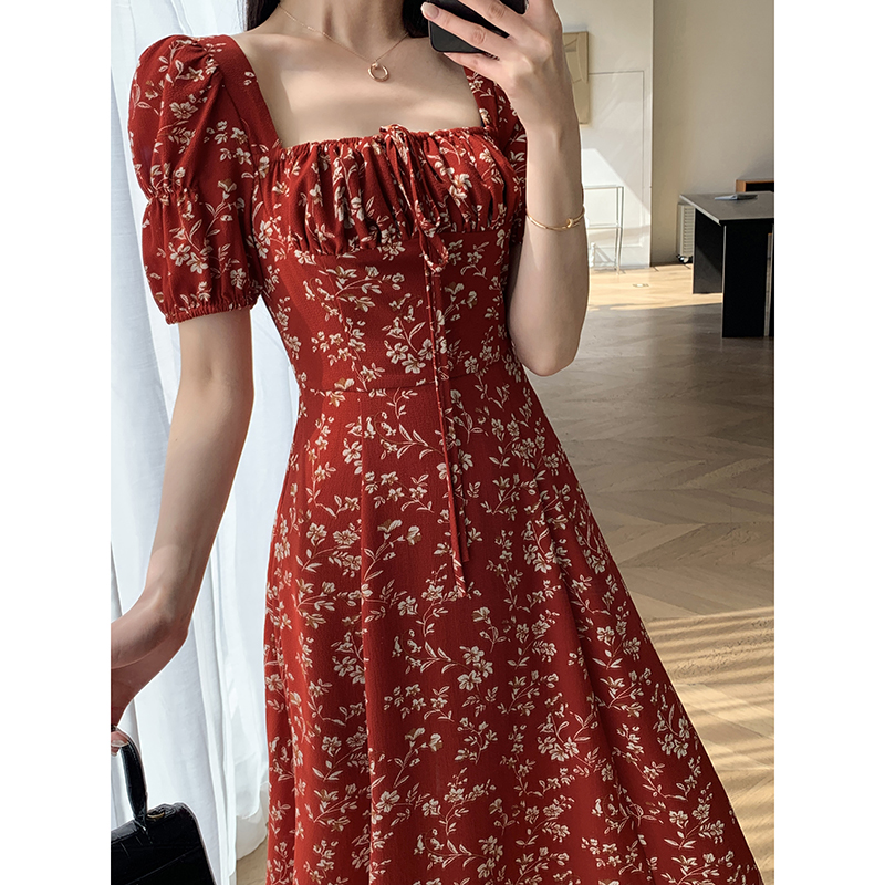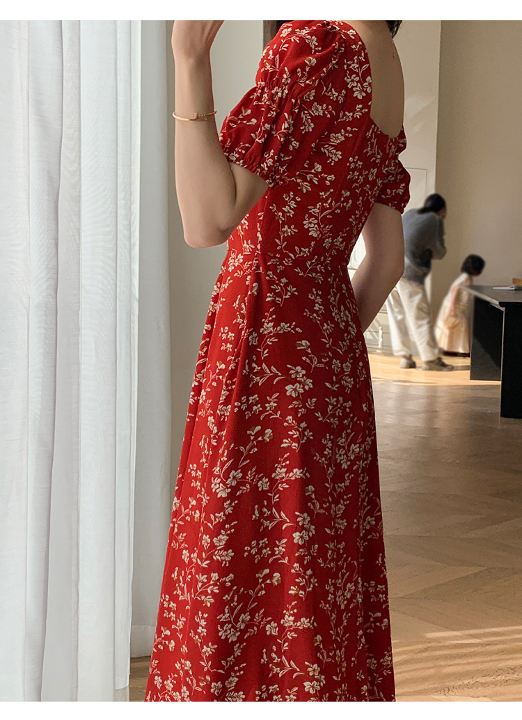 Красное летнее платье, длинная юбка, делается под заказ, в цветочек, премиум класс, французский стиль, квадратный вырез