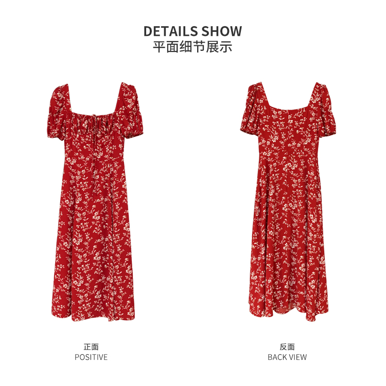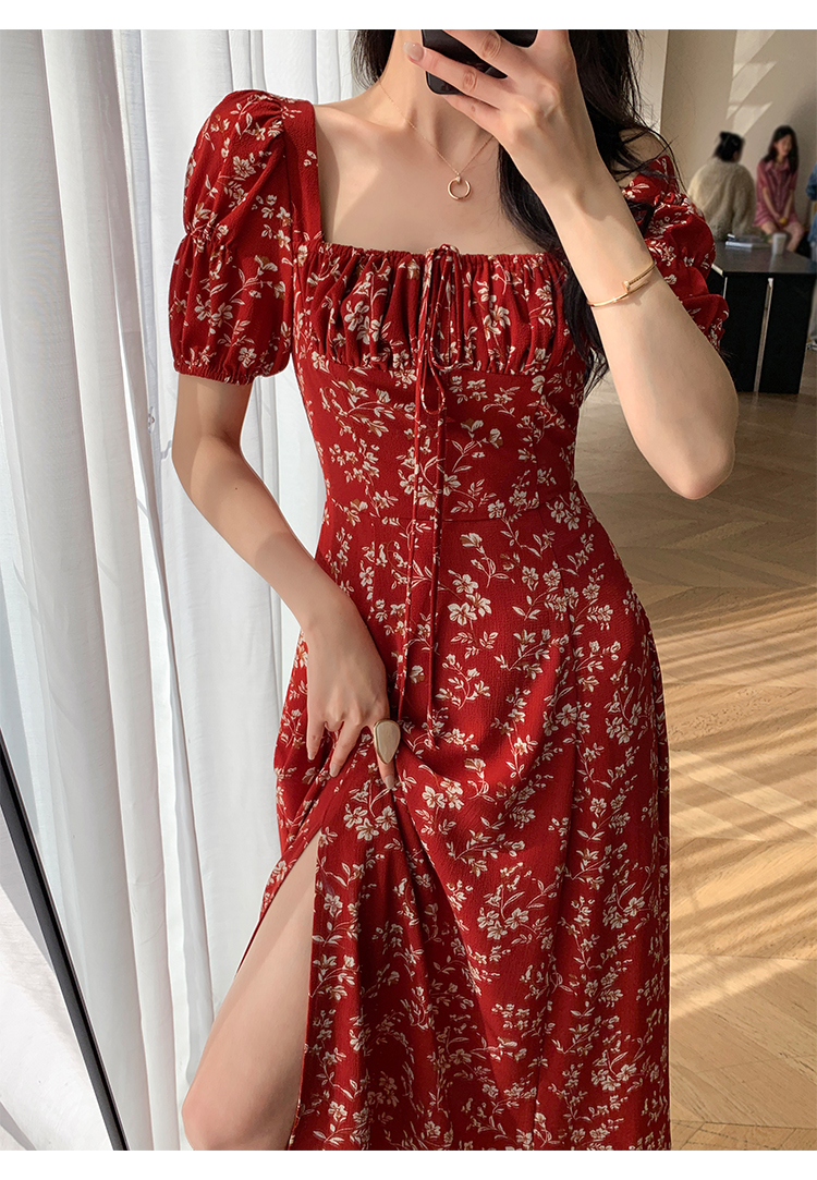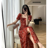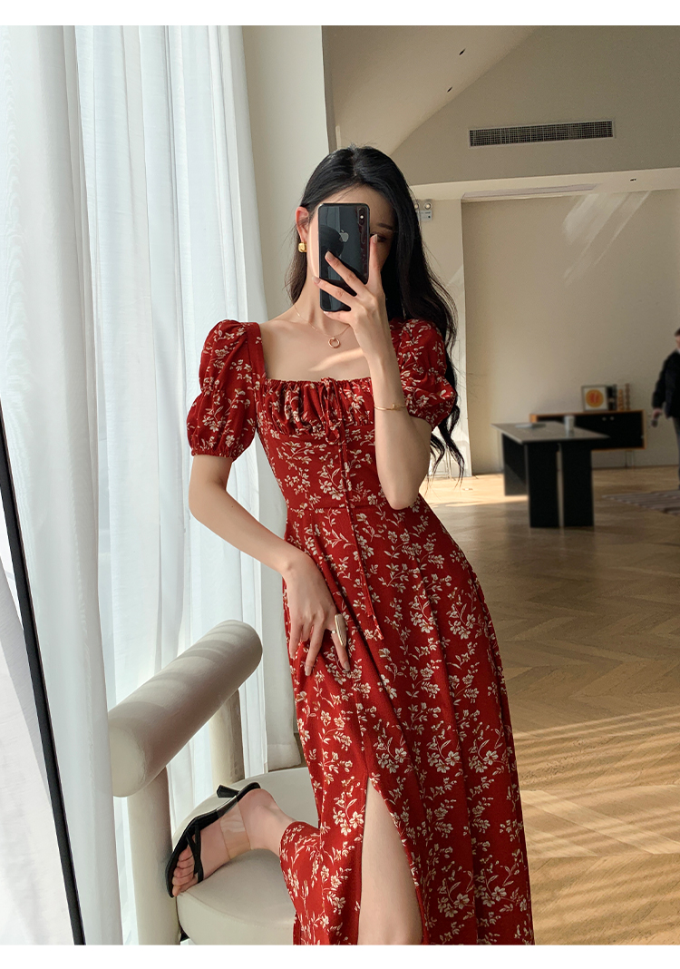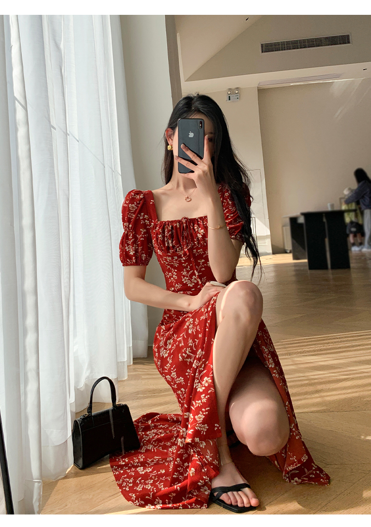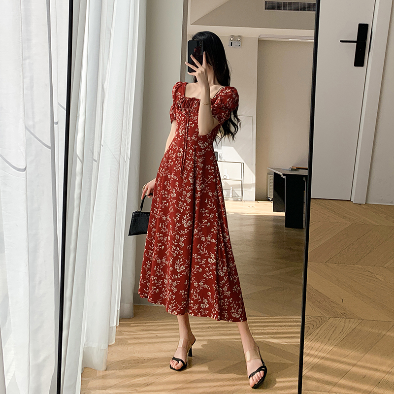 Красное летнее платье, длинная юбка, делается под заказ, в цветочек, премиум класс, французский стиль, квадратный вырез