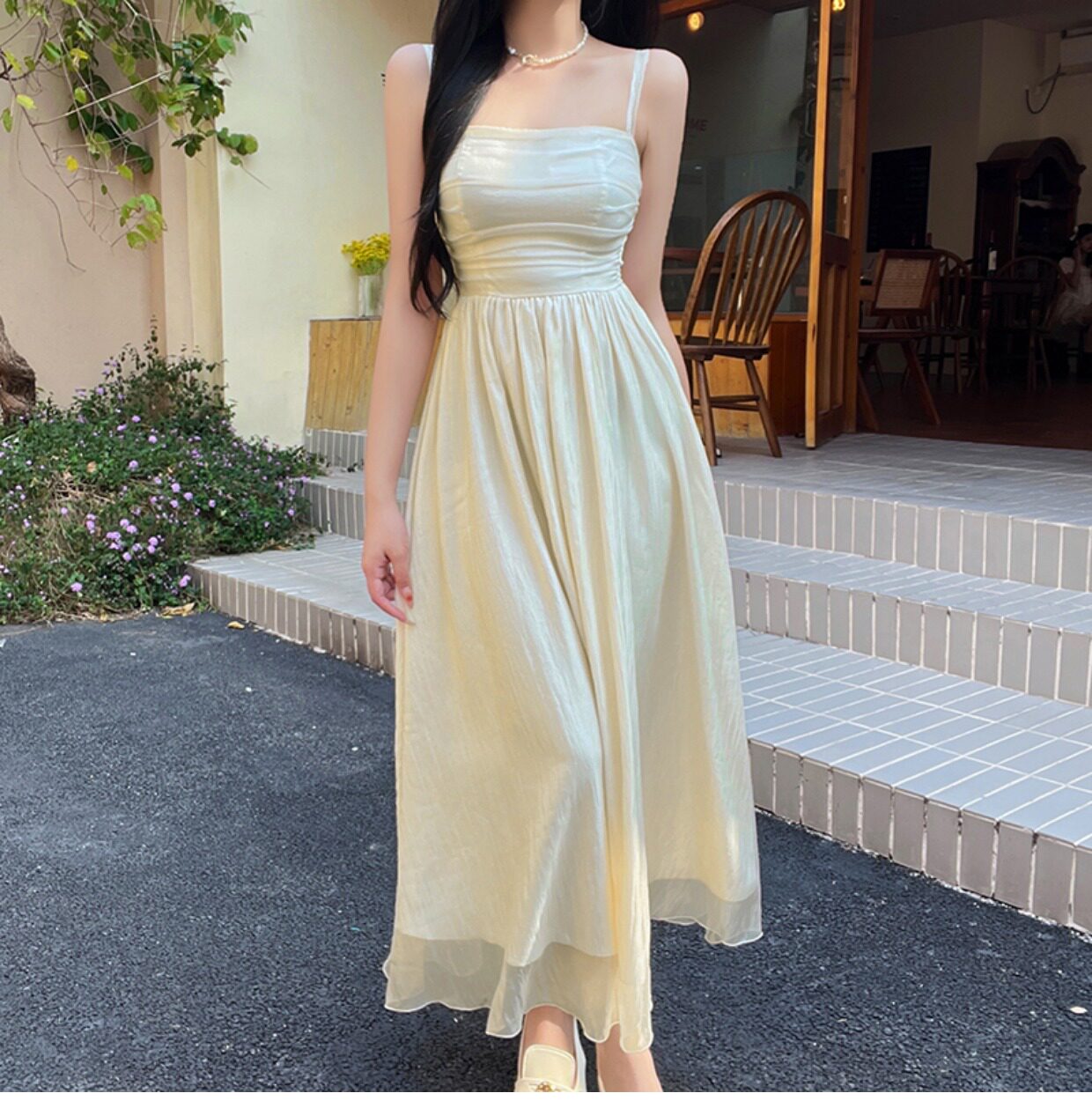 Шифоновое летнее платье, приталенный корсет, длинная юбка, французский стиль, эффект подтяжки, длина макси