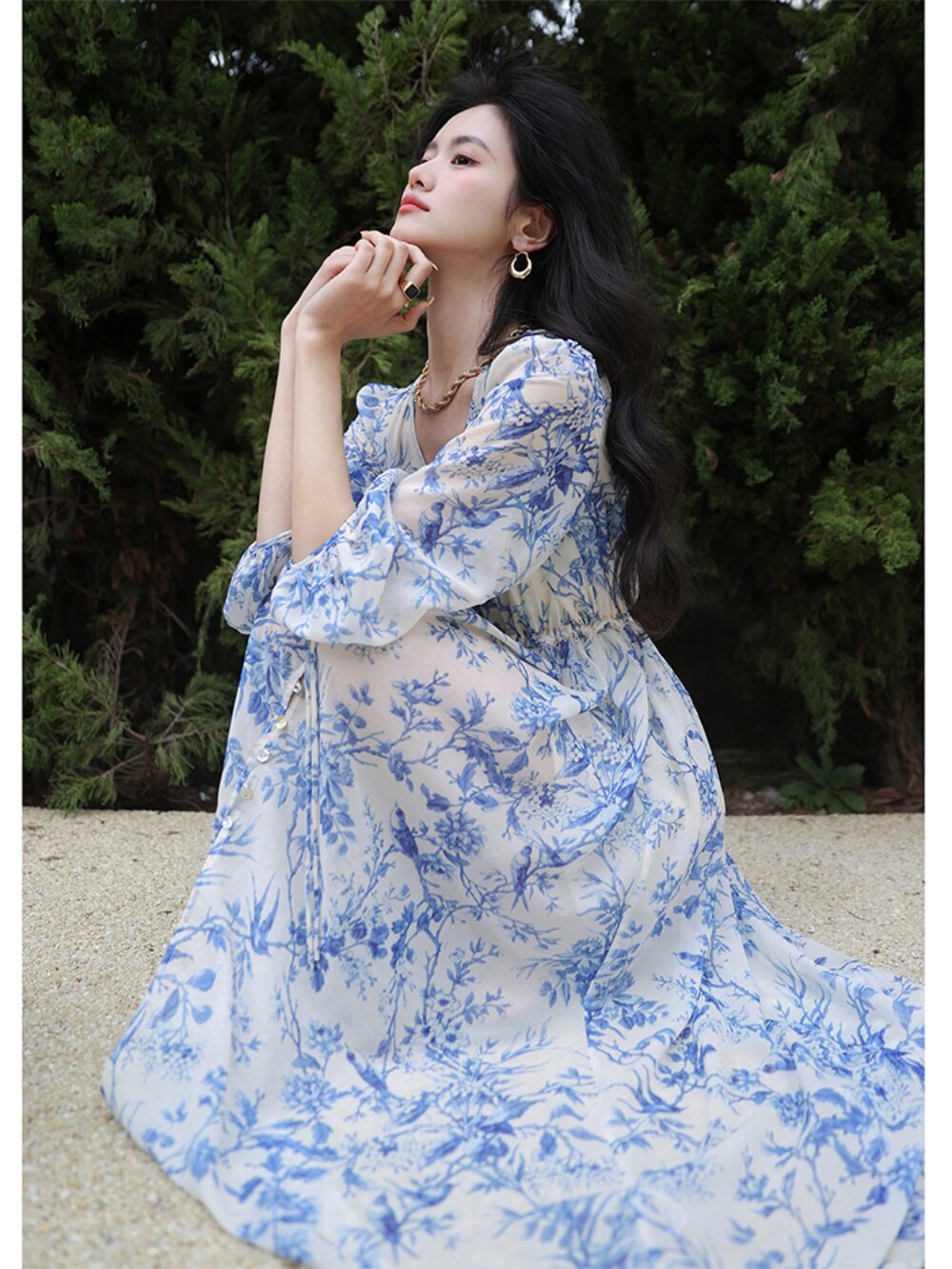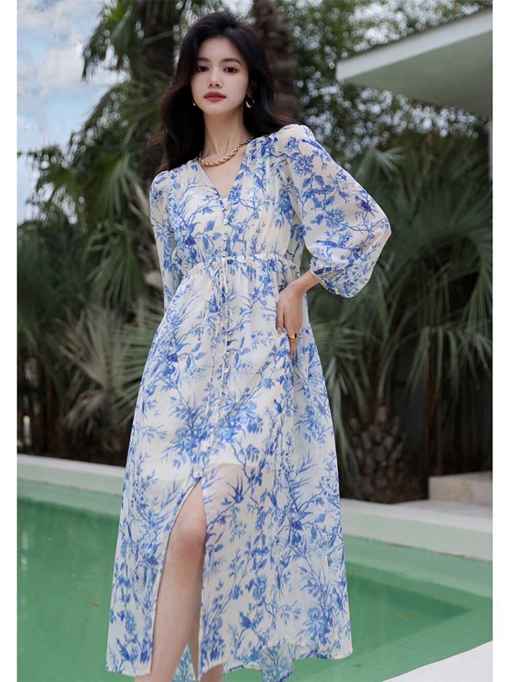Сине-белое приталенное летнее платье, длинная юбка, эластичная талия