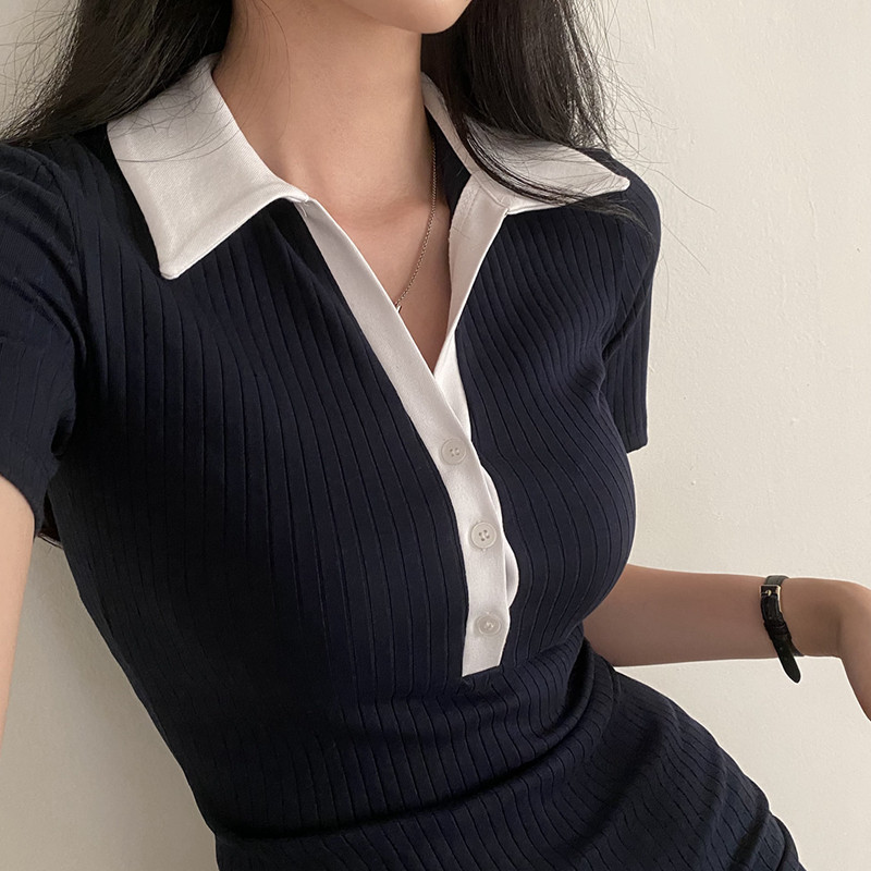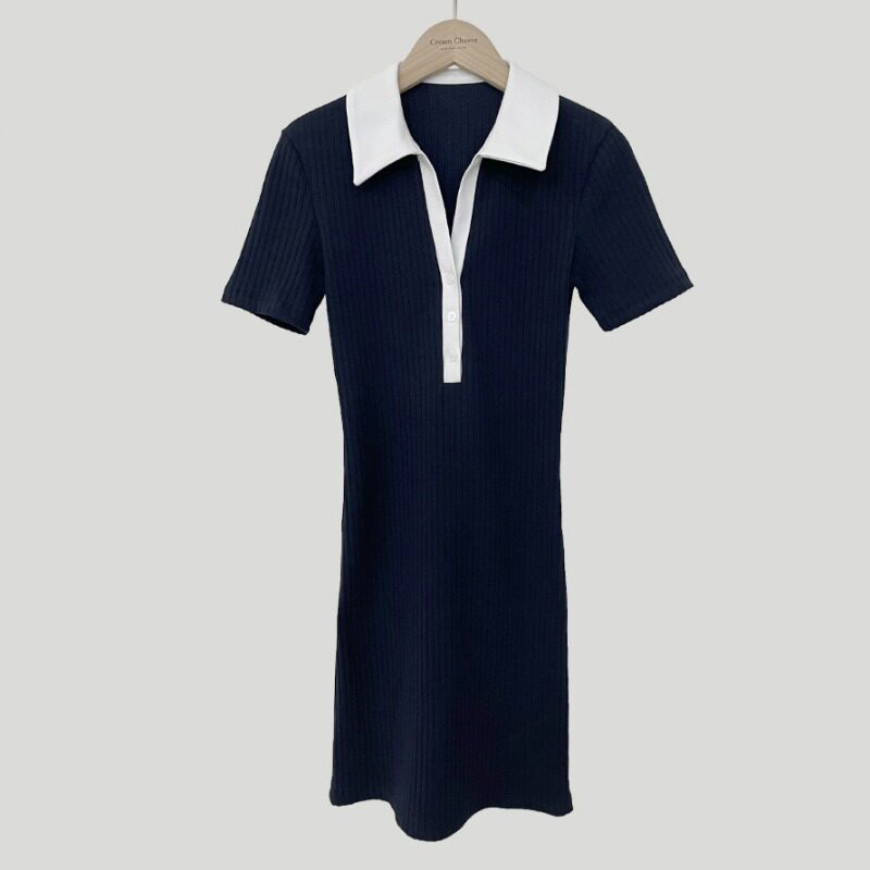 Летнее трикотажное приталенное трикотажное платье, мини-юбка, в корейском стиле, воротник поло