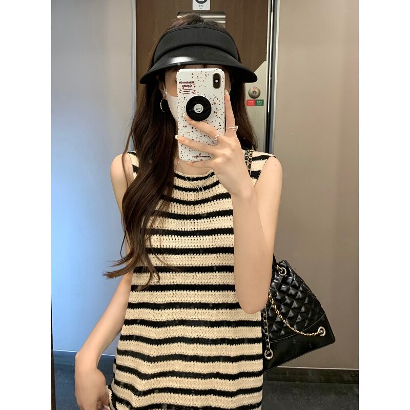 Черное летнее трикотажное платье, юбка, длинное платье без рукавов, французский стиль, длина макси, свободный прямой крой