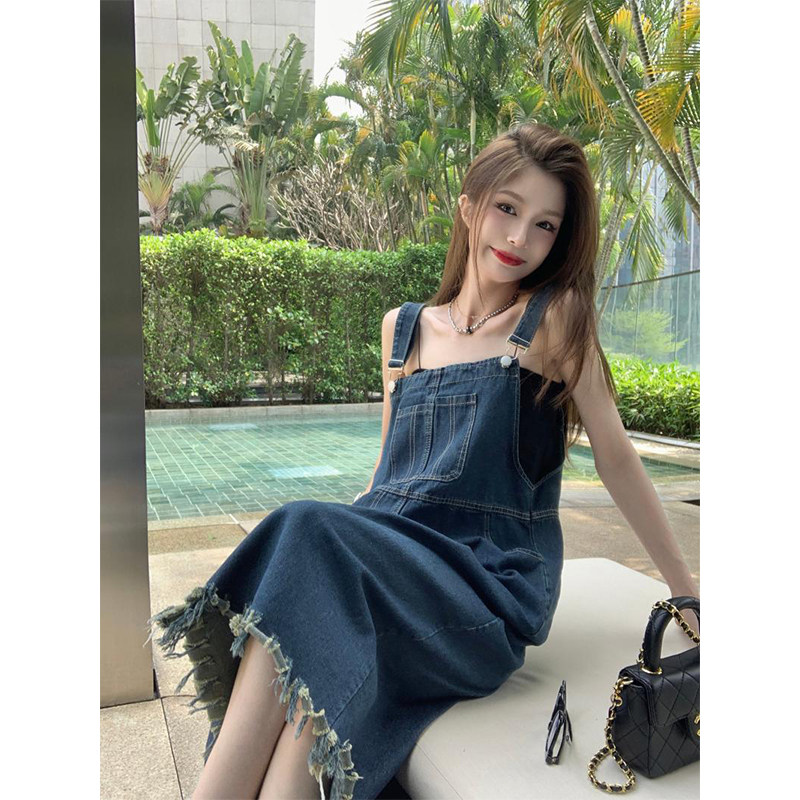 Джинсовые подтяжки, летнее платье, дизайнерская длинная юбка с кисточками, коллекция 2023, французский стиль, тренд сезона, средней длины