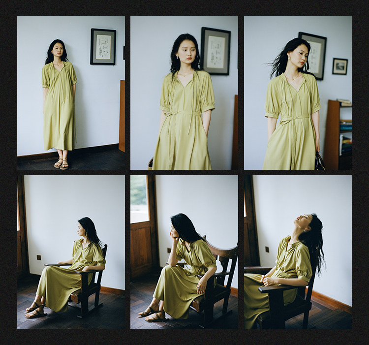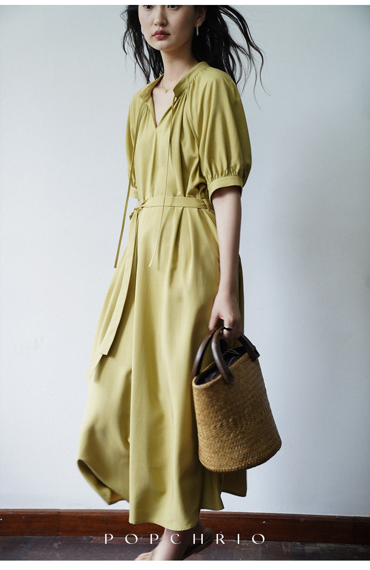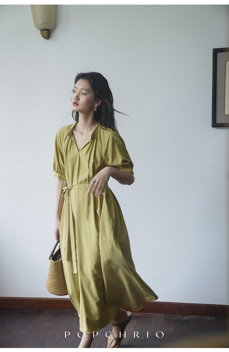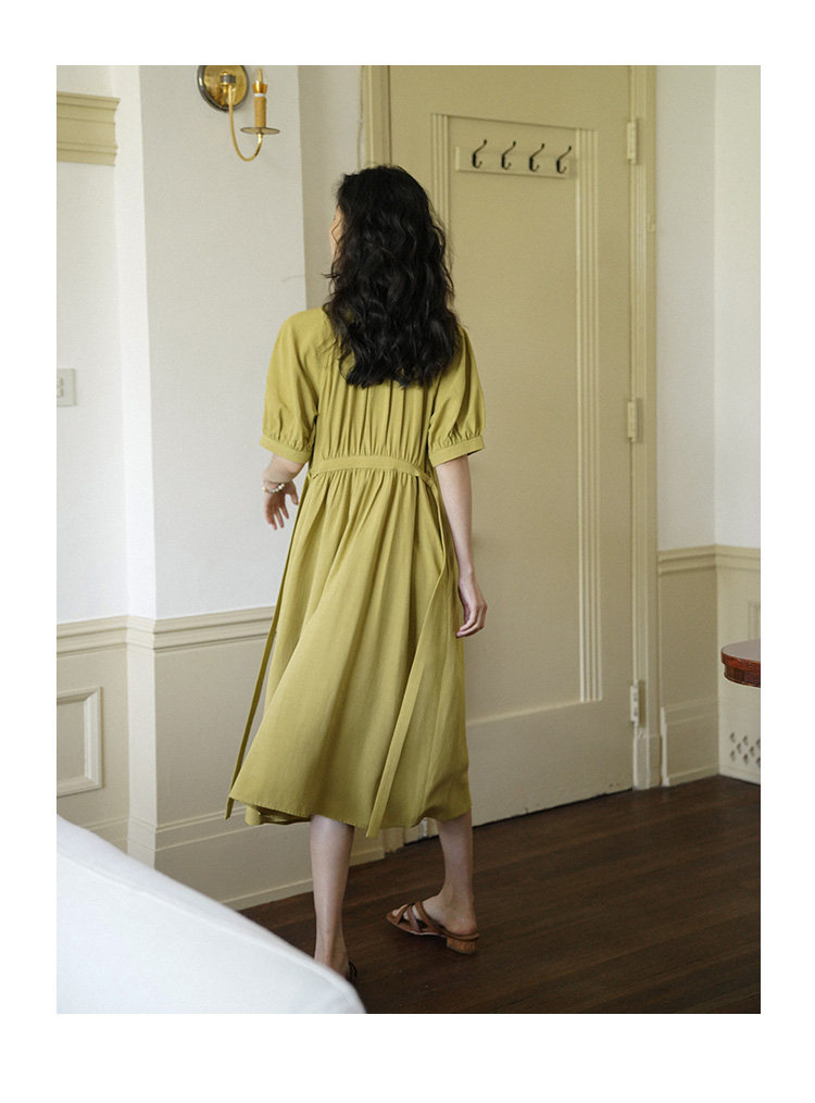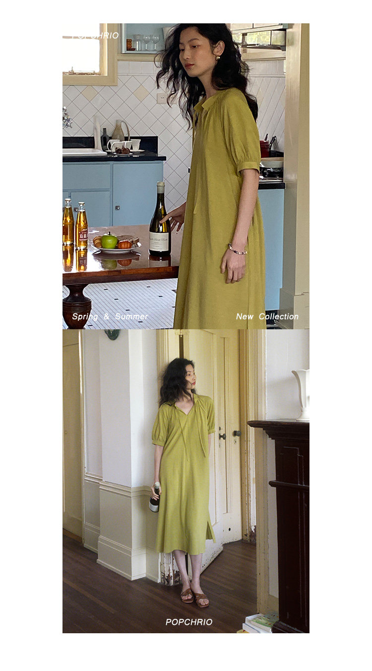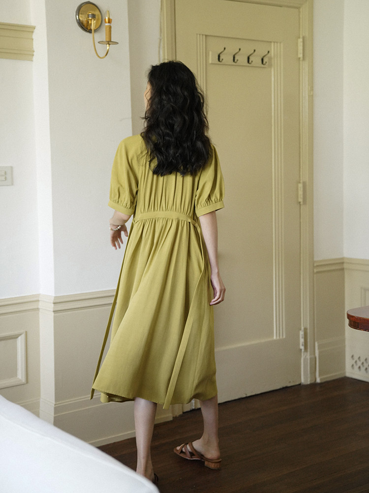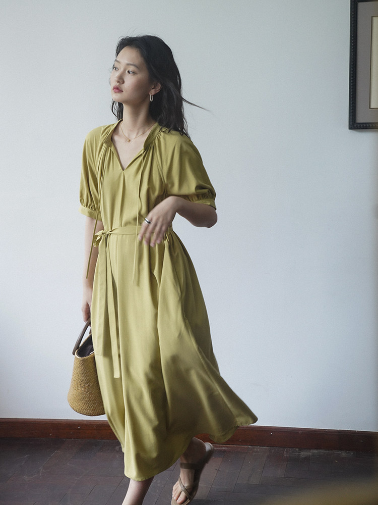 [Получить 299 юаней] Платье с короткими рукавами и французским воротником-стойкой из смеси тенселя и льна, ленивая свободная длинная юбка