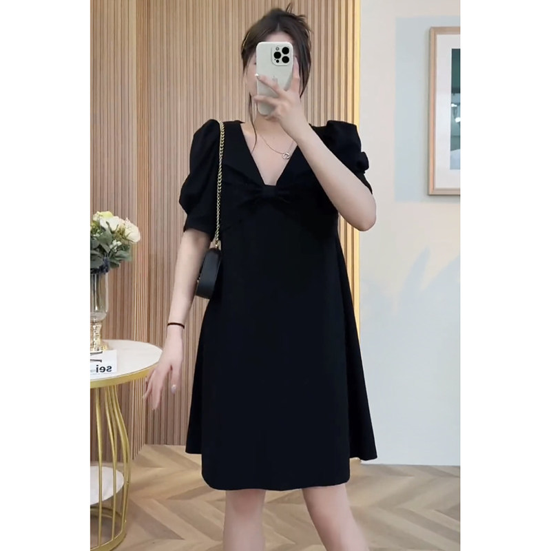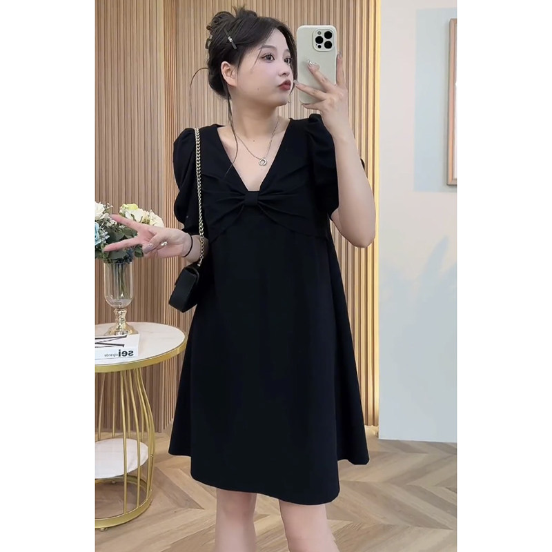 Платье с бантиком, юбка, большой размер, V-образный вырез, яркий броский стиль, по фигуре