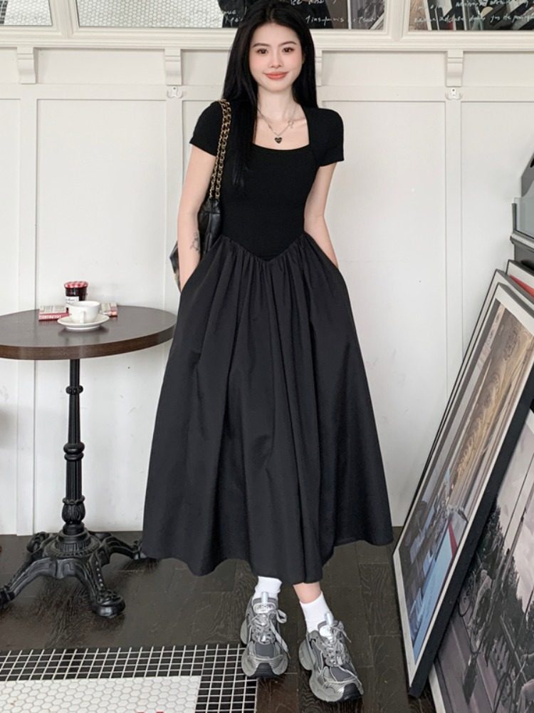 Летнее платье, черная приталенная длинная юбка, большой размер, французский стиль, высокая талия, А-силуэт