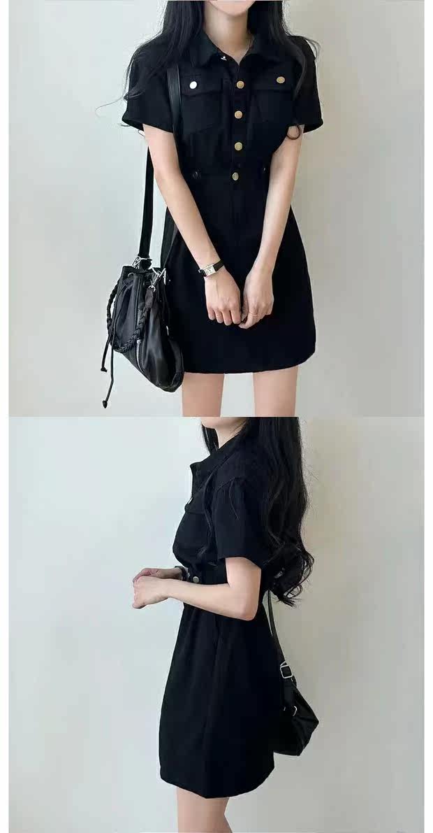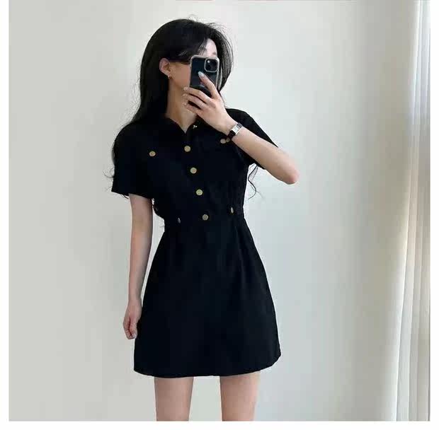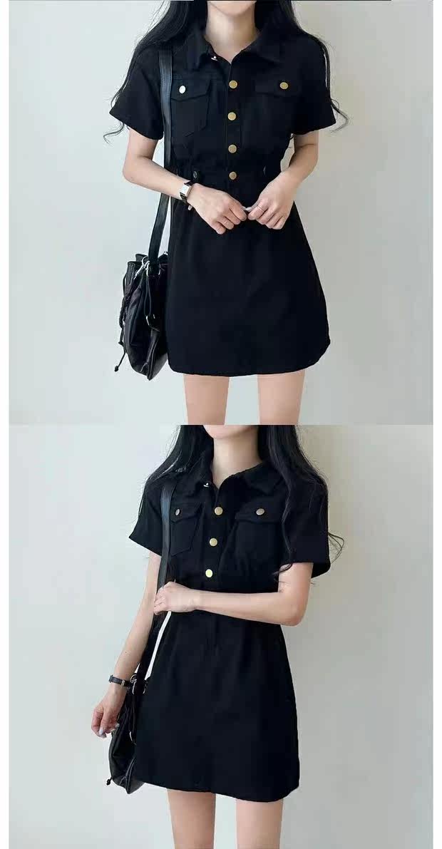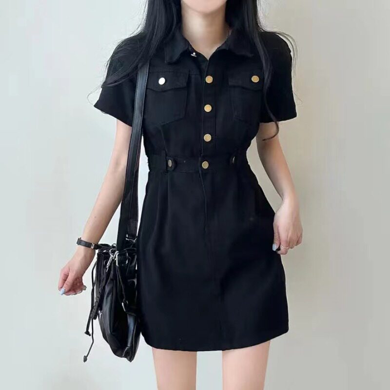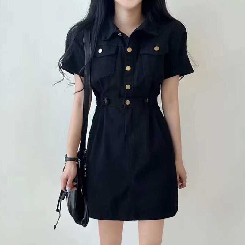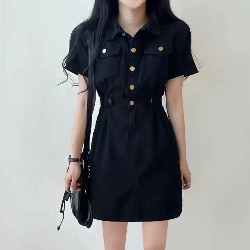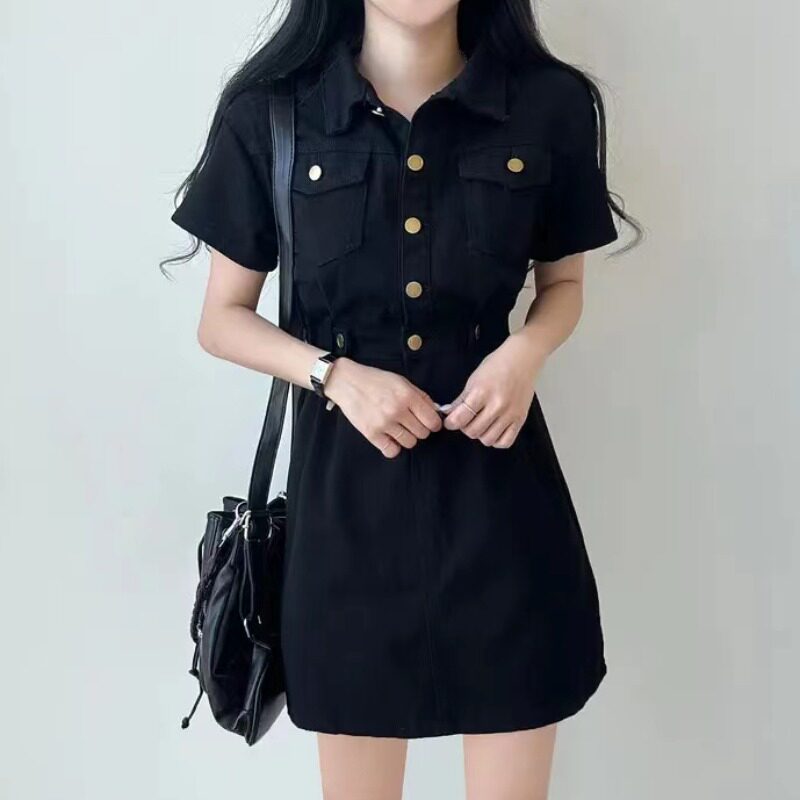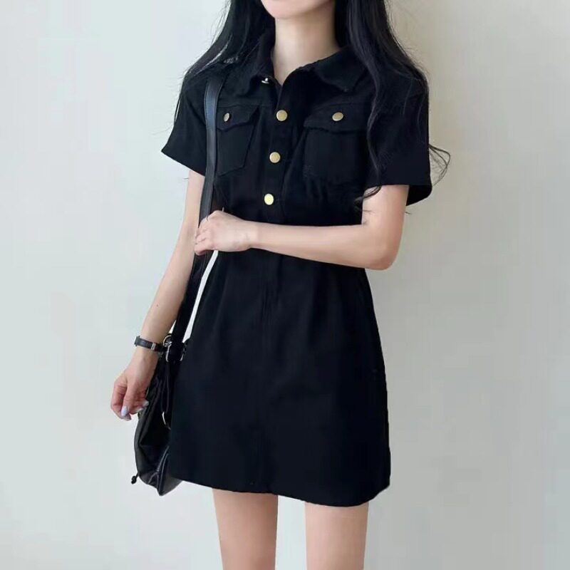 Летняя дизайнерская мини-юбка, металлическая юбка, джинсовое платье, в корейском стиле, в американском стиле, тренд сезона, воротник поло, по фигуре, короткий рукав