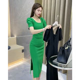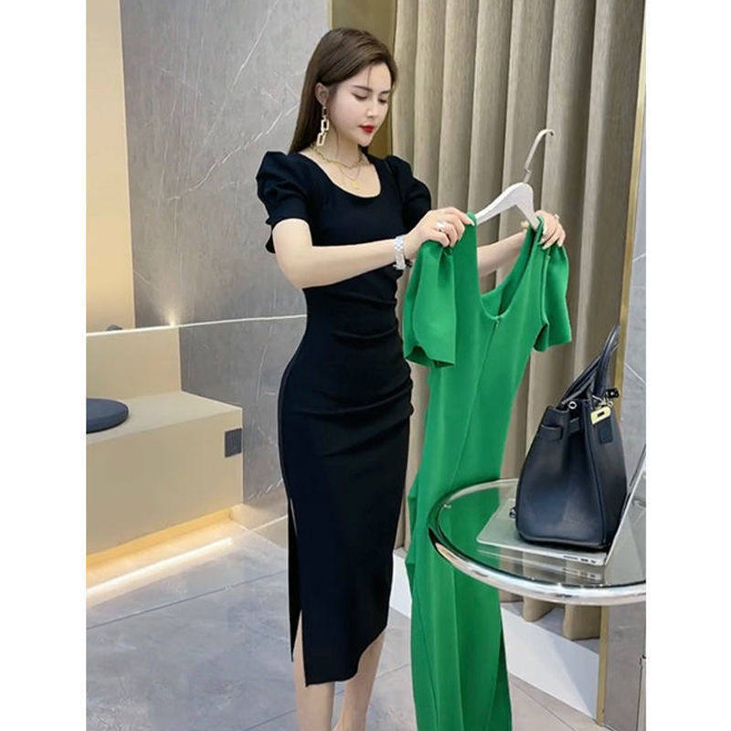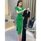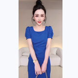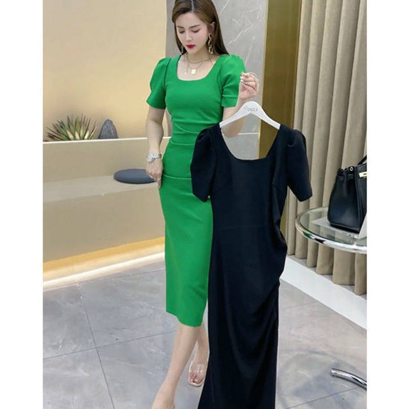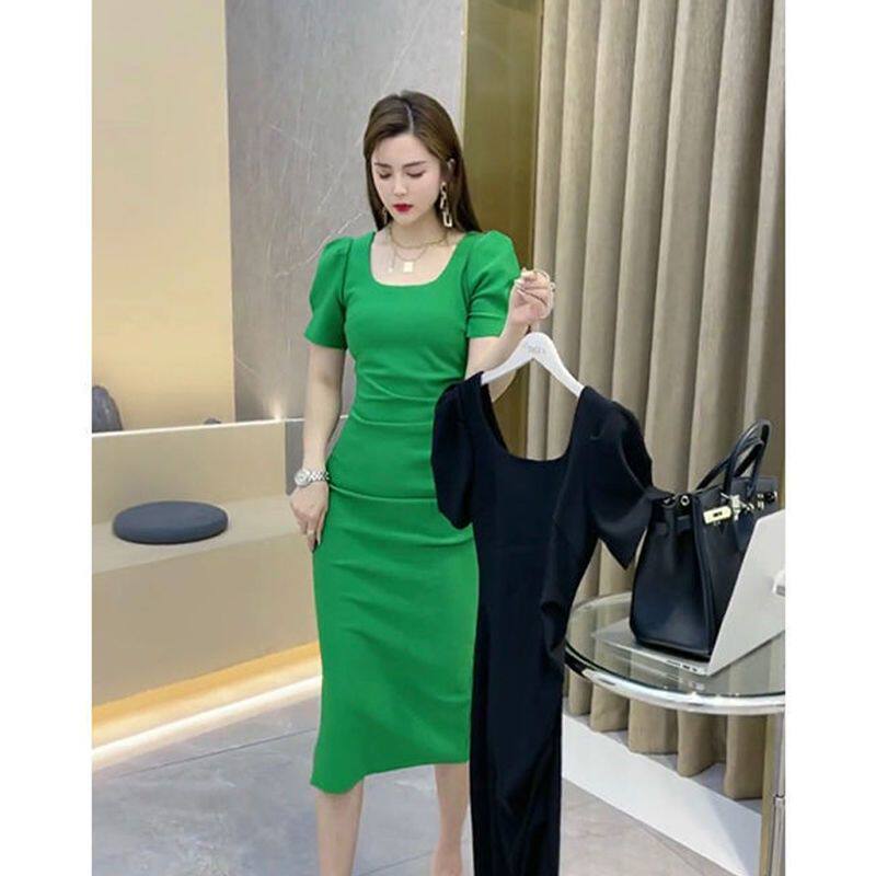 Модное летнее платье, популярно в интернете, городской стиль, квадратный вырез, рукава фонарики, по фигуре, с акцентом на бедрах