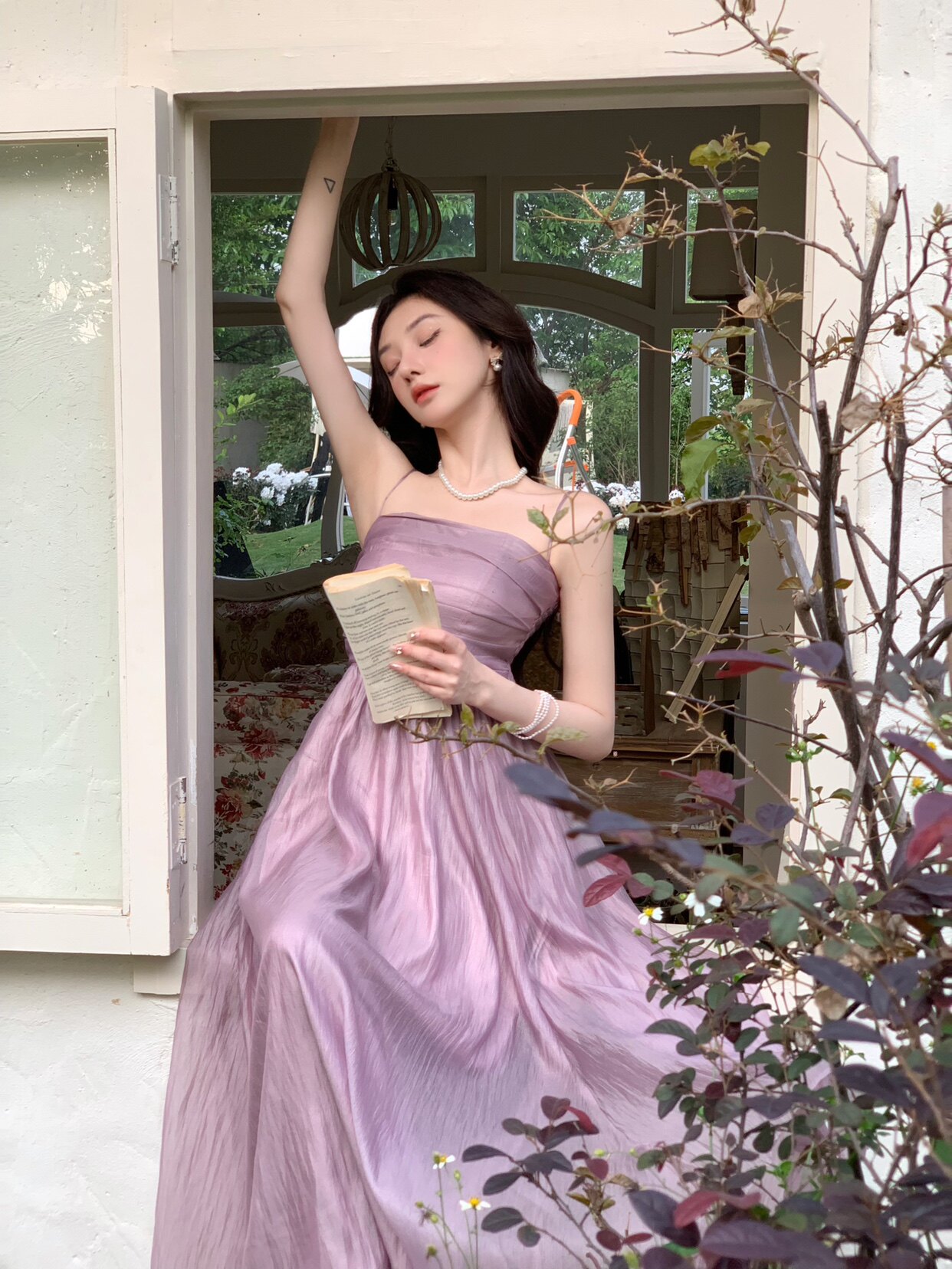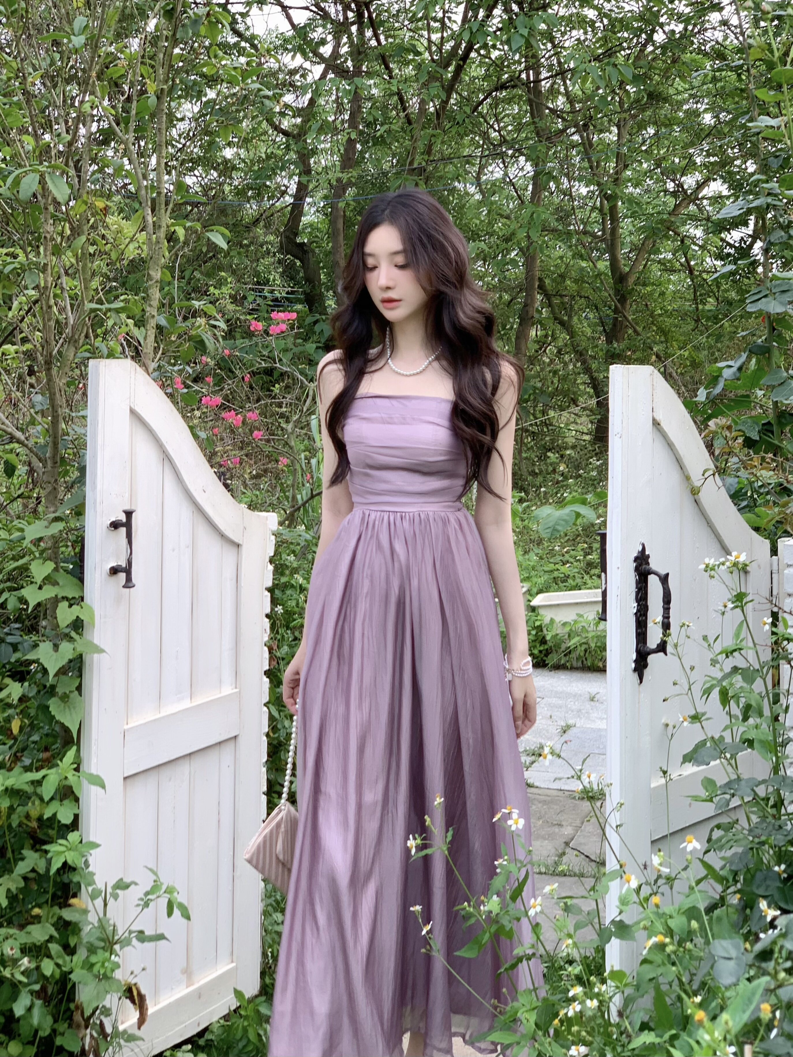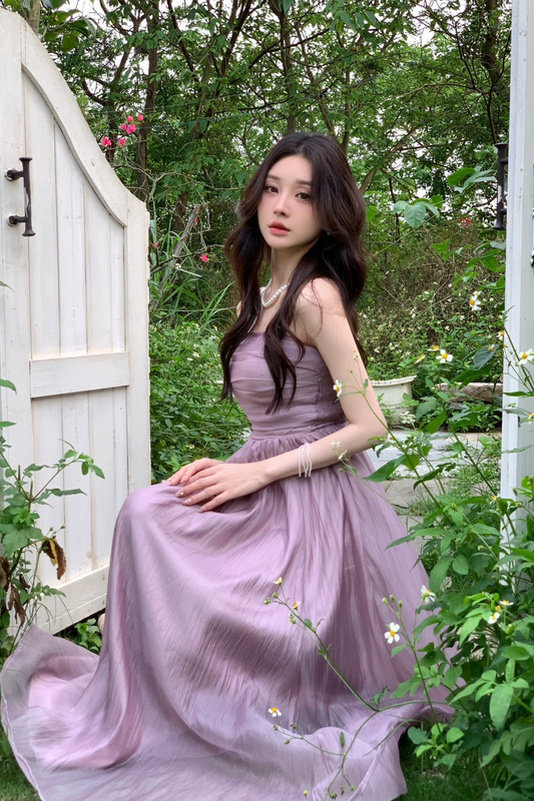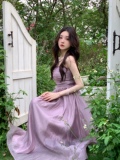 Сиреневое платье без рукавов, цветной приталенный корсет, длинная юбка, высокая талия