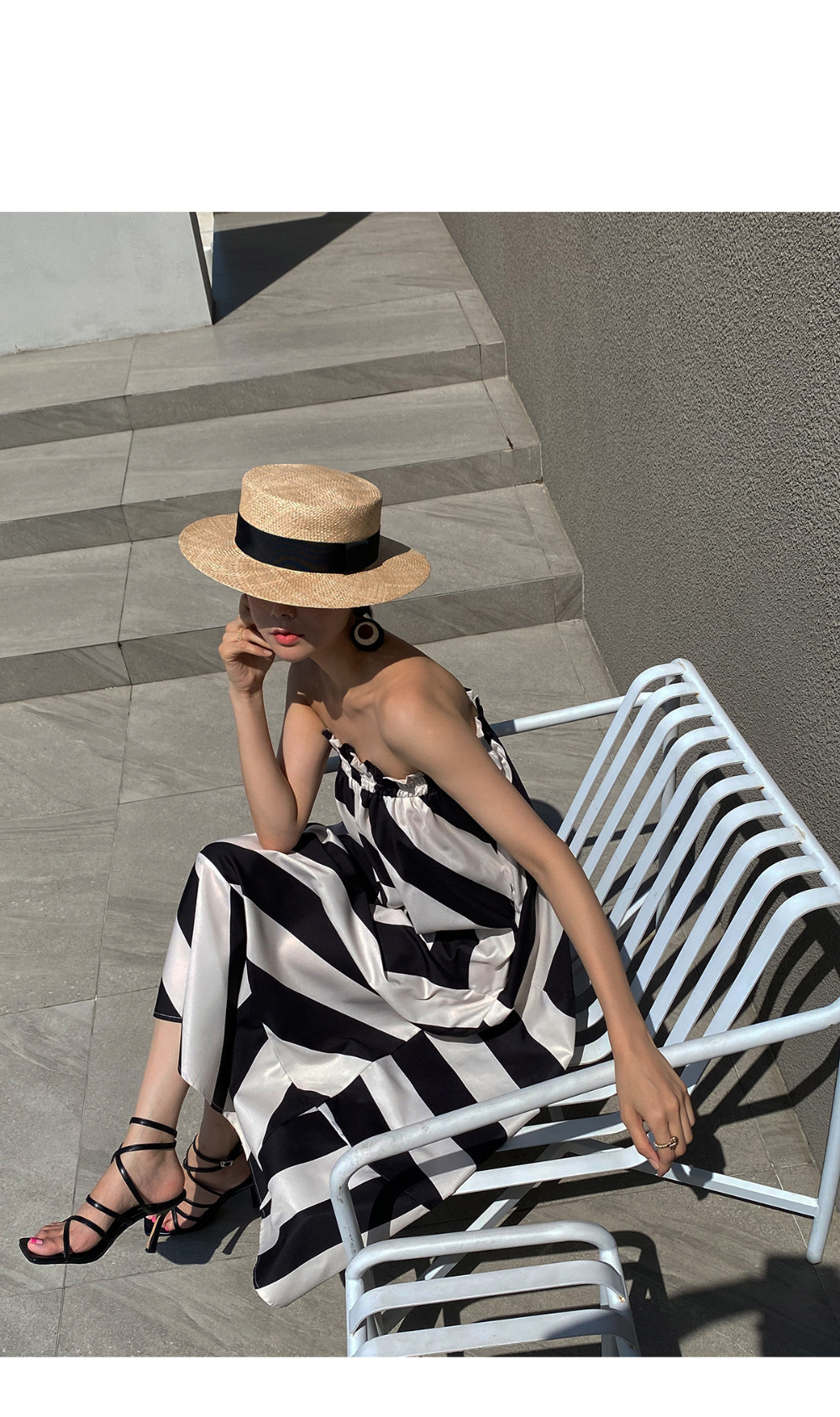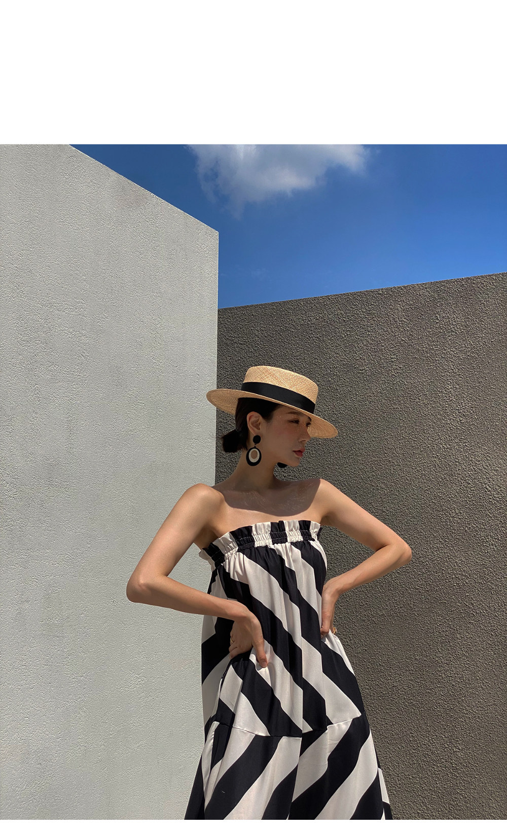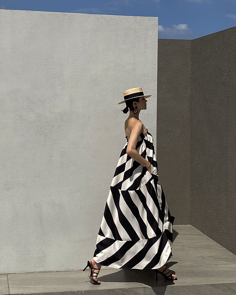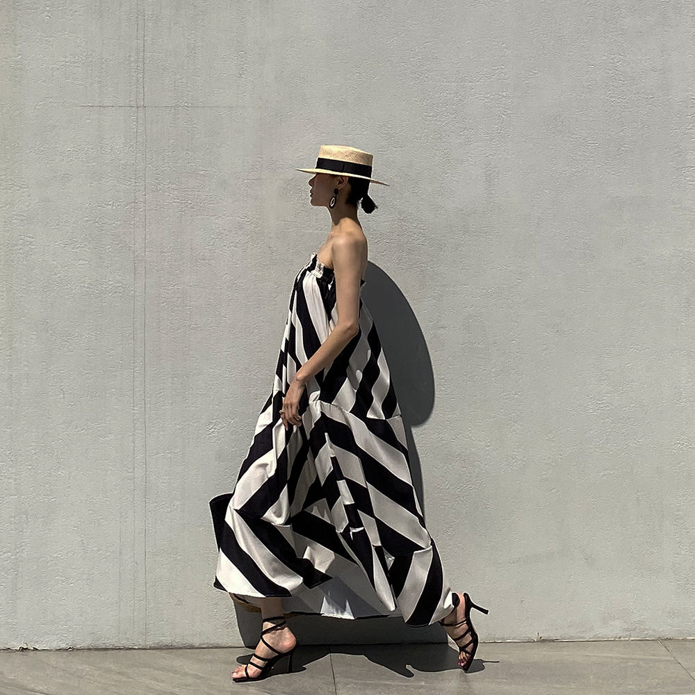 Корейская мода, летняя французская курортная стильная юбка с открытыми плечами и контрастным геометрическим узором, свободная повседневная юбка-топ для женщин