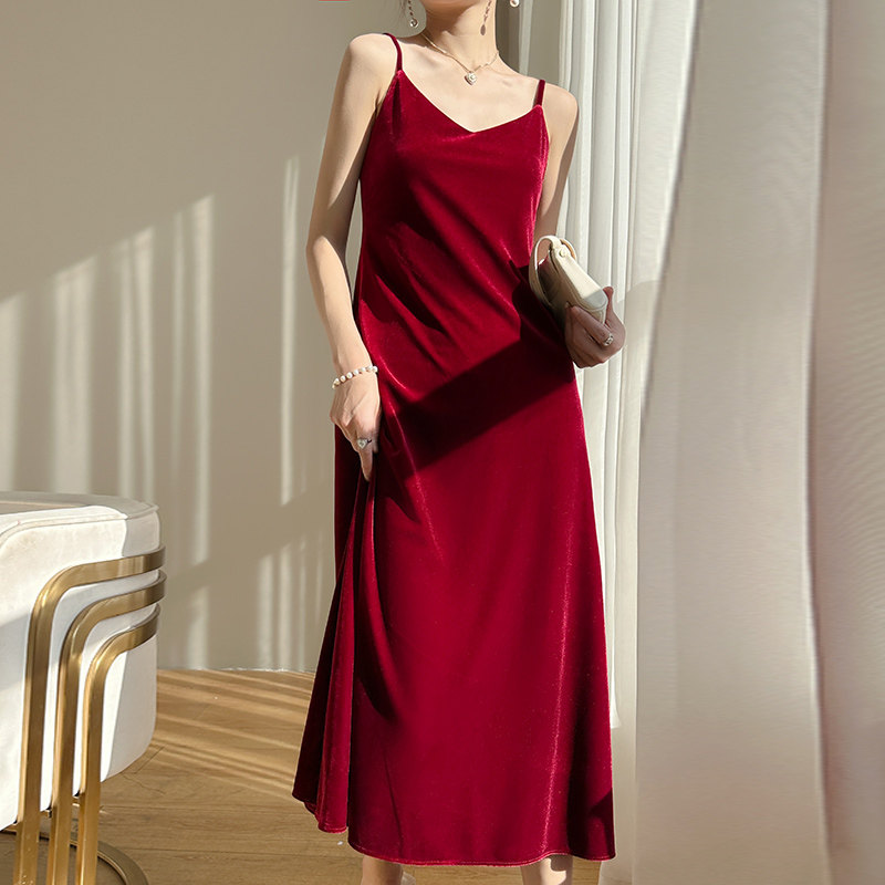 Бархатное платье-комбинация, однотонная длинная юбка, французский стиль, V-образный вырез, средней длины, А-силуэт, изысканный стиль
