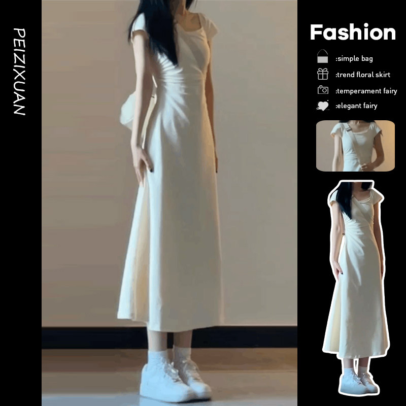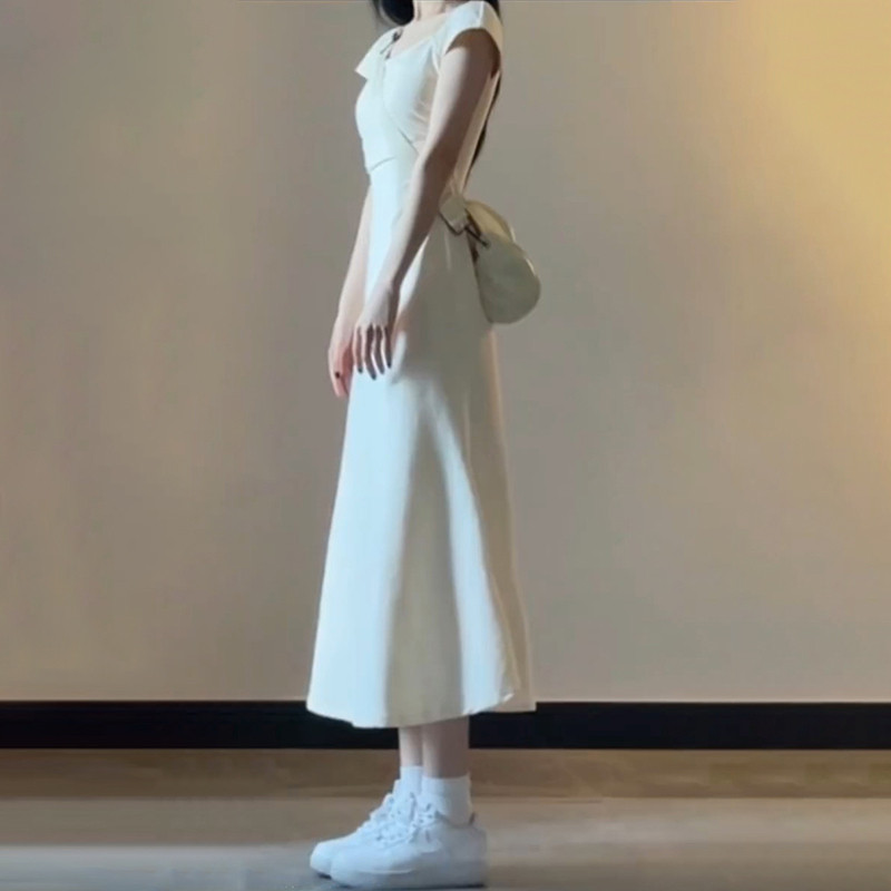 Белое летнее платье с коротким рукавом, длинная юбка, квадратный вырез, французский стиль, с акцентом на бедрах