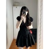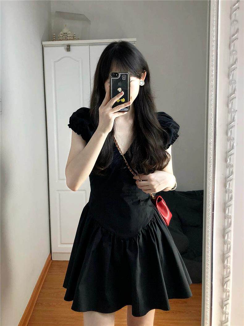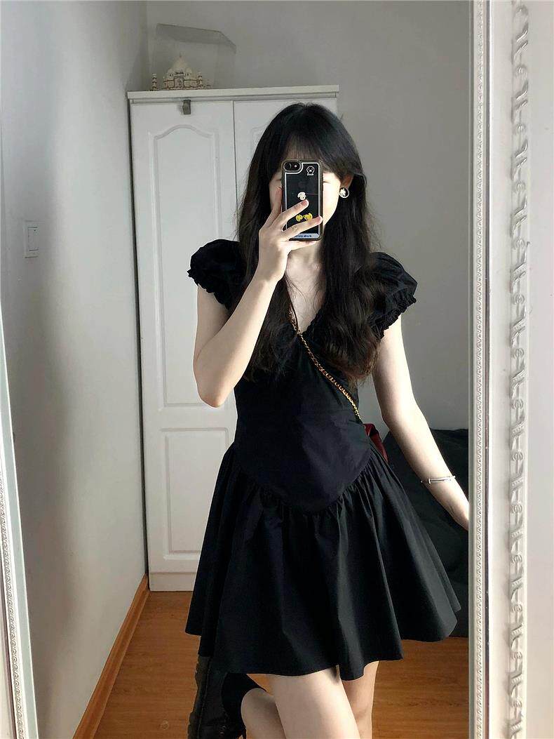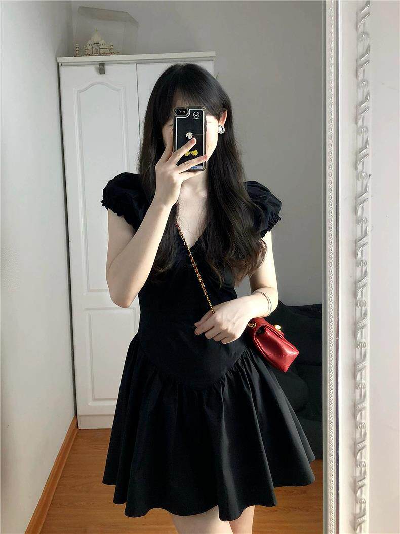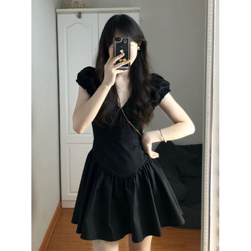 Черная летняя юбка, короткая мини-юбка, V-образный вырез, французский стиль, изысканный стиль, яркий броский стиль, по фигуре, подходит для подростков