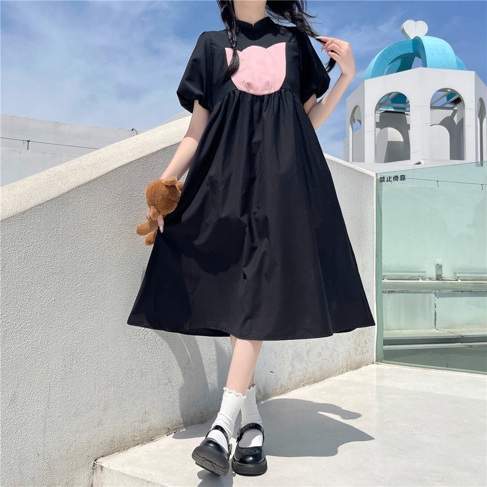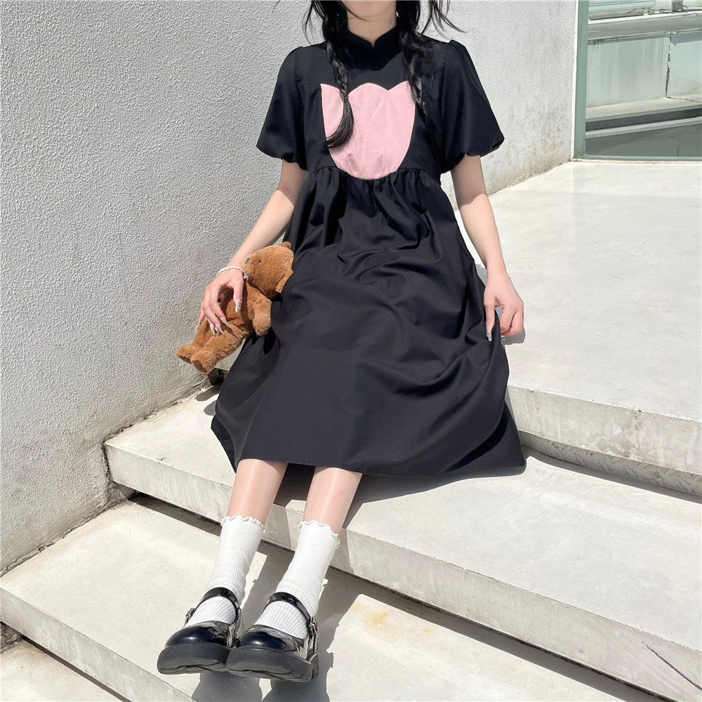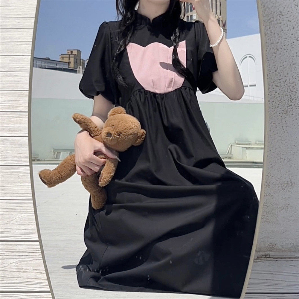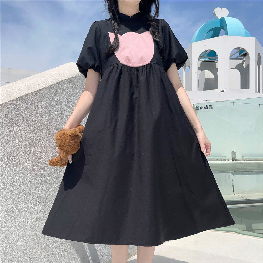 Японское милое приталенное ретро платье с коротким рукавом, длинная юбка, средней длины