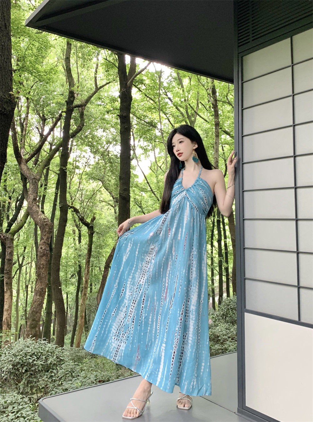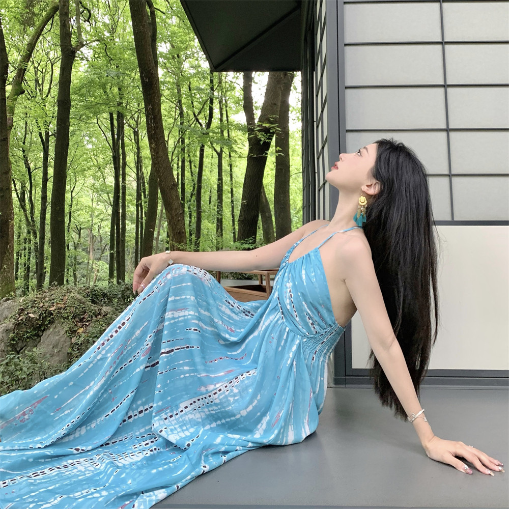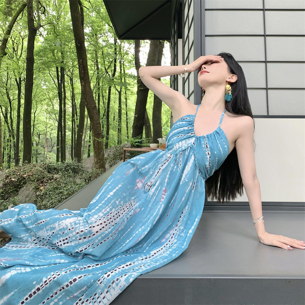 Ретро синее платье, длинная юбка, стиль бохо, с открытой спиной