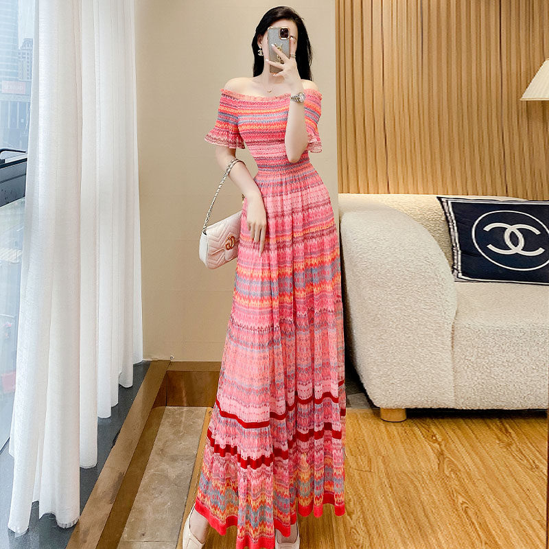 Летняя шифоновая длинная юбка, открытые плечи, стиль бохо