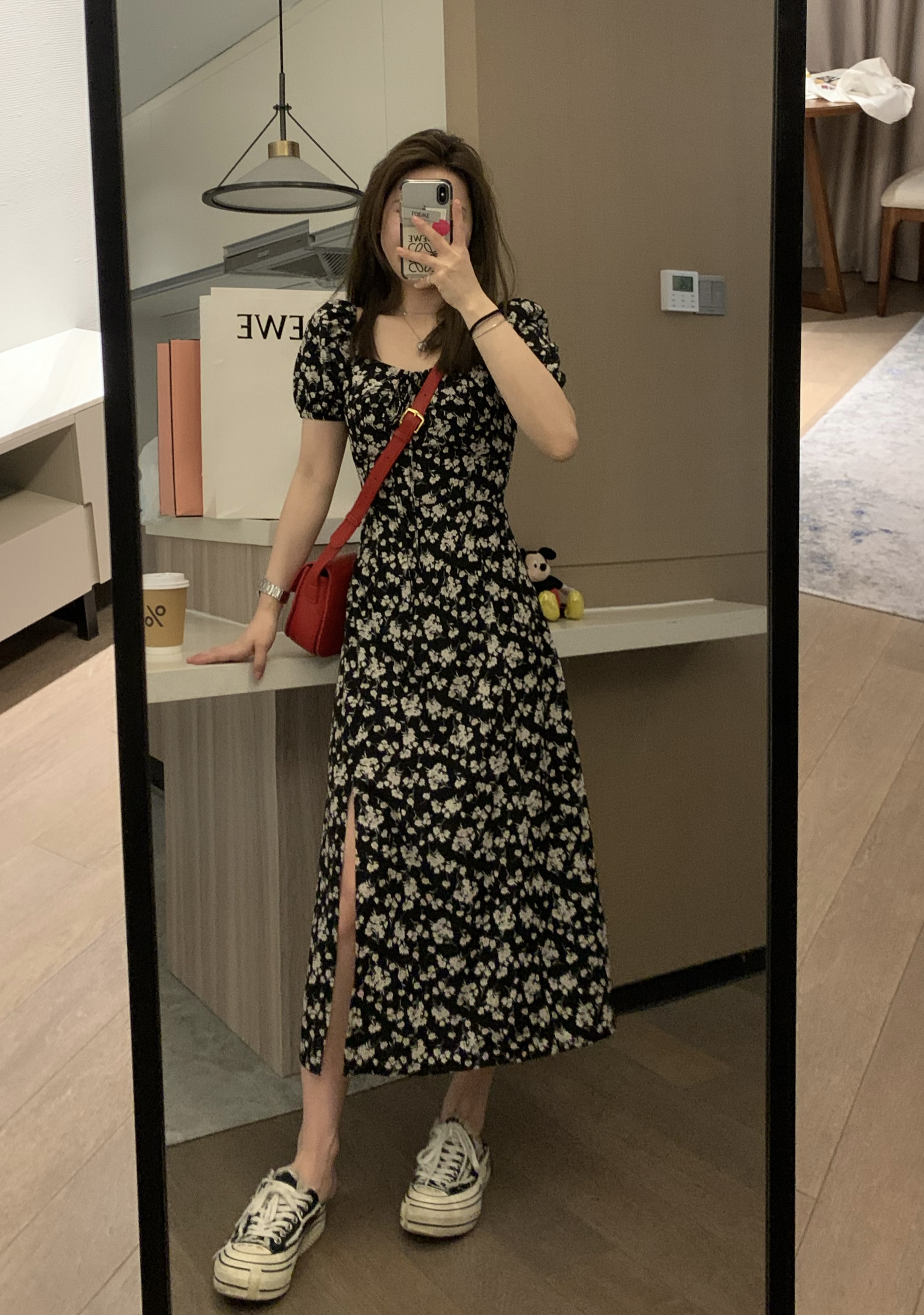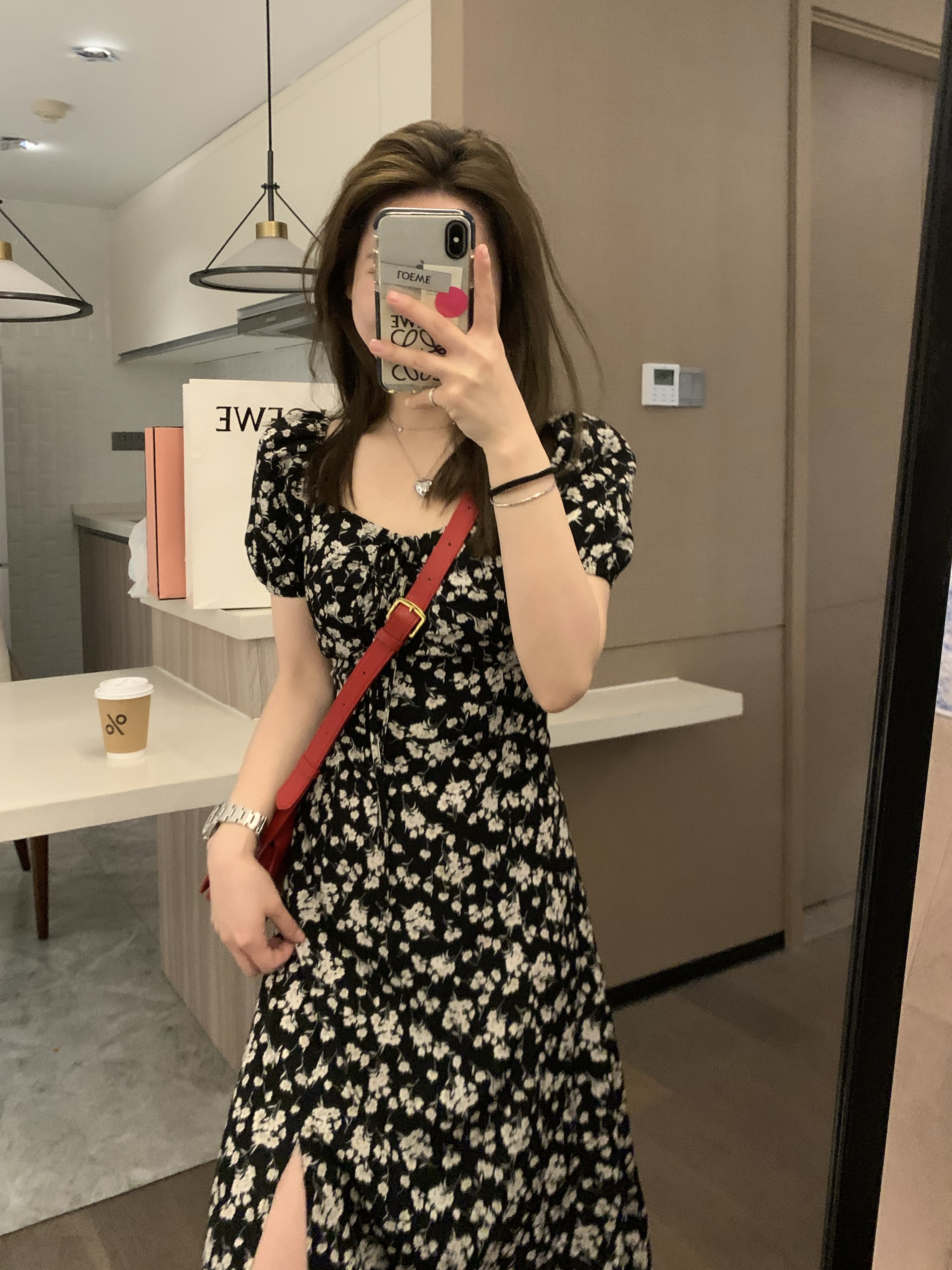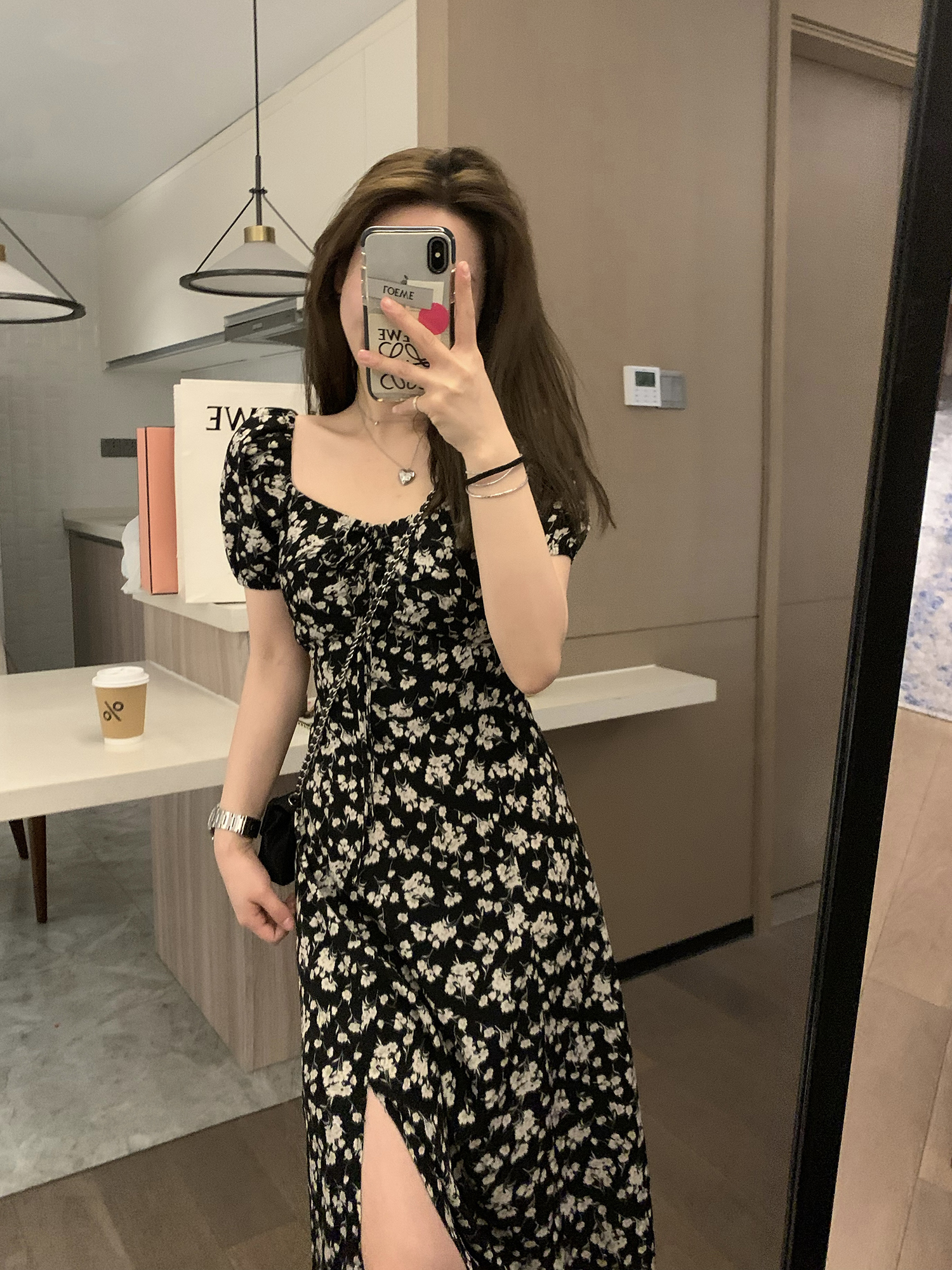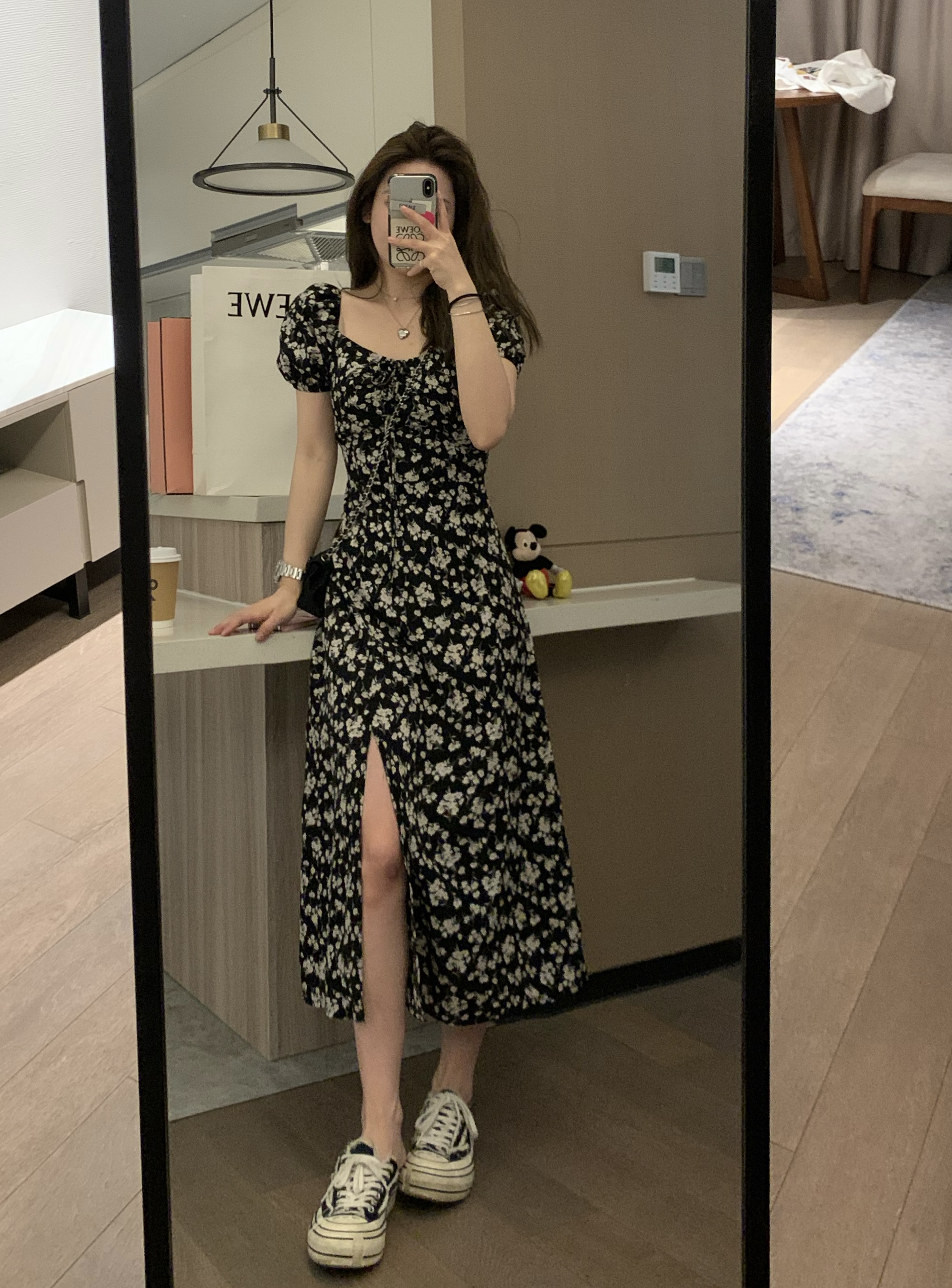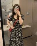 Черное летнее платье, длинная юбка, цветочный принт, по фигуре, рукава фонарики, французский стиль, квадратный вырез