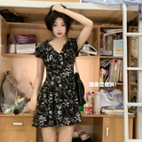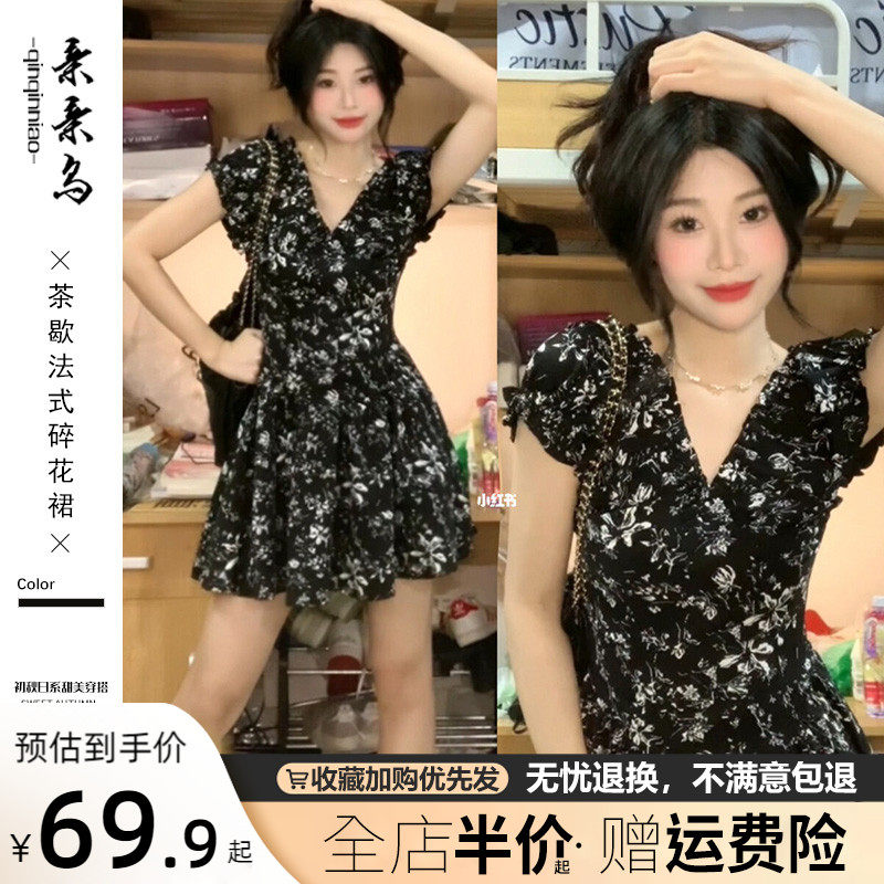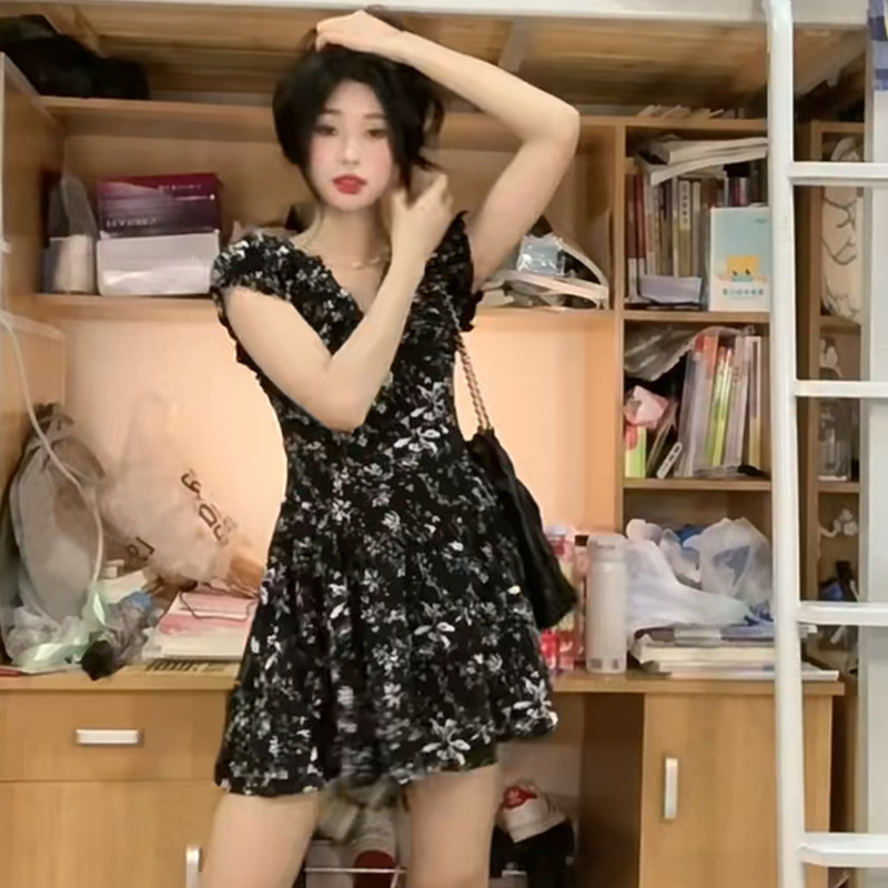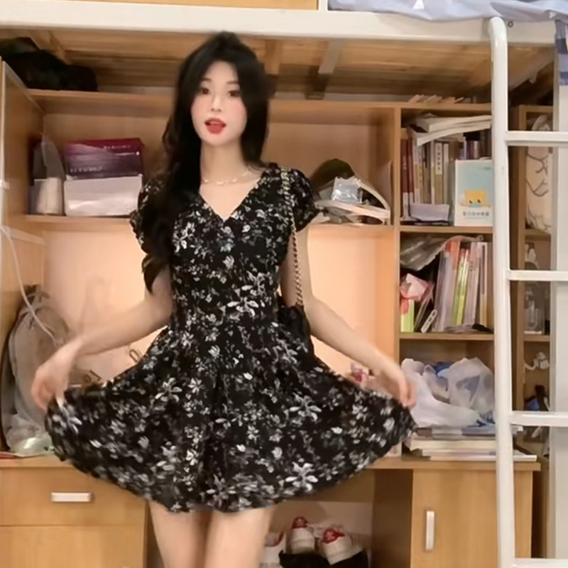 Черное летнее платье, приталенный корсет, мини-юбка, французский стиль, V-образный вырез, А-силуэт