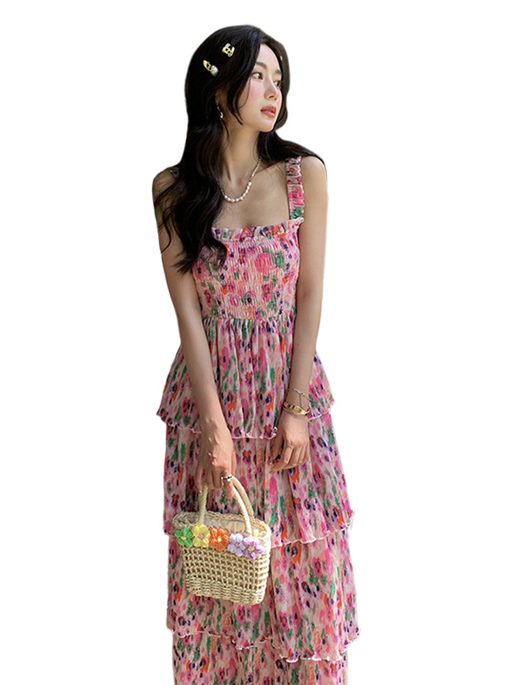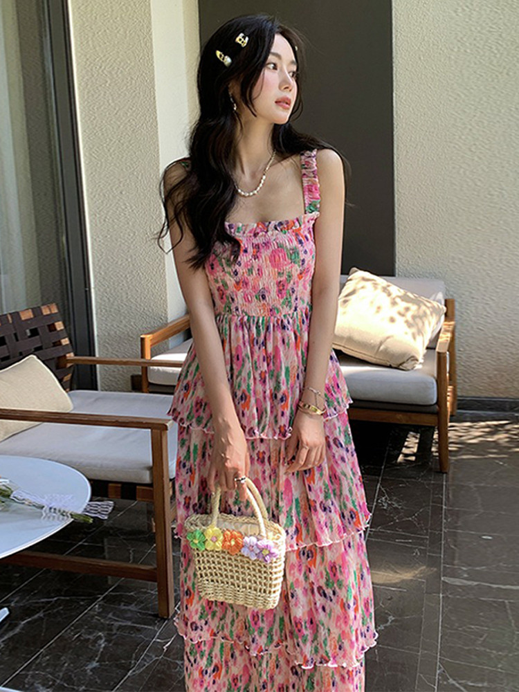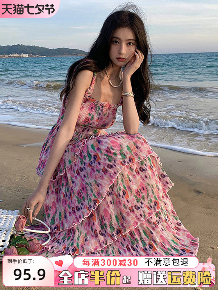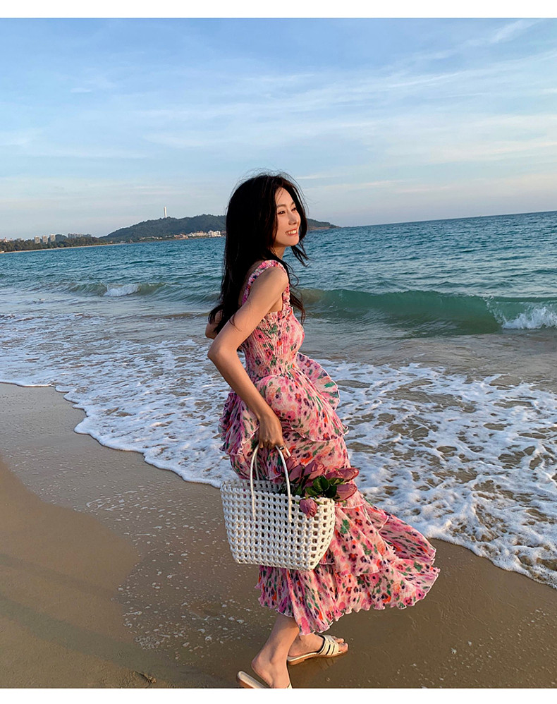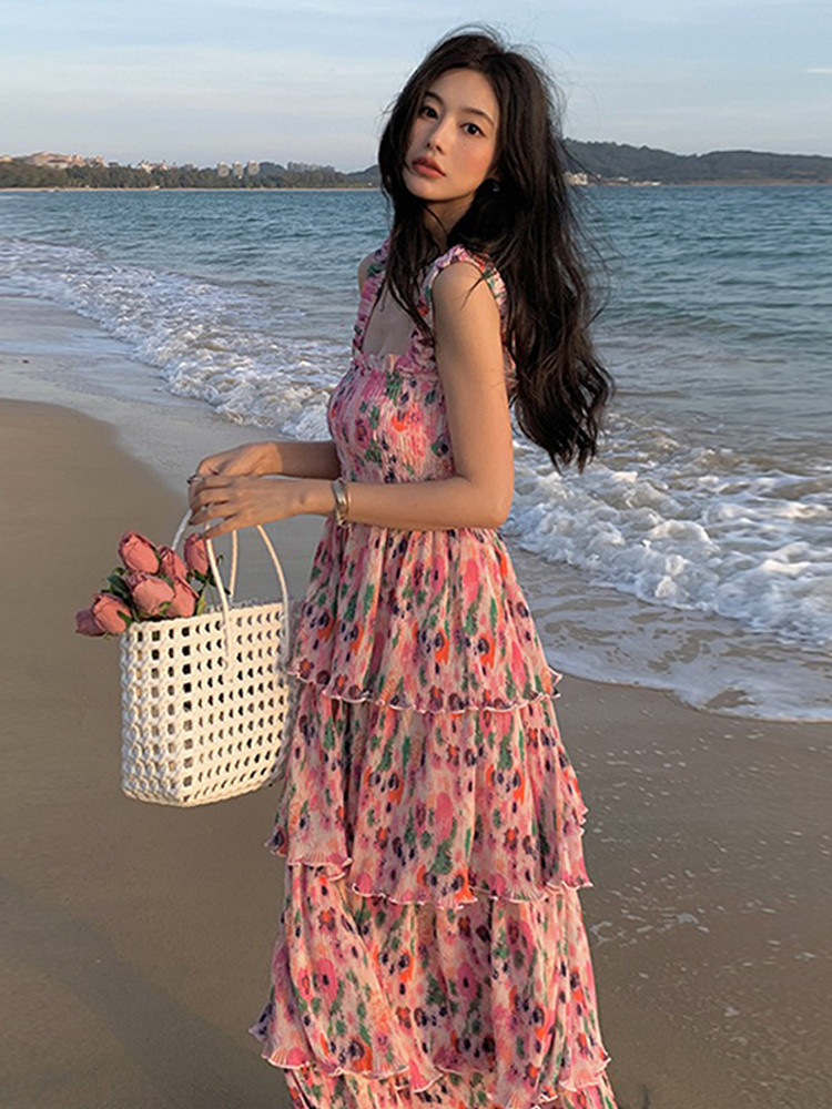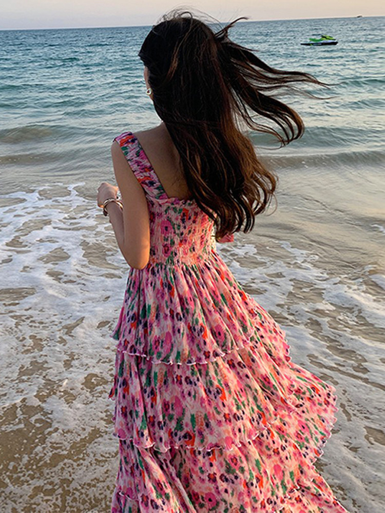 Пляжное розово-фиолетовое сиреневое летнее платье без рукавов, длинная юбка, цветочный принт