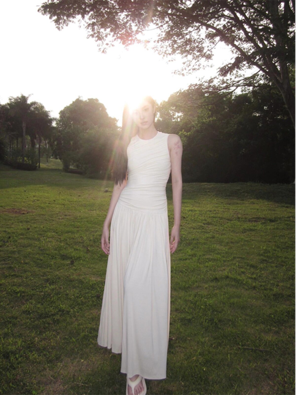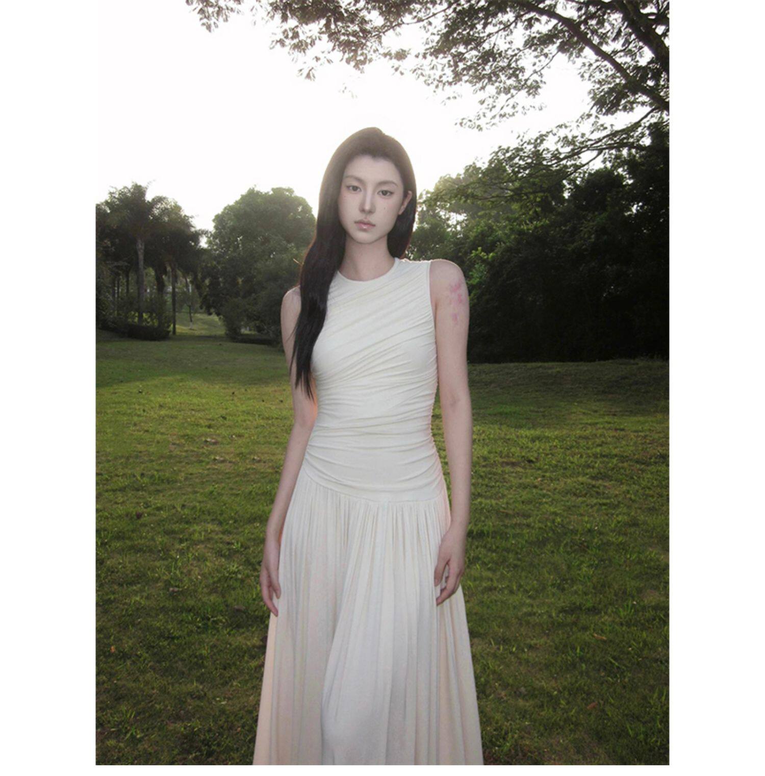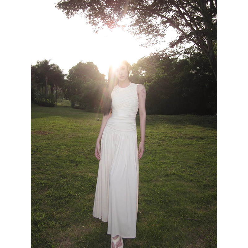 Летняя белая юбка в складку, приталенная длинная юбка без рукавов, французский стиль