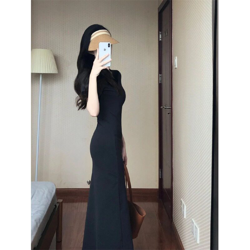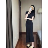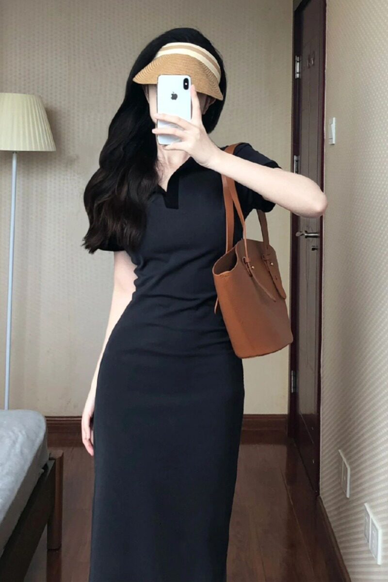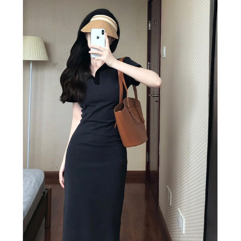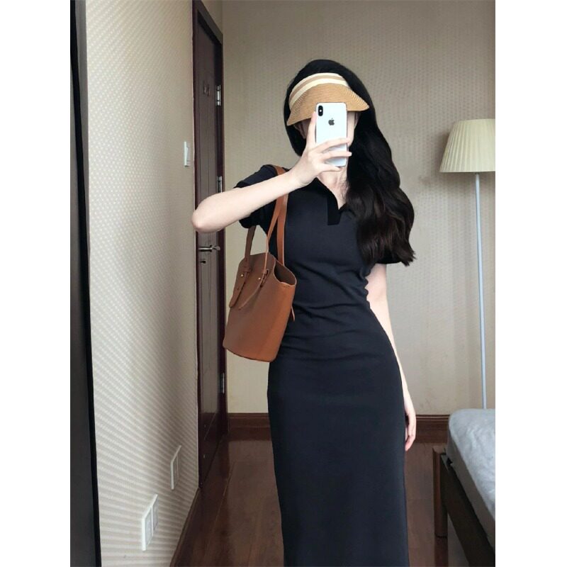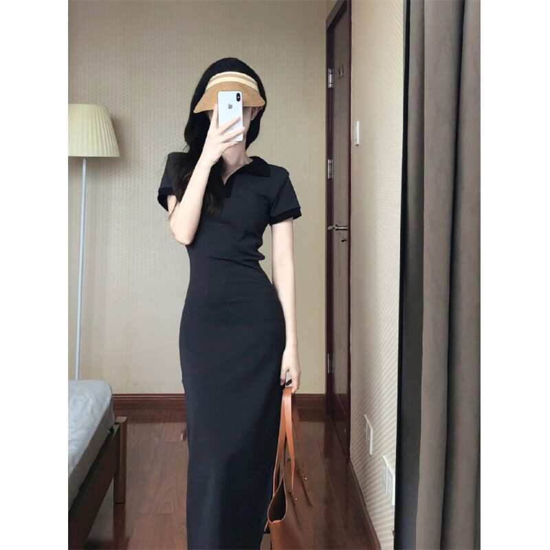 Футболка, сексуальное платье, приталенный корсет, длинная юбка, французский стиль, воротник поло, с акцентом на бедрах, короткий рукав