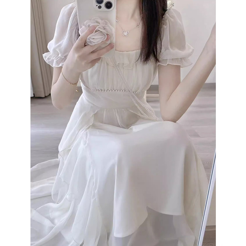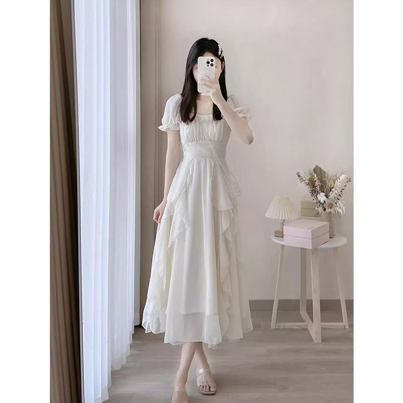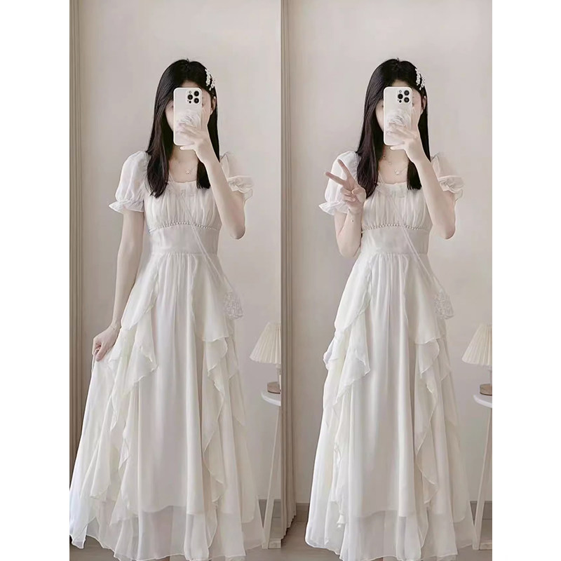 Японское летнее белое платье, длинная юбка, квадратный вырез, изысканный стиль