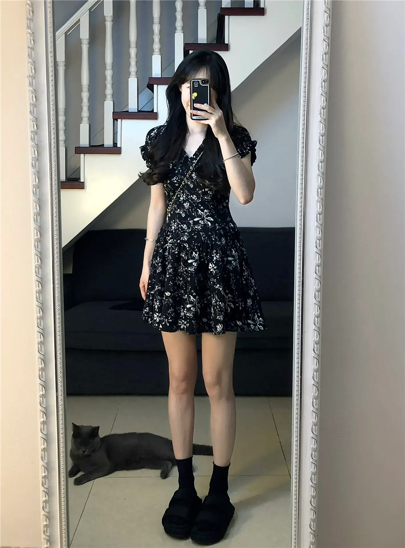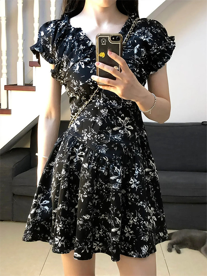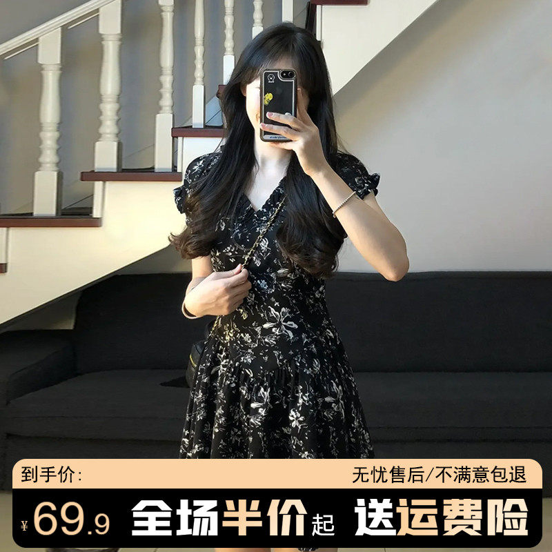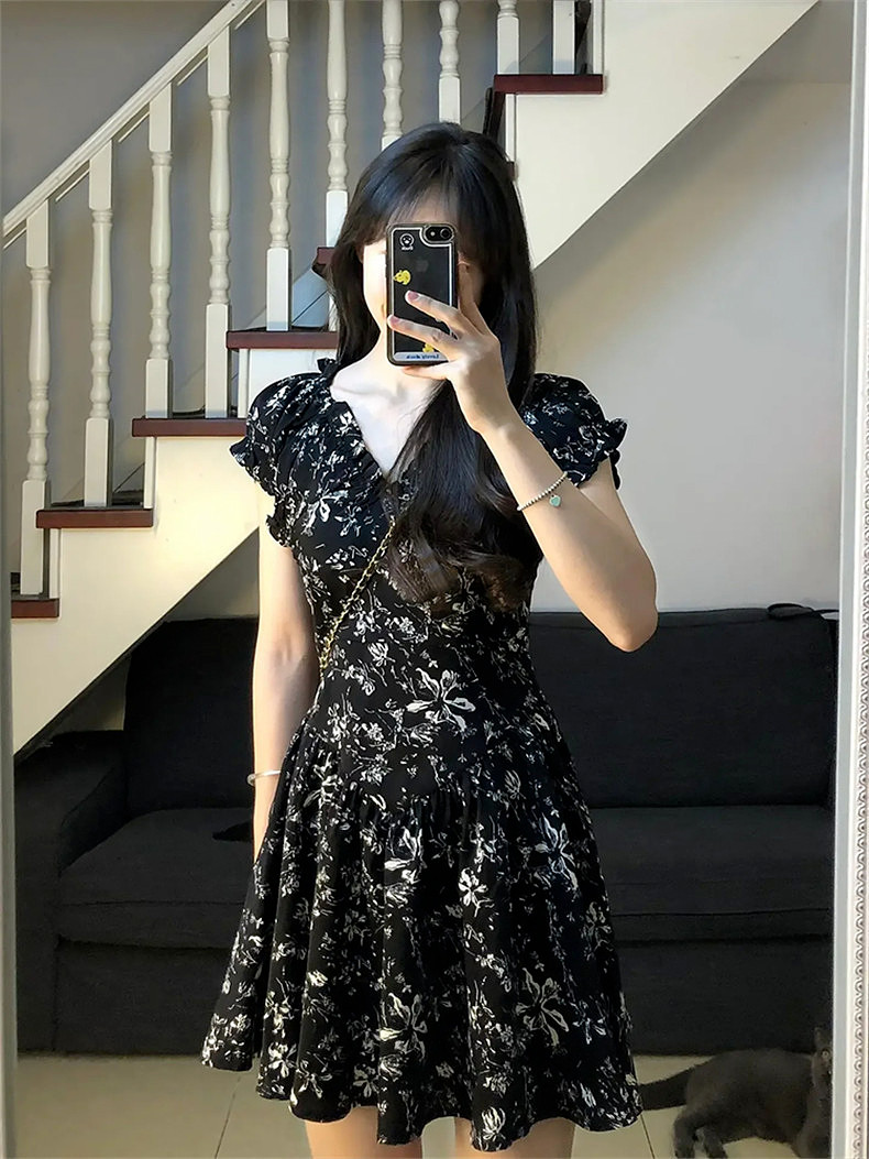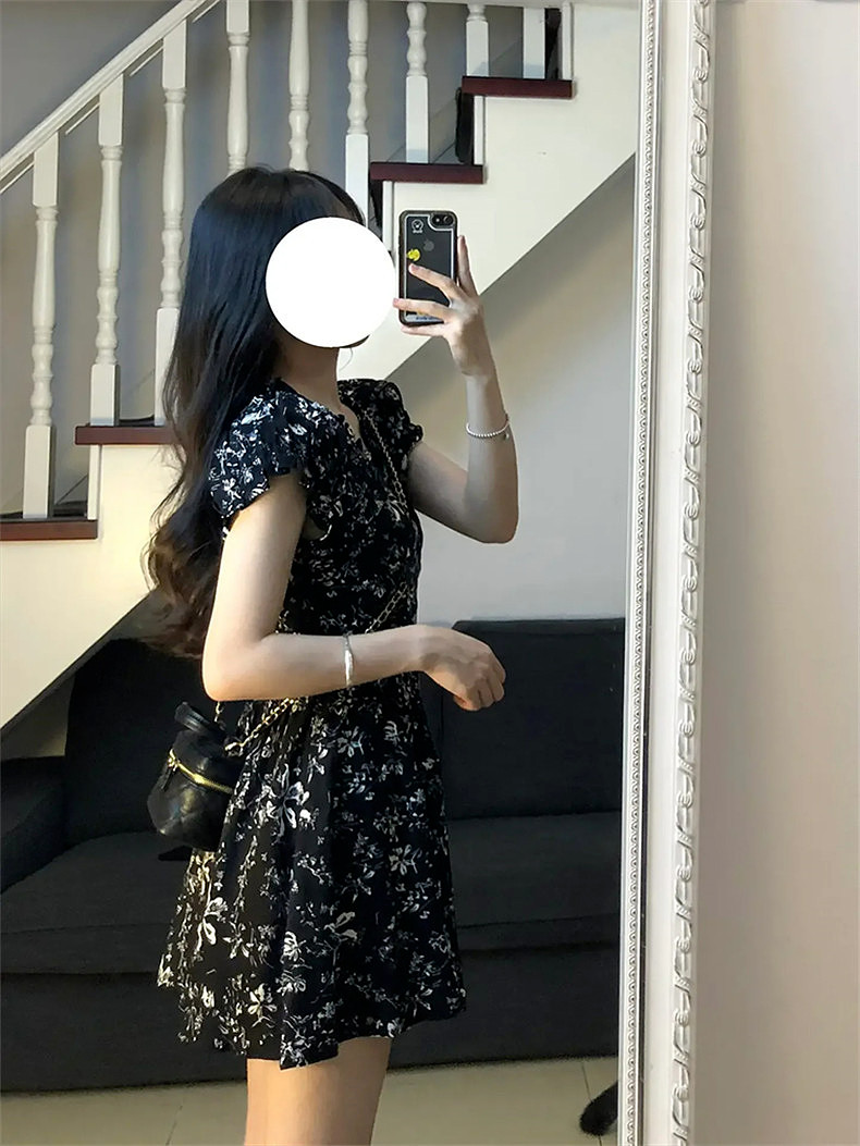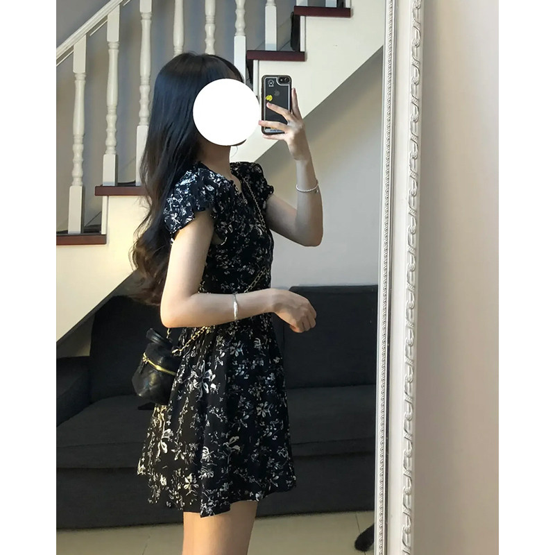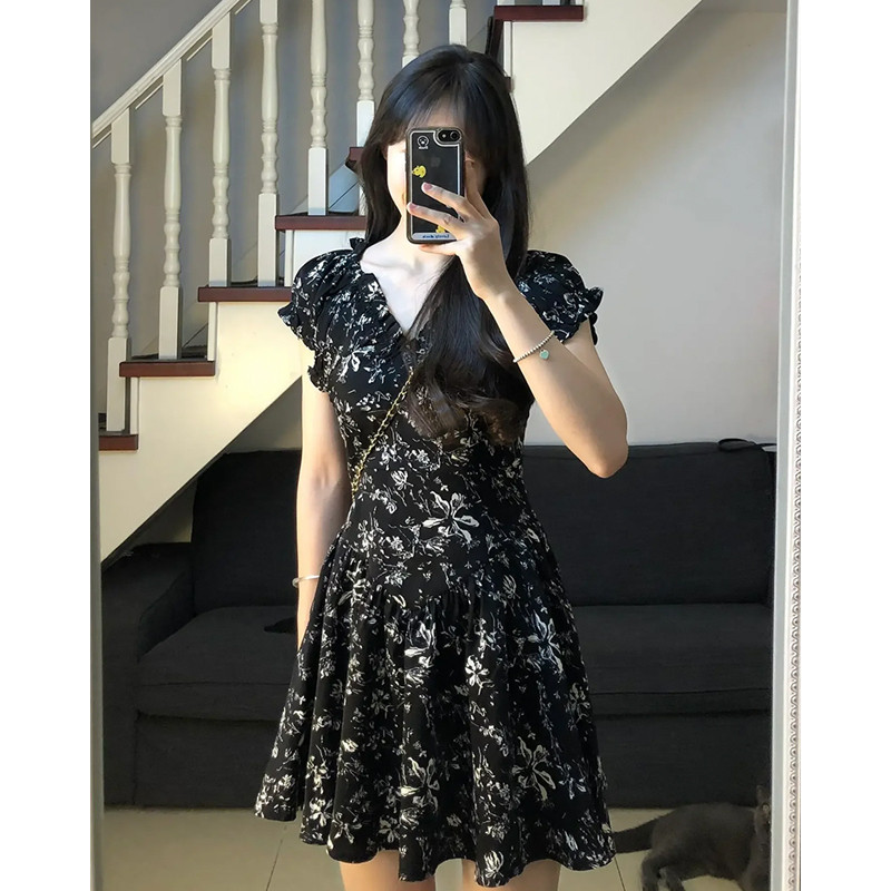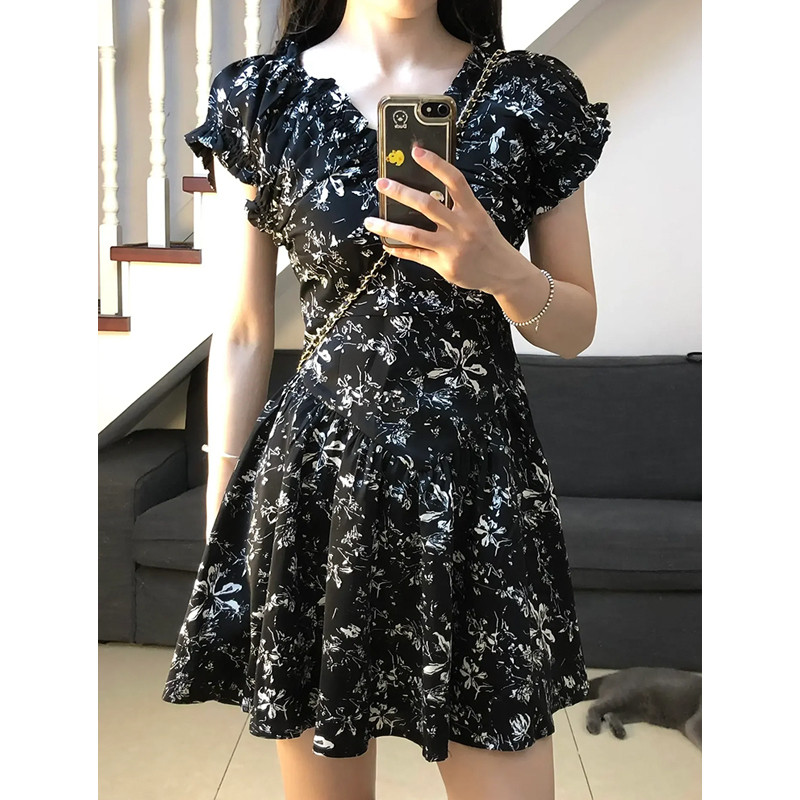 Черное летнее платье, мини-юбка, юбка, коллекция 2023, французский стиль, в цветочек, подходит для подростков