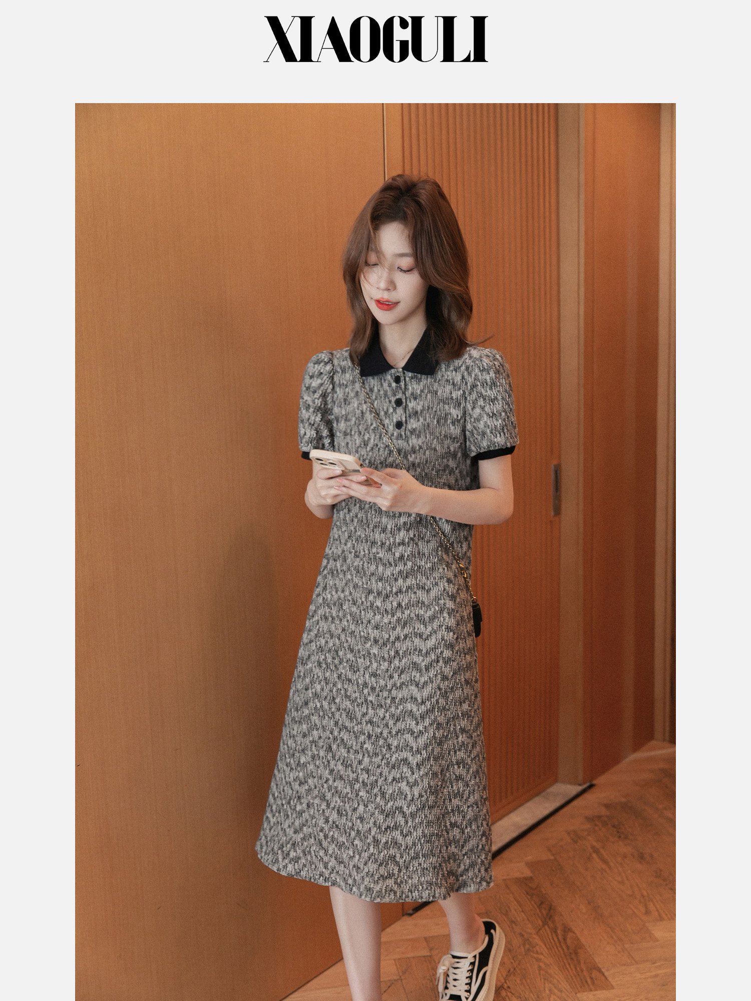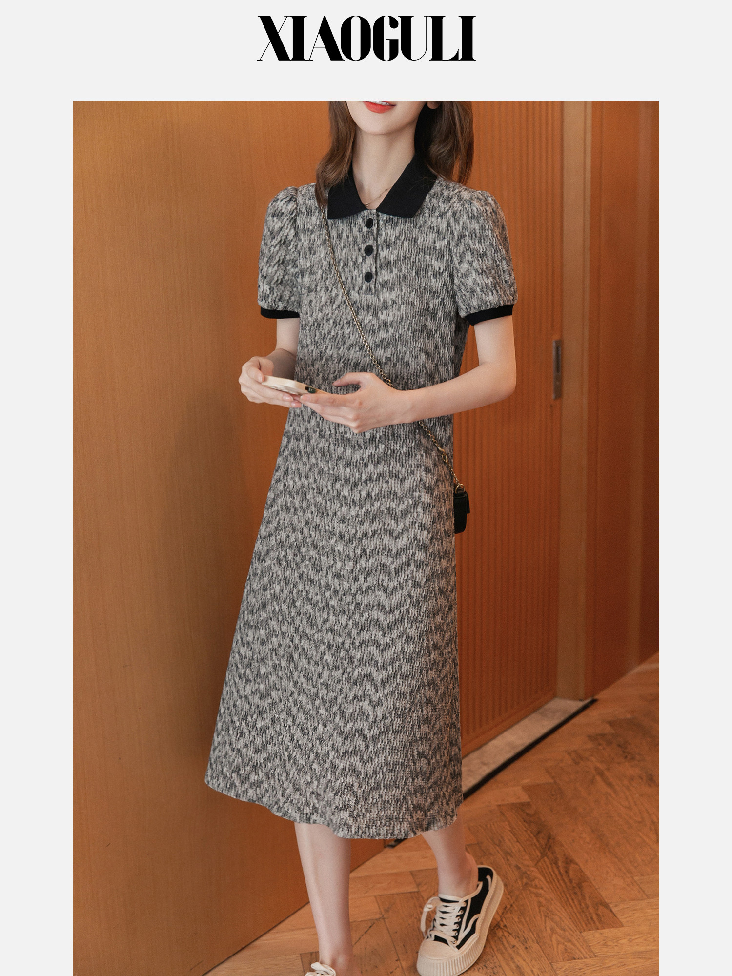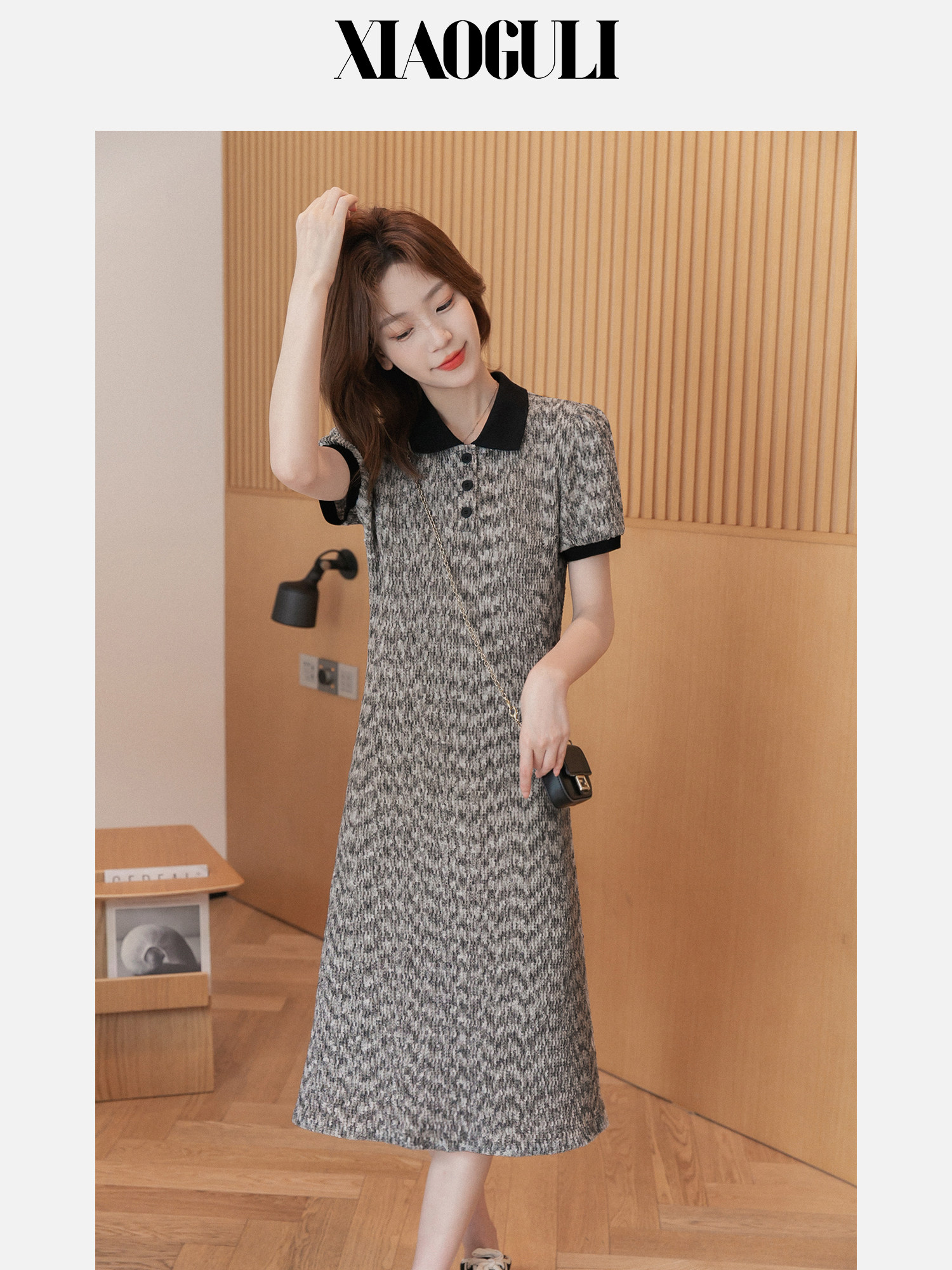 小谷粒 Трикотажное летнее трикотажное платье, небольшой приталенный корсет, длинная юбка, в стиле Шанель, воротник поло