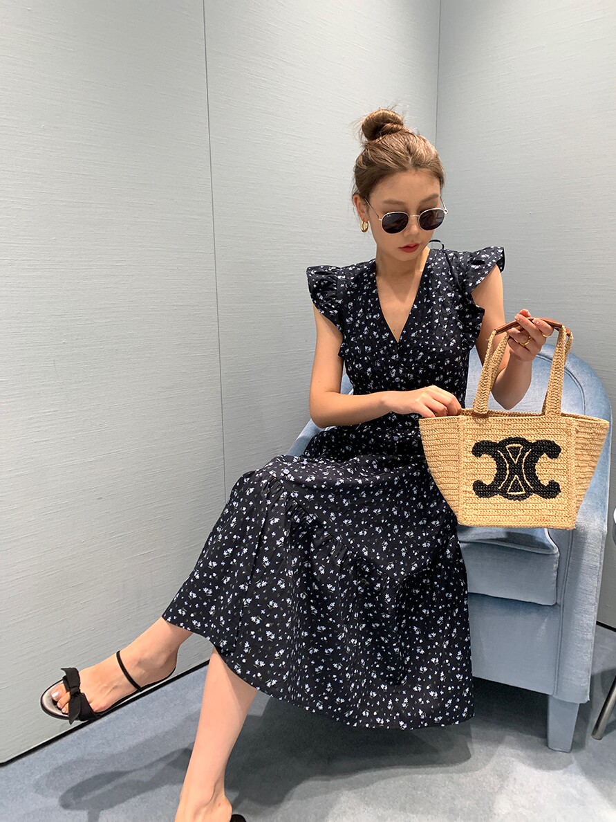 Длинное платье, короткая юбка, из ворсистого хлопка, V-образный вырез, в цветочек