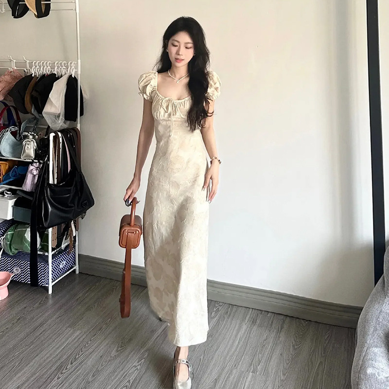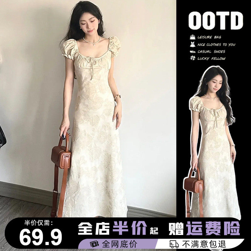 Летнее платье, небольшая дизайнерская длинная юбка, французский стиль, квадратный вырез, в цветочек